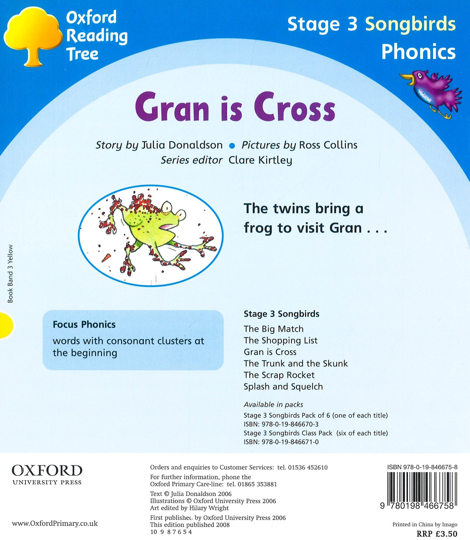Songbirds Phonics combines real phonic stories with interactive whiteboard software to deliver the requirements for high-quality phonics teaching resources. Written by award-winning Julia Donaldson, these stories provide fun, fully decodable texts with built-in progression help your pupils achieve immediate reading success. They are fully in line with the 2006 Framework and the simple view of reading. Books contain inside cover notes to support children in their reading. Help with childrens reading development is also available at www.oxfordowl.co.uk. This book is also available as part of a mixed pack of 6 different books or a class pack of 36 books of the same ORT level. The books are complemented by eSongbirds interactive whiteboard software which offers a systematic, quality phonics teaching through a multi-sensory approach.