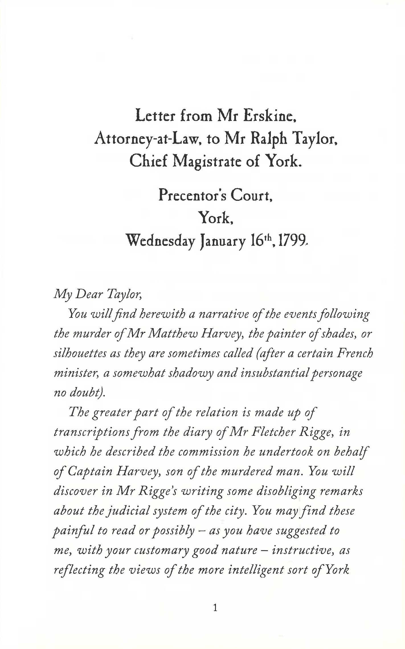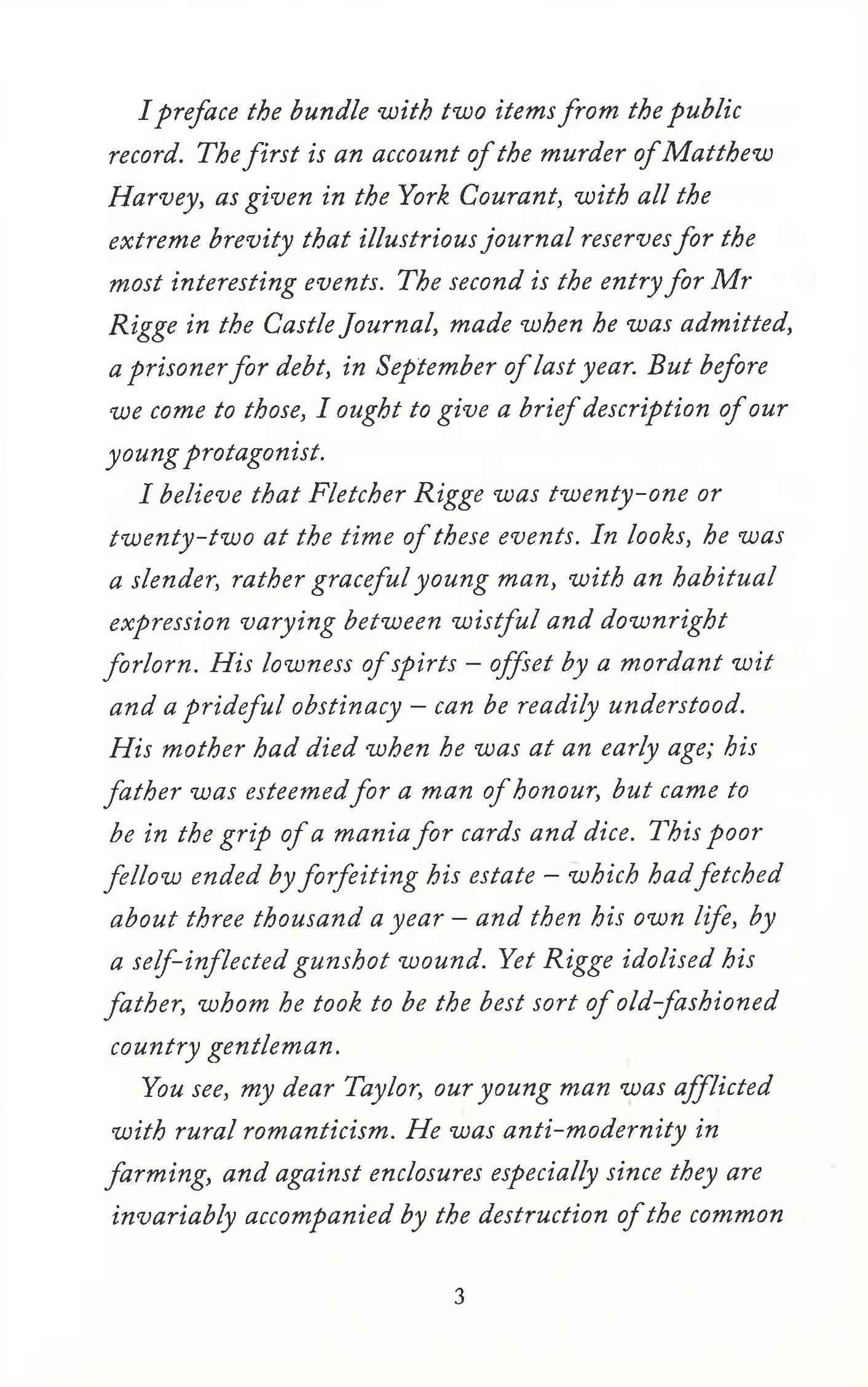Later, in November, a clever but impoverished young gentleman called Fletcher Rigge languishes in the debtor's prison, until a letter arrives containing a bizarre proposition from the son of the murdered man. Rigge is to be released for one month, but in that time, he must find the killer. If he fails, he will be incarcerated again, possibly for life.