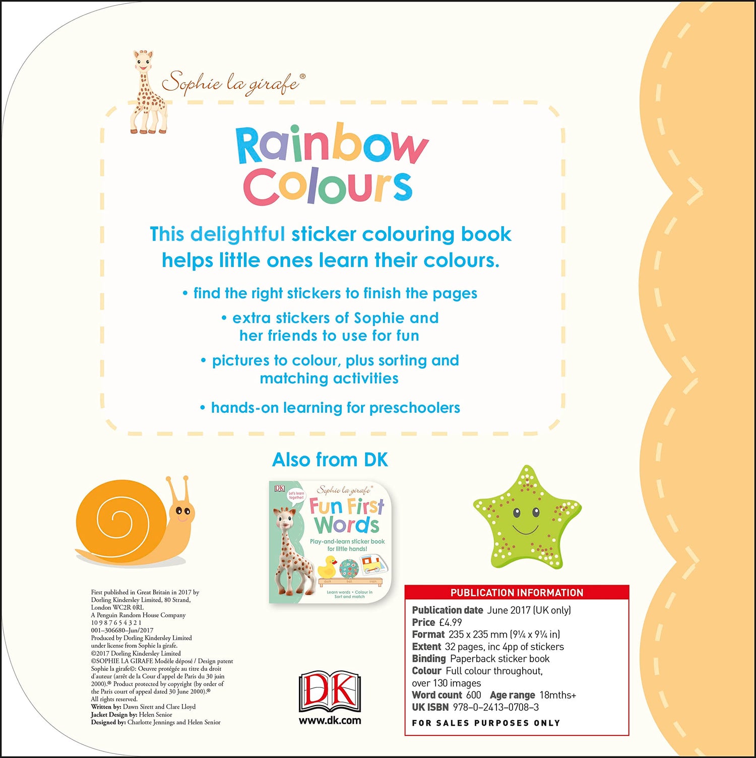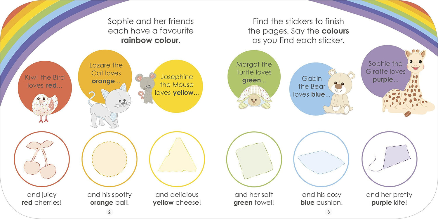 Toddlers will love the hands-on, early-learning activities in this new Sophie la Giraffe sticker book. Little ones can colour in pages, sort and match, and find lots of stickers! Preschoolers learn colours as they follow Sophie and her friends playing at home, having a picnic, out and about, painting in the art room, and more. In addition there are counting activities and shapes to spot and identify. A helpful Note for Parents explains how to use the book and encourage your little one to find the missing stickers, sort and match things, colour in pictures, and complete dot-to-dots and mazes. Learning with Sophie la Giraffe is lots of fun in Sophie's Big Rainbow Colours Sticker Book.