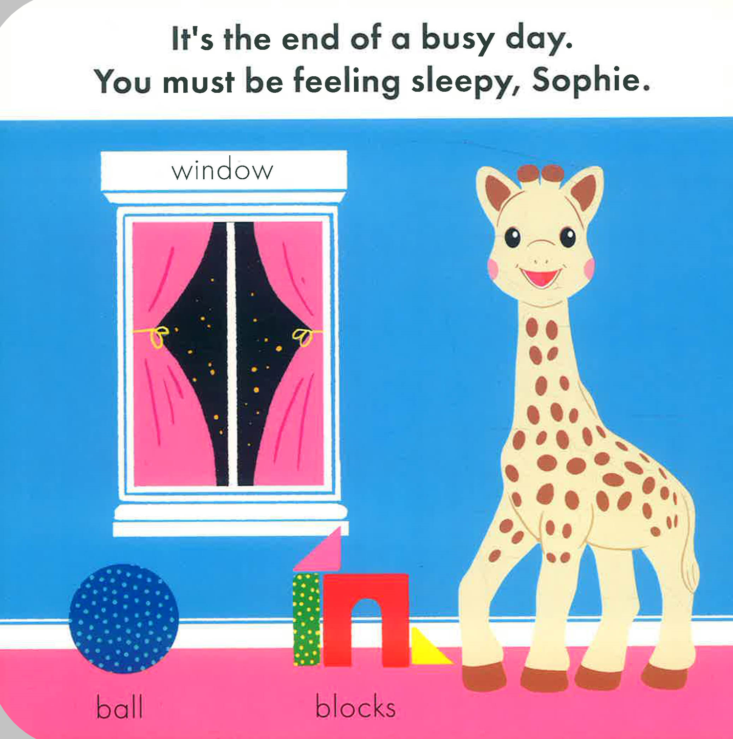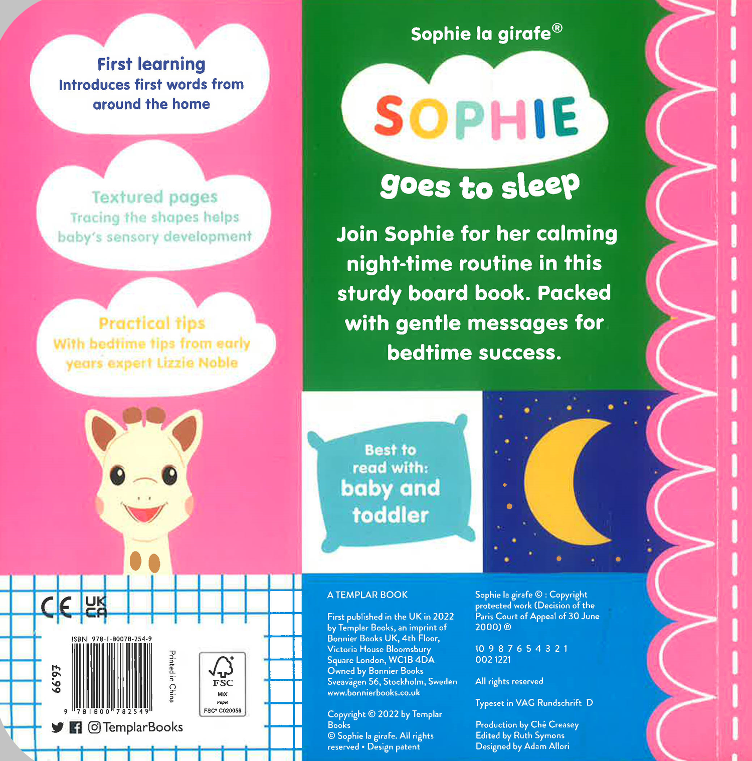 Wind down for the night with the classic Sophie la girafe toy, in this boardbook full of gentle messages for bedtime success. Sophie is getting ready to go to bed. Join her in her calming night-time routine for one last book before the lights go out. This short story is perfect for reading aloud with babies and toddlers. Each scene presents first words from around the home, making it the ideal book for little ones just starting to talk, while textured pages will engage even the youngest babies' senses. For parents and carers, each page features short practical tips for bedtime success, consulted by Early Years expert Lizzie Noble. Sophie la girafe has sold more than 50 million teether toys worldwide, and now the iconic toy from France turns 60. Celebrate with Sophie as she steps into the pages of a brand new series of baby books. Designed for reading together with your baby or toddler, this would also make the perfect baby shower or new baby gift.