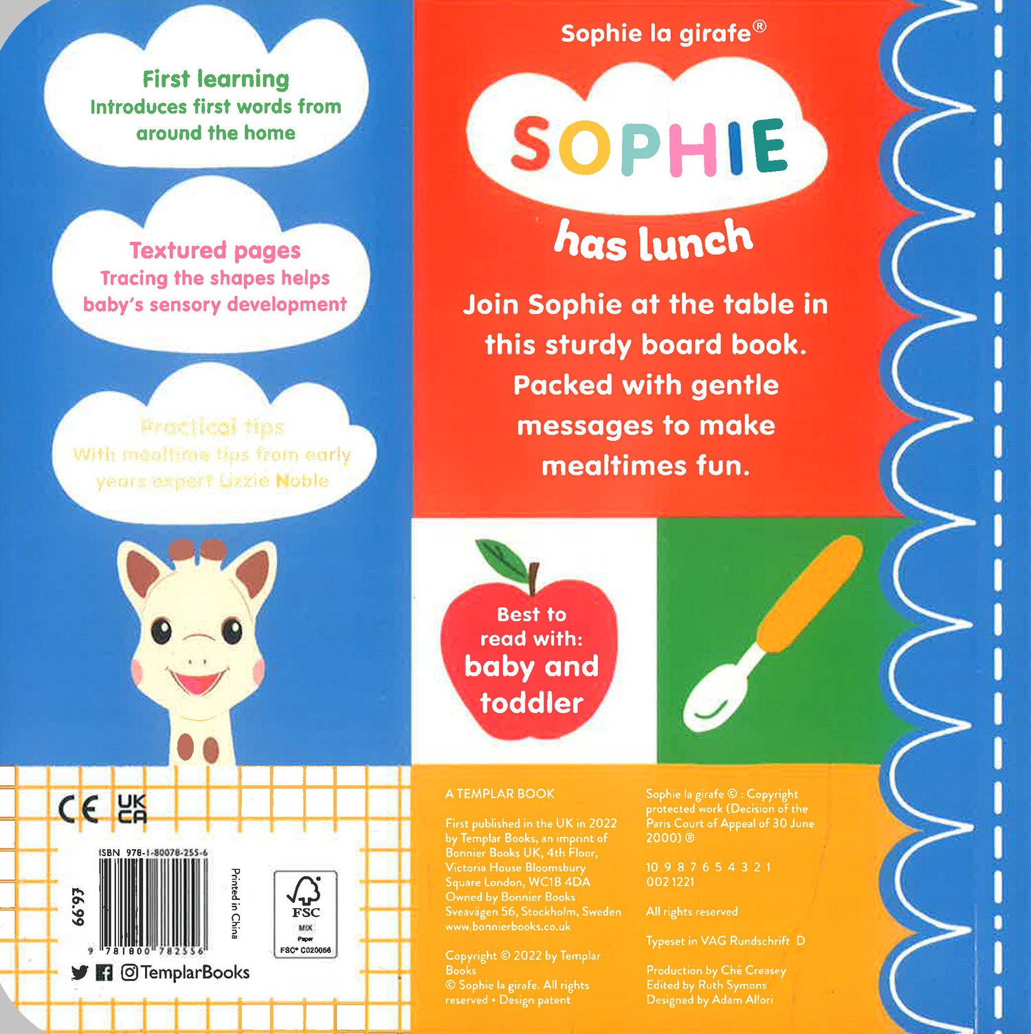 Get ready to eat with the classic Sophie la girafe toy, in this boardbook full of gentle messages for mealtime success. Sophie is feeling hungry. Join her at the table for a delicious meal in this book specially made for little ones trying their first tastes. This short story is perfect for reading aloud with babies and toddlers. Each scene presents first words from around the home, making it the ideal book for little ones just starting to talk, while textured pages will engage even the youngest babies' senses. For parents and carers, each page features short practical tips for your weaning journey, consulted by Early Years expert Lizzie Noble. Sophie la girafe has sold more than 50 million teether toys worldwide, and now the iconic toy from France turns 60. Celebrate with Sophie as she steps into the pages of a brand new series of baby books. Designed for reading together with your baby or toddler, this would also make the perfect baby shower or new baby gift.