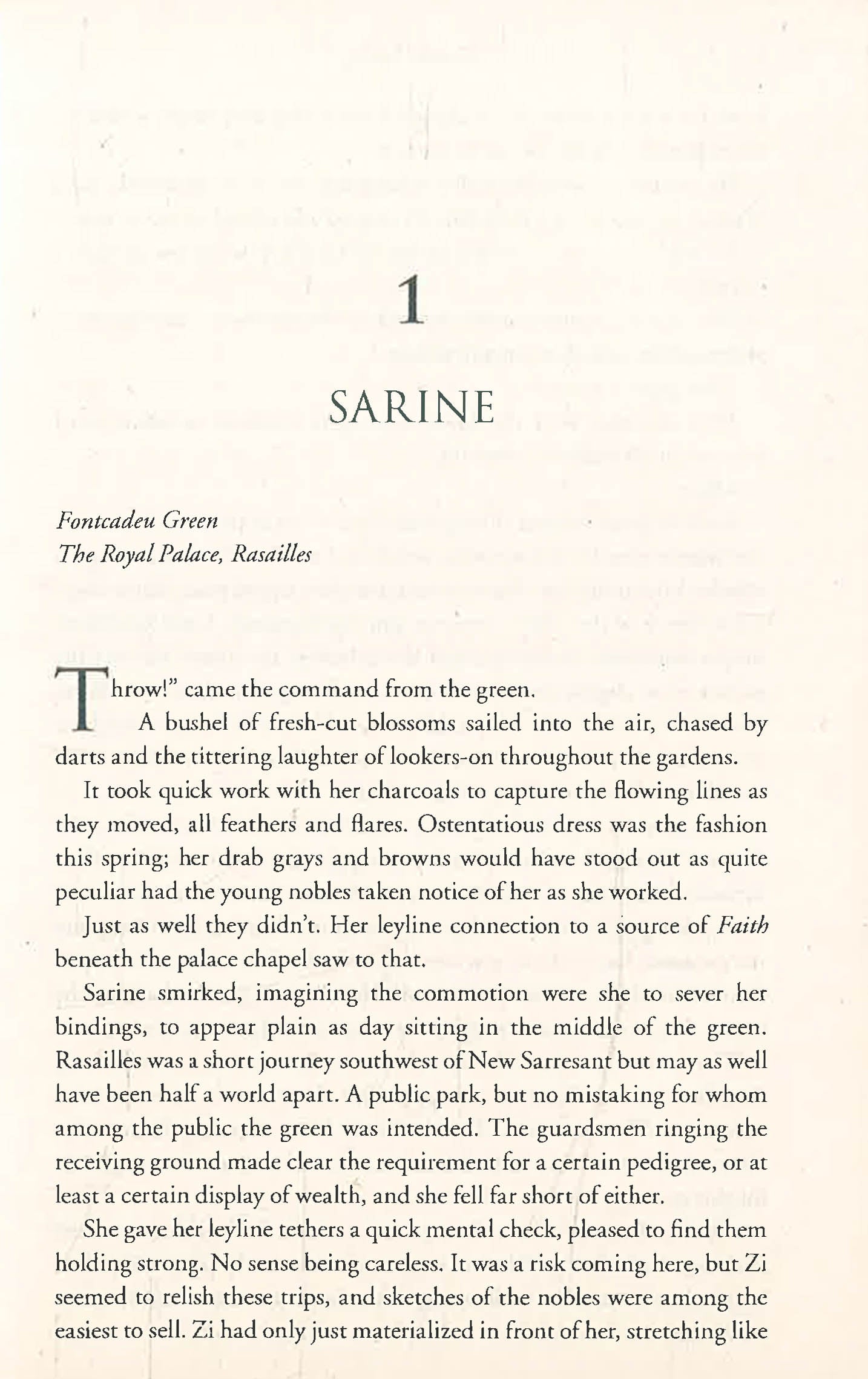 Enter a world of royalists and rebels, spies and sorcerers . . .Sarine is a young artist just trying to survive on the streets of New Sarresant - but soon her magical abilities will draw the attention of royalists and rebels alike. Arak'Jur is a guardian, responsible for keeping his tribe safe. Now he must master an ancient magic if he hopes to protect his people from bloodshed. Erris is a brilliant cavalry officer whose leadership has delivered countless victories, but now her enemies seem to know her plans before she's even made them.