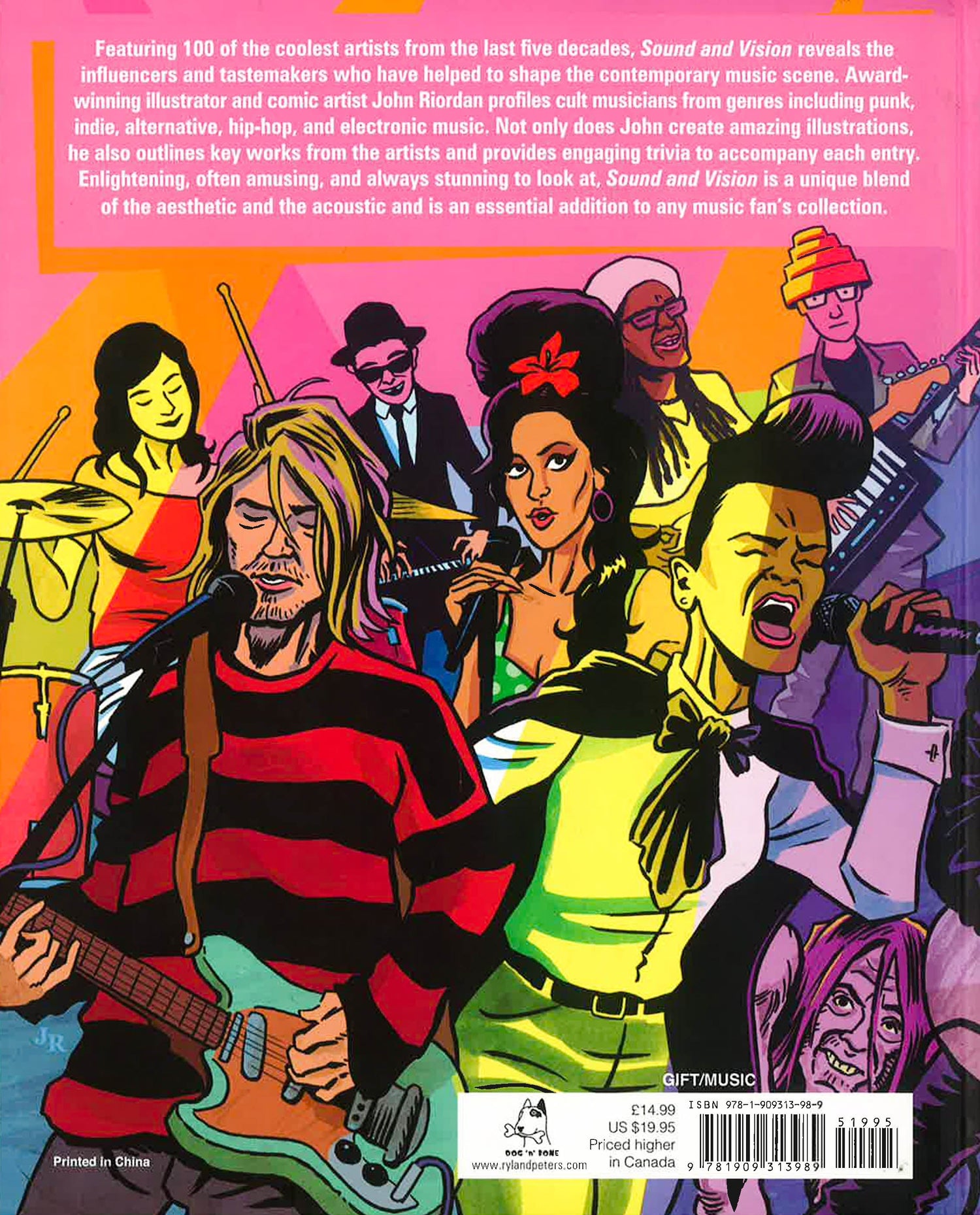 Featuring 100 of the coolest artists from the last five decades, Sound and Vision reveals the influencers and tastemakers who have helped to shape the contemporary music scene. Award-winning illustrator and comic artist John Riordan profiles cult musicians from genres including punk, indie, alternative, hip-hop and electronic music. Not only does John create amazing illustrations, he also outlines key works from the artists and provides engaging trivia to accompany each entry. Enlightening, often amusing and always stunning to look at, Sound and Vision is a unique blend of the aesthetic and the acoustic and is an essential addition to any music fan’s collection.