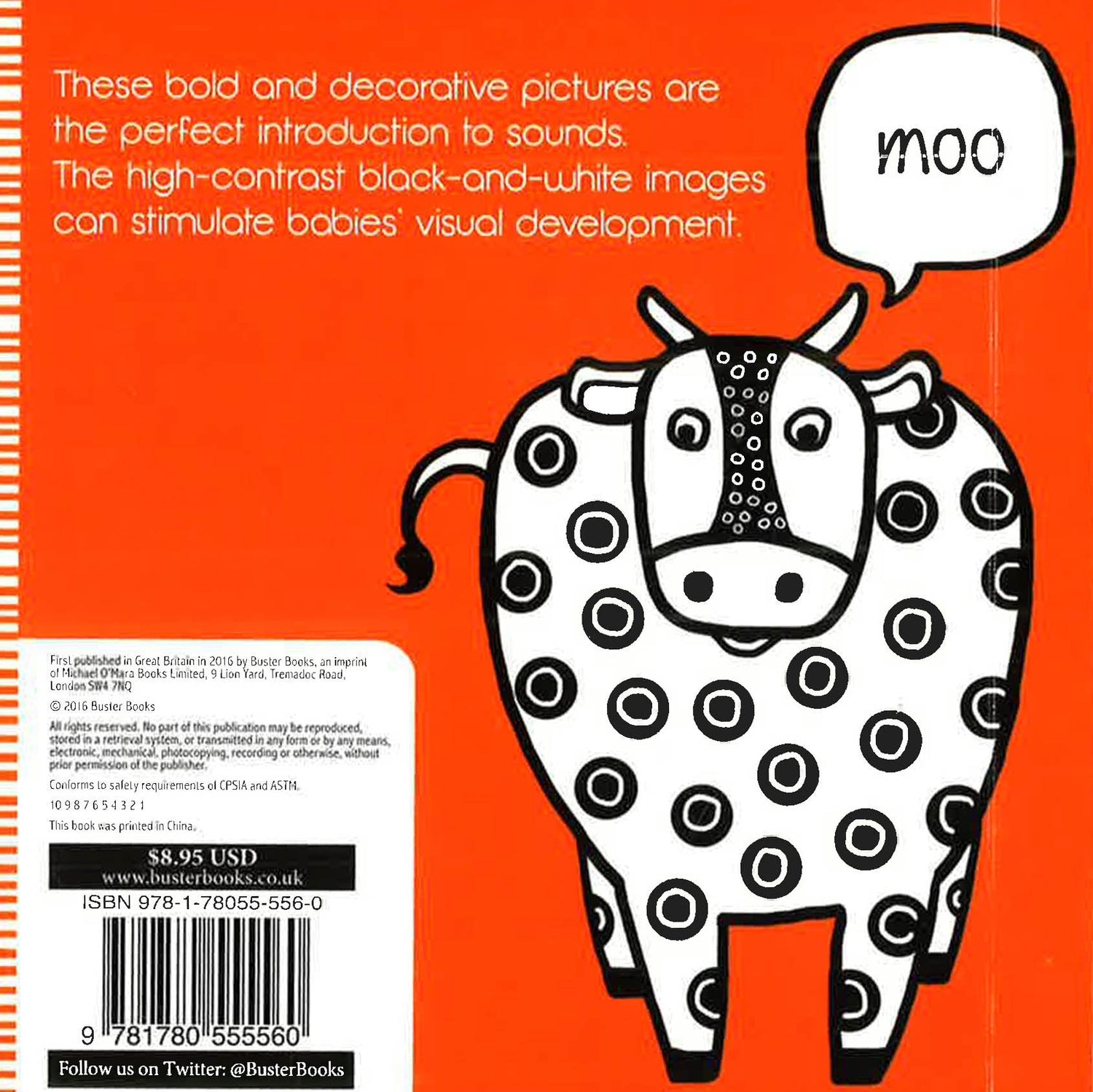 These bold and decorative board books are the perfect introduction to animal sounds. This beautifully illustrated series of board books is a wonderful way to stimulate babies and teach toddlers their first words. Featuring bespoke, eye-catching artwork, these hi-contrast black and white books are sure to stimulate and inspire newborn babies. Includes decorative pictures with some coloured details to encourage young ones to develop their focusing skills.