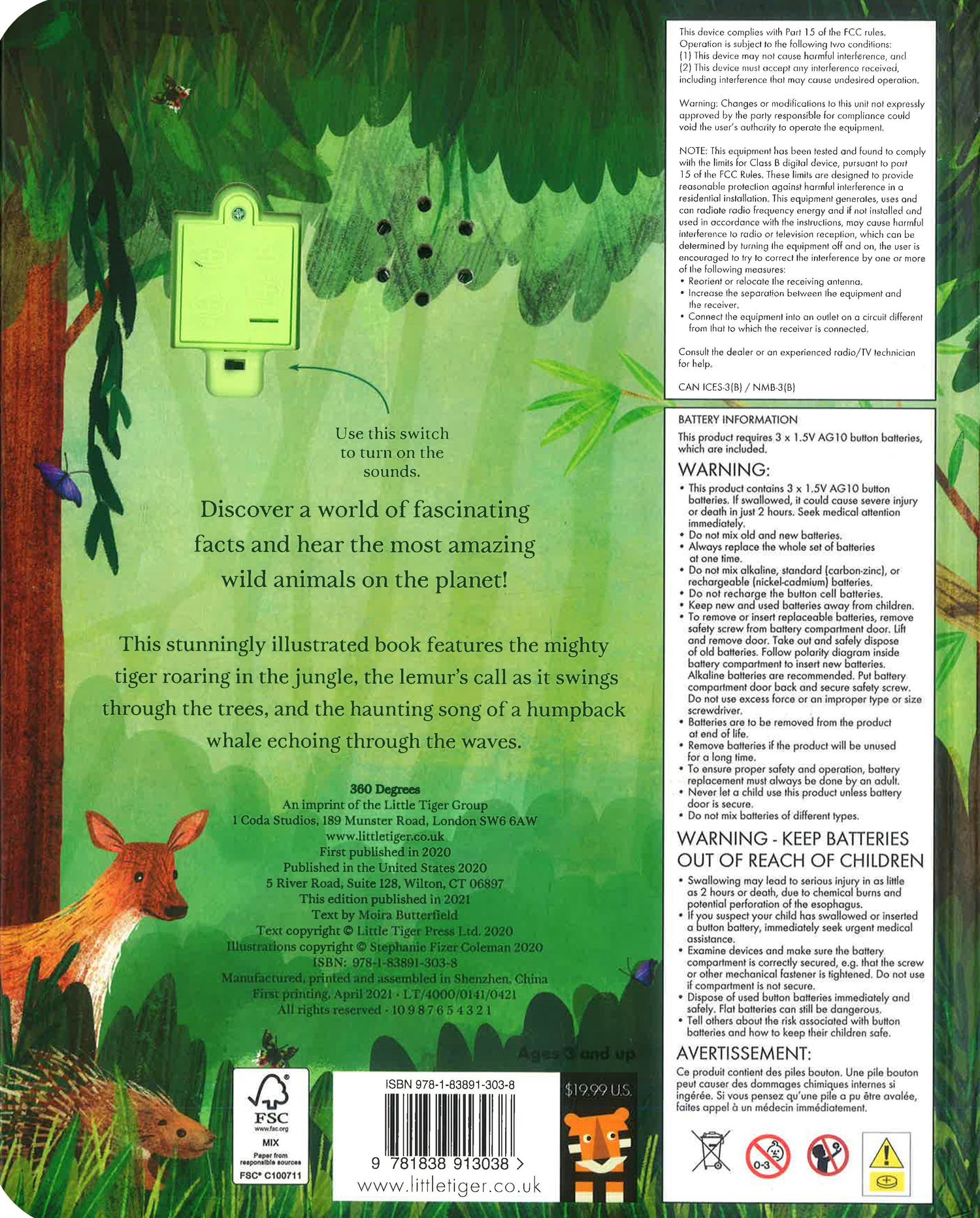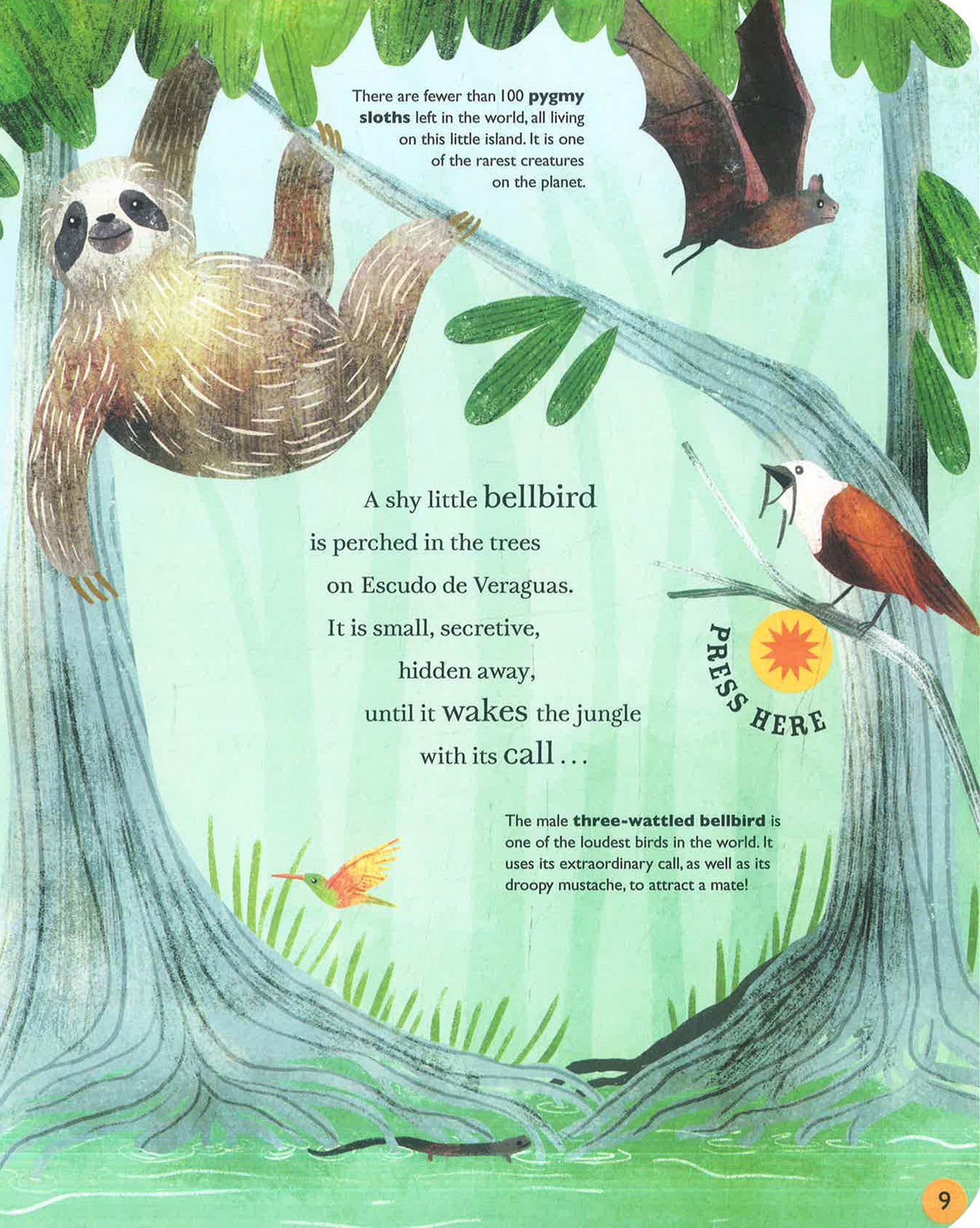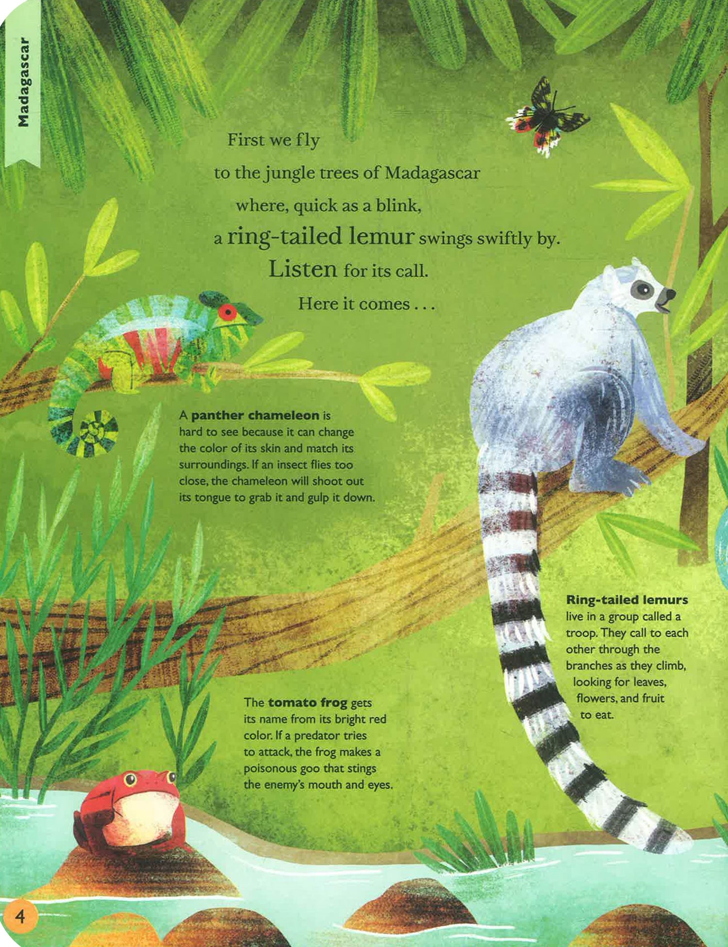 This stunningly illustrated book features the mighty tiger roaring in the jungle, the lemur's call as it swings through the trees, and the haunting song of a humpback whale echoing through the waves.
