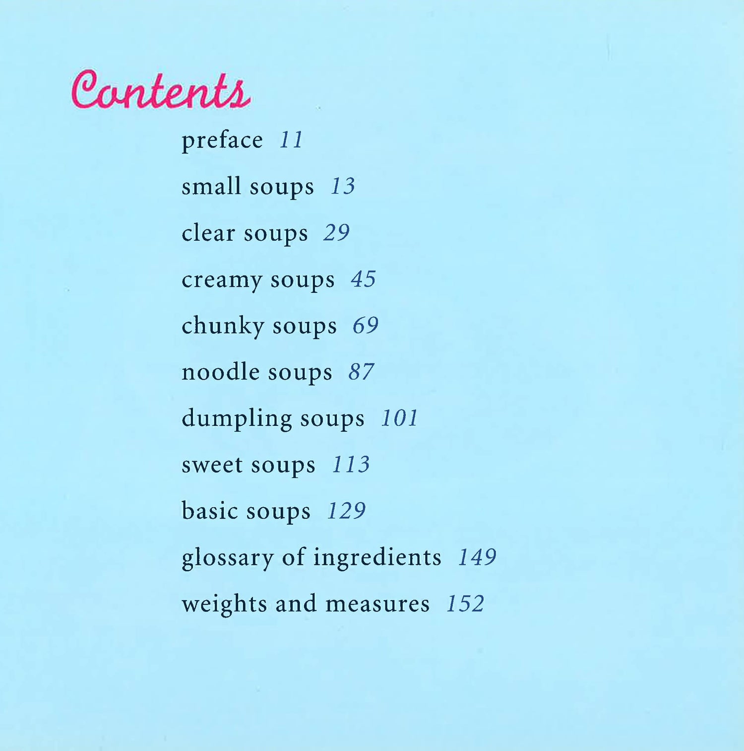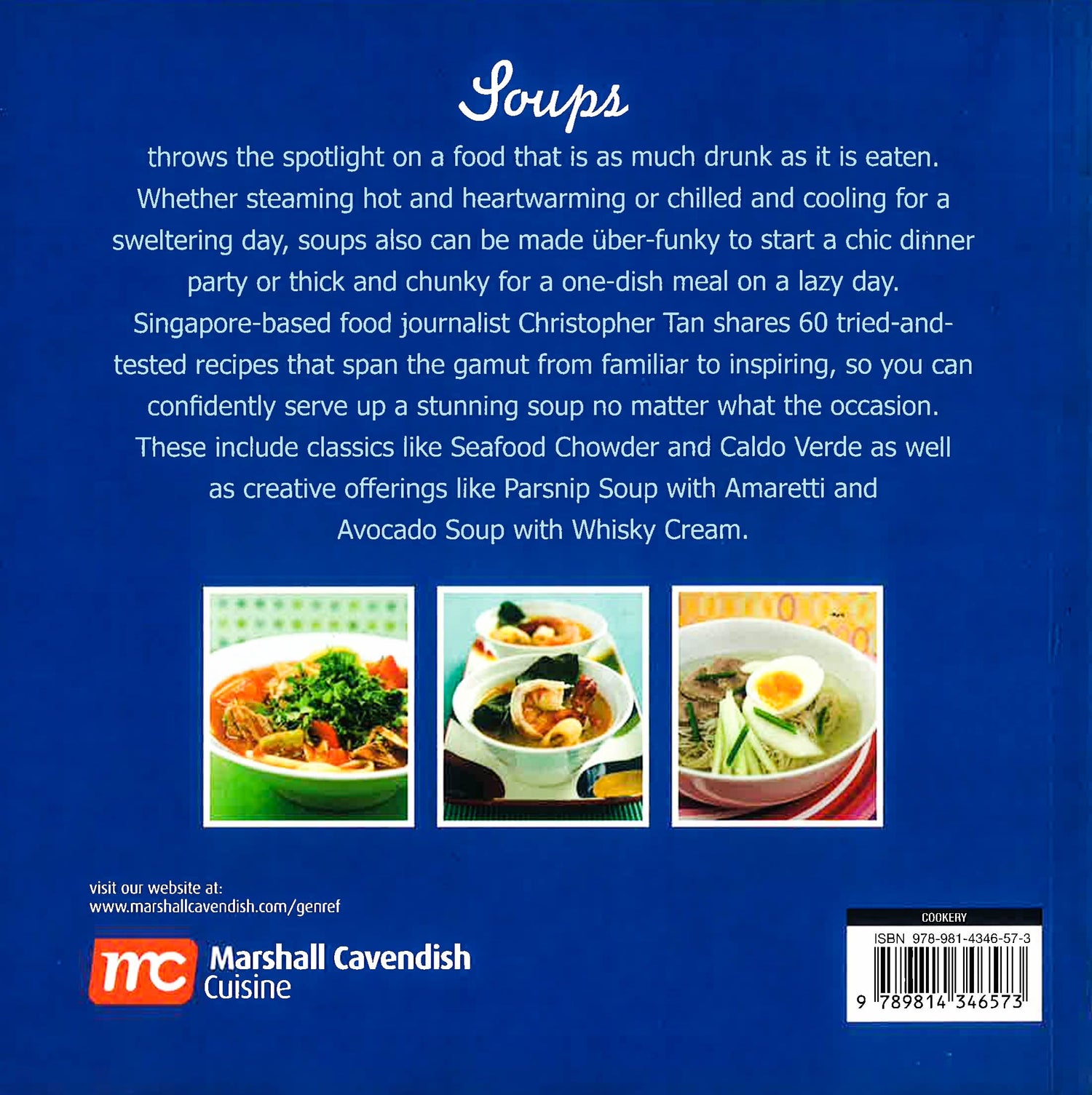 Soups is a compilation of 60 exciting recipes that will inspire cooking enthusiasts to whip up and enjoy soups of various tastes and textures for every occasion. Whether hot or chilled, smooth or chunky, creamy or clear, the recipes featured in this book are guaranteed to delight! These include classics like Seafood Chowder and Winter Melon Soup with Ham as well as creative soups like Parsnip Soup with Amaretti and Hakka-inspired Thunder Tea Soup. Also included is a section on sweet soups such as Spiced Cherry Soup, Avocado Soup with Whiskey Cream and Pineapple-basil Soup with Strawberry Sorbet. Each recipe in this cookbook is easy-to-follow and is accompanied by colorful photography and useful tips on how to create perfectly delicious soups in the home kitchen.