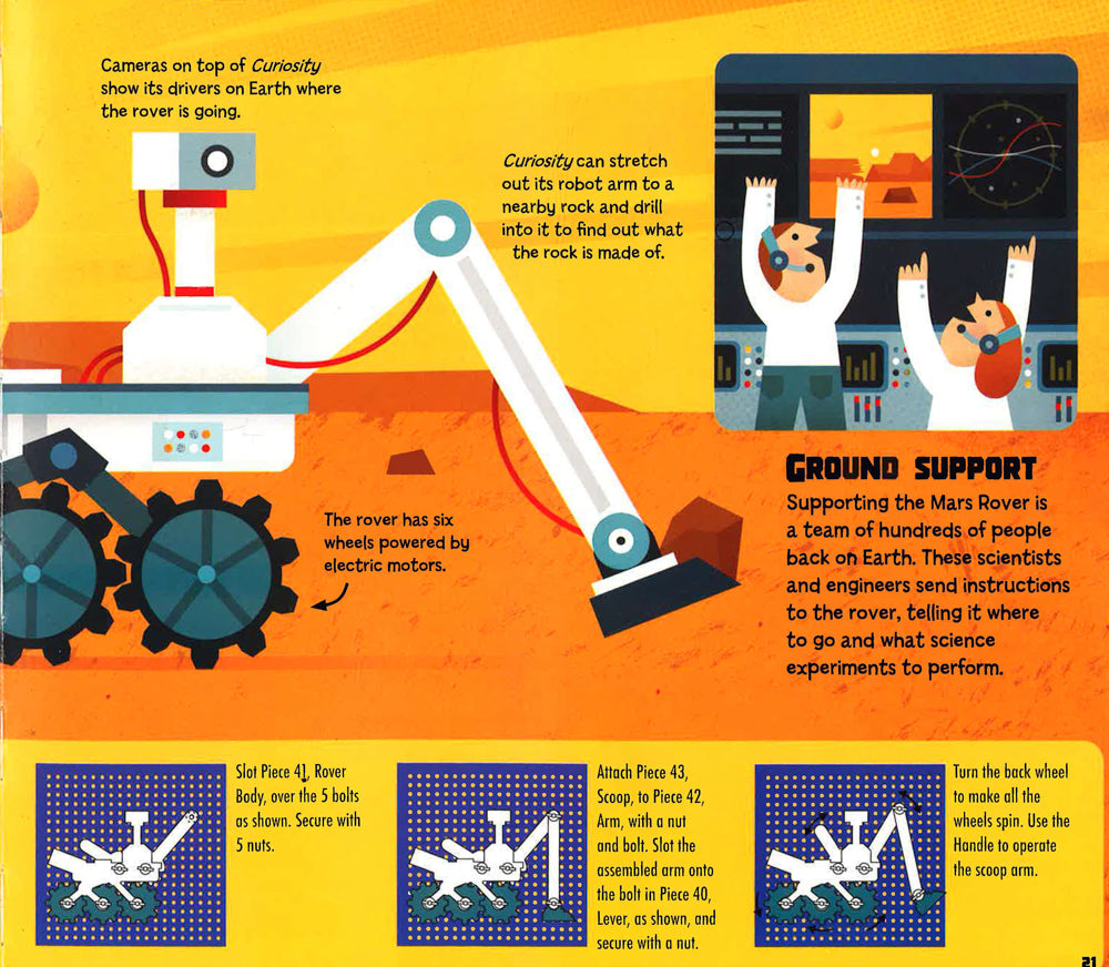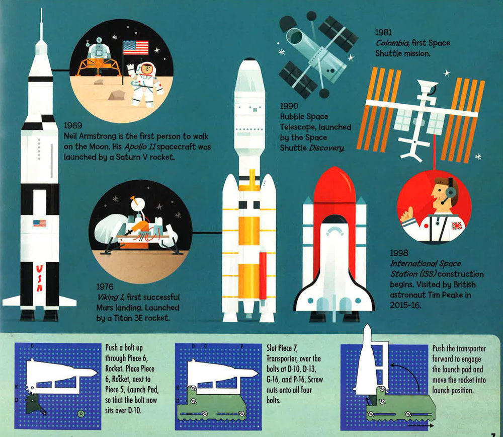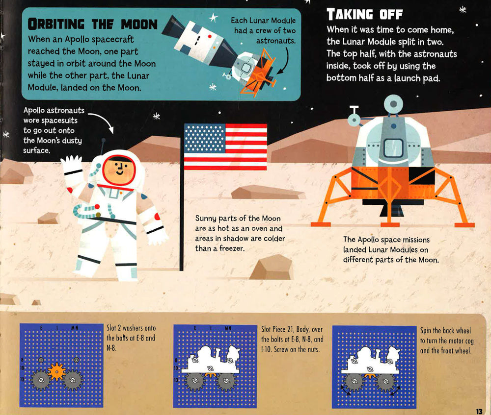 Fascinating facts about real space machines and our solar system and fun, detailed illustrations of them are accompanied by easy-to-follow directions for creating your own moving machines. With the included pegboard and 40 sturdy, colorful machine pieces, plus plastic nuts and bolts, build: Earth and Moon - Turn the Moon around the Earth and watch the Moon spin in its orbit.R-7 Rocket - Push the transporter forward to move the rocket into launch position.Rocket with swirling smoke - Launch the rocket by pushing it up.Satellite - Slide the satellite base up and down to open and close the solar panels.Moon Buggy - Spin the back wheel to turn the motor cog and the front wheel.Space Shuttle Orbiter - Swing the astronaut out under the Shuttle to launch the Hubble Telescope from the shuttle's payload bay.International Space Station - Turn the astronaut to make the Soyuz Spacecraft dock and undock with the station module.Station Module - Slide the astronaut back and forth to watch the other astronaut and scientists work in zero gravity.Mars Rover - Turn the back wheel to make all the wheels spin. Use the handle to operate the scoop arm. This is the perfect, hands-on introduction to space machines for budding engineers and fans of outer space everywhere.