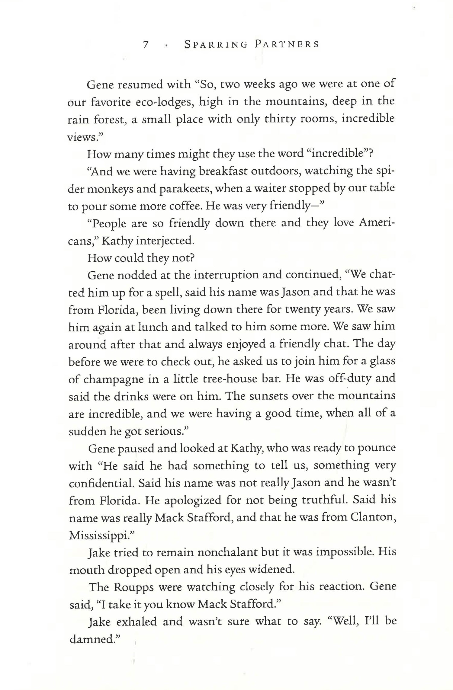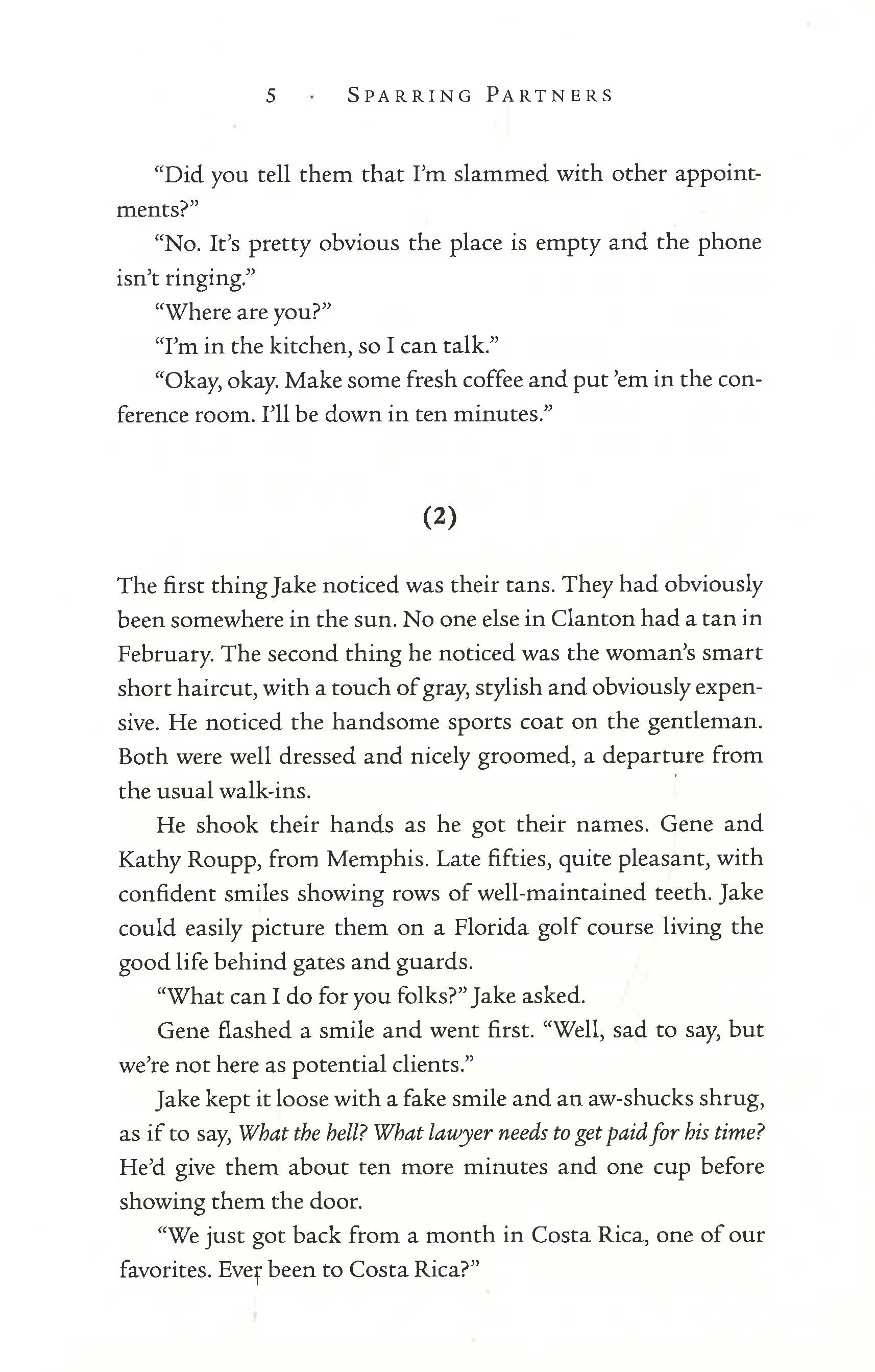 The “Sparring Partners” are the Malloy brothers, Kirk and Rusty, two successful young lawyers who inherited a once prosperous firm when its founder, their father, was sent to prison. Kirk and Rusty loathe each other, and speak to each other only when necessary. As the firm disintegrates, the resulting fiasco falls into the lap of Diantha Bradshaw, the only person the partners trust. Can she save the Malloys, or does she take a stand for the first time in her career and try to save herself?