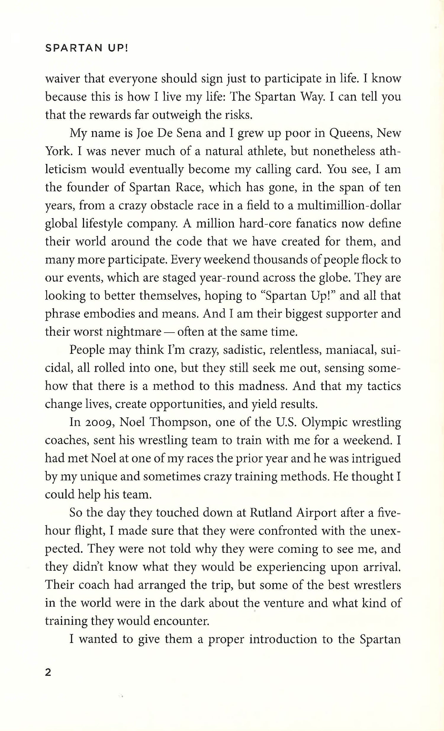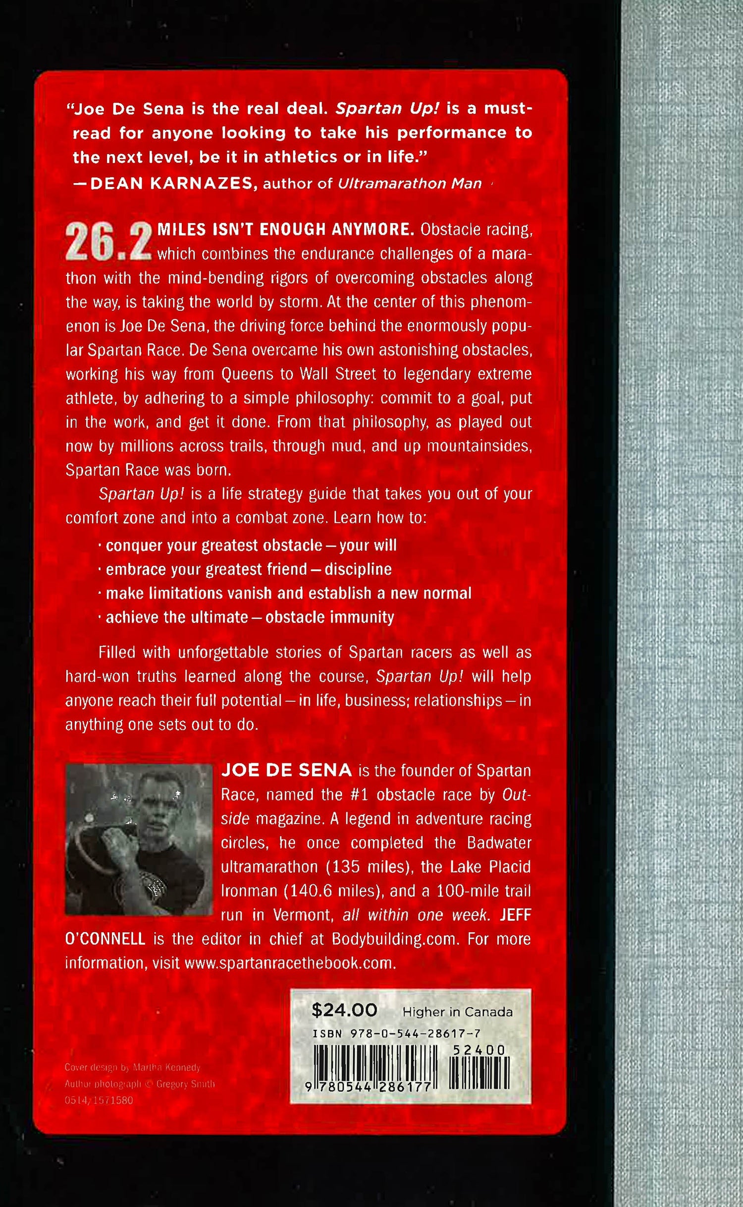 Twenty-six point two miles isn't enough anymore. Obstacle course racing, which combines the endurance challenges of a marathon with the mind-bending rigors of overcoming obstacles along the way, is taking the world by storm. At the center of this phenomenon is Joe De Sena, the driving force behind the enormously popular Spartan Race. De Sena offers a simple philosophy: commit to a goal, put in the work, and get it done. From that philosophy, as played out first in his own life and now for millions across trails, through mud, and up mountainsides, Spartan Race was born. Now in Spartan Up! De Sena gives you a life strategy guide that takes you out of your comfort zone and into a combat zone. As he breaks down obstacles from his many races, detailing how each parallels real life experiences, you will learn how to: - conquer your greatest obstacle--your will - embrace your greatest friend--discipline - make limitations vanish and establish a new normal - achieve the ultimate: obstacle immunity Other events breed sheep; Spartan Race breeds wolves. Filled with unforgettable stories of Spartan racers as well as hard-won truths learned along the course, Spartan Up! will help anyone reach their full potential--in life, business, relationships, indeed anything one sets out to do. It is the blueprint that takes you right past Go to your finish line.