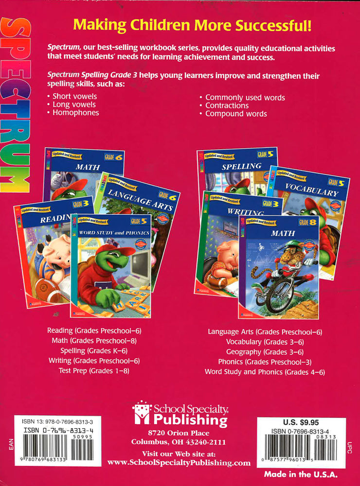 Our proven Spectrum Spelling grade 3 workbook features 192 pages of instruction on grammar and usage. Recently updated to current national standards, including "Words Across the Curriculum" and new non-fiction activities. This workbook for children ages 8 to 9 includes grade-appropriate, cross-curricular words that apply to each lesson. Spelling skills include: *Short vowels *Long vowels *Homophones *Commonly used words *Contractions *Compound words Our best-selling Spectrum Spelling series features age-appropriate workbooks for Kindergarten to grade 6. Developed with the latest standards-based teaching methods that provide targeted practice in spelling fundamentals to ensure successful learning!