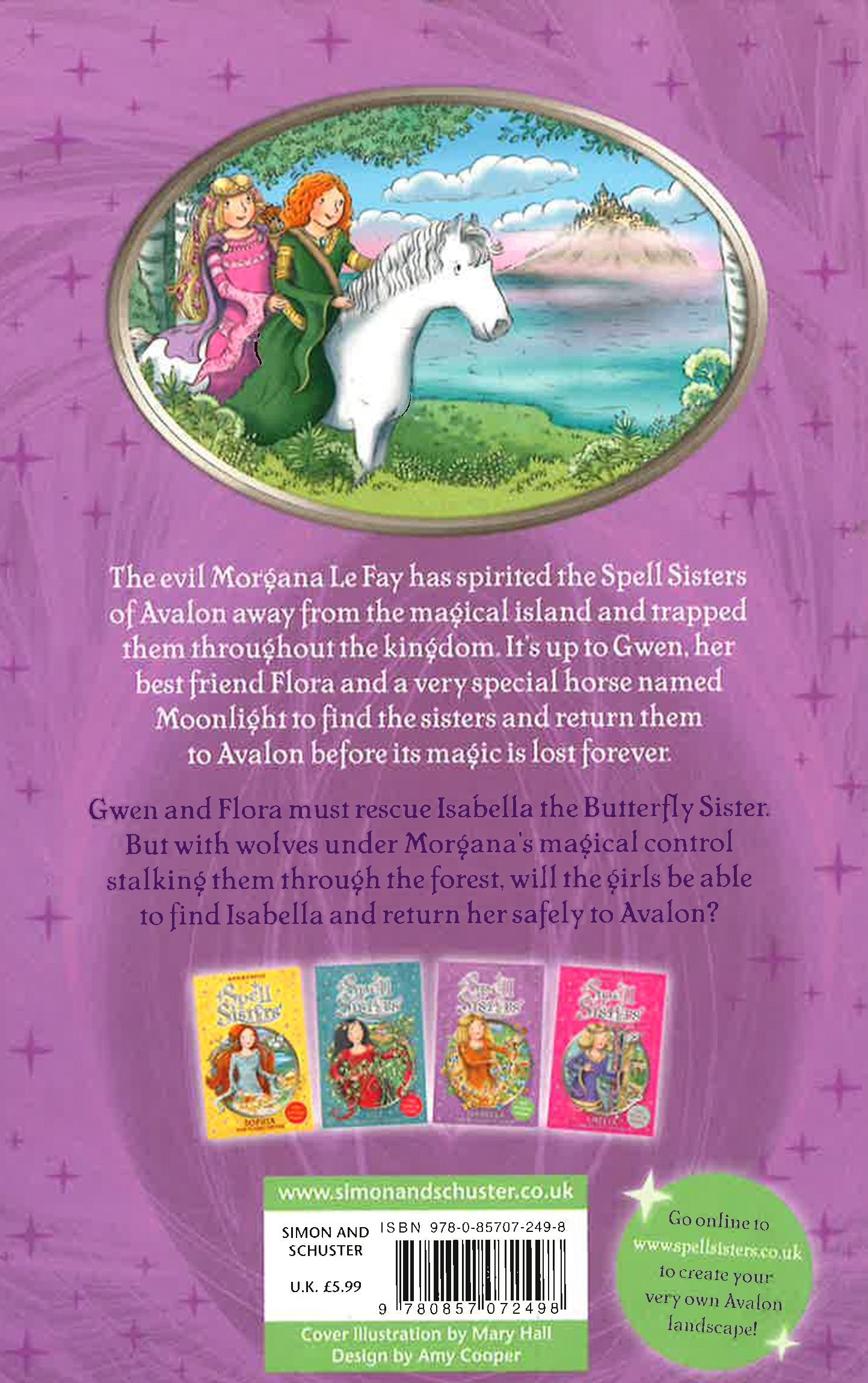 When eleven-year-old Gwen ventures into the forest beyond her castle home she comes across the magical island of Avalon and her life changes forever. The lady of the lake, Nineve, asks Gwen to embark on a quest to protect the enchanted island of Avalon from the evil sorceress Morgana Le Fay. Morgana has imprisoned the eight Spell Sisters of Avalon throughout the kingdom and stolen their magical powers. It's up to Gwen, her best friend Flora and a very special horse named Moonlight to find the sisters and return them to Avalon before its magic is lost forever. In their third adventure Gwen and Flora must find Isabella the Butterfly Sister. But with wolves under Morgana's magical control stalking them through the forest, will the girls be able to find Isabella and return her safely to Avalon?