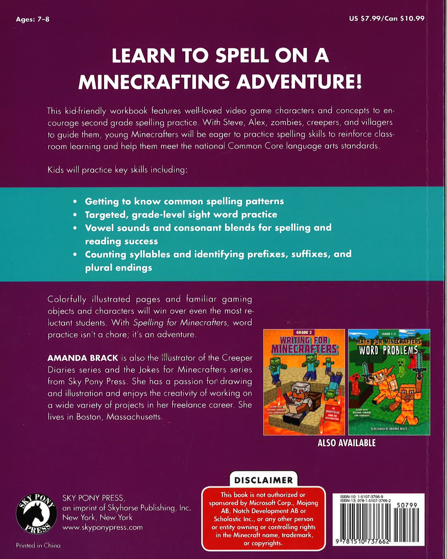 This kid-friendly workbook features well-loved video game characters and concepts to encourage second grade spelling practice. With Steve, Alex, zombies, creepers, and villagers to guide them, young Minecrafters will be eager to practice spelling skills to reinforce classroom learning and help them meet the National Common Core language arts standards.