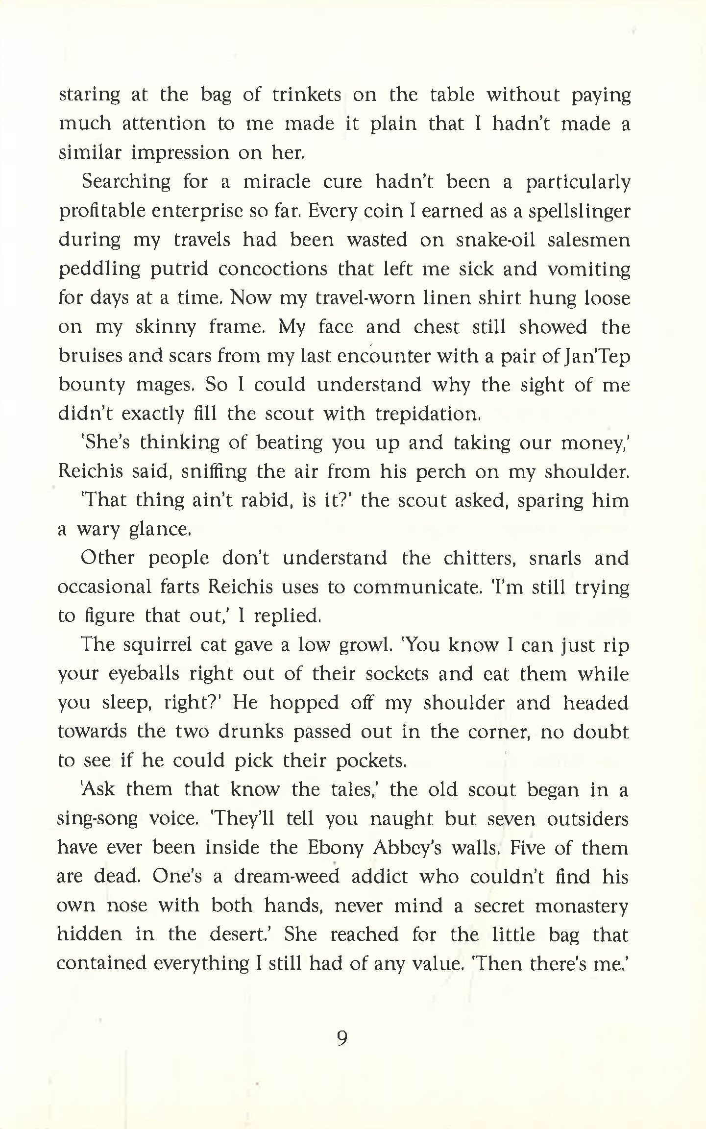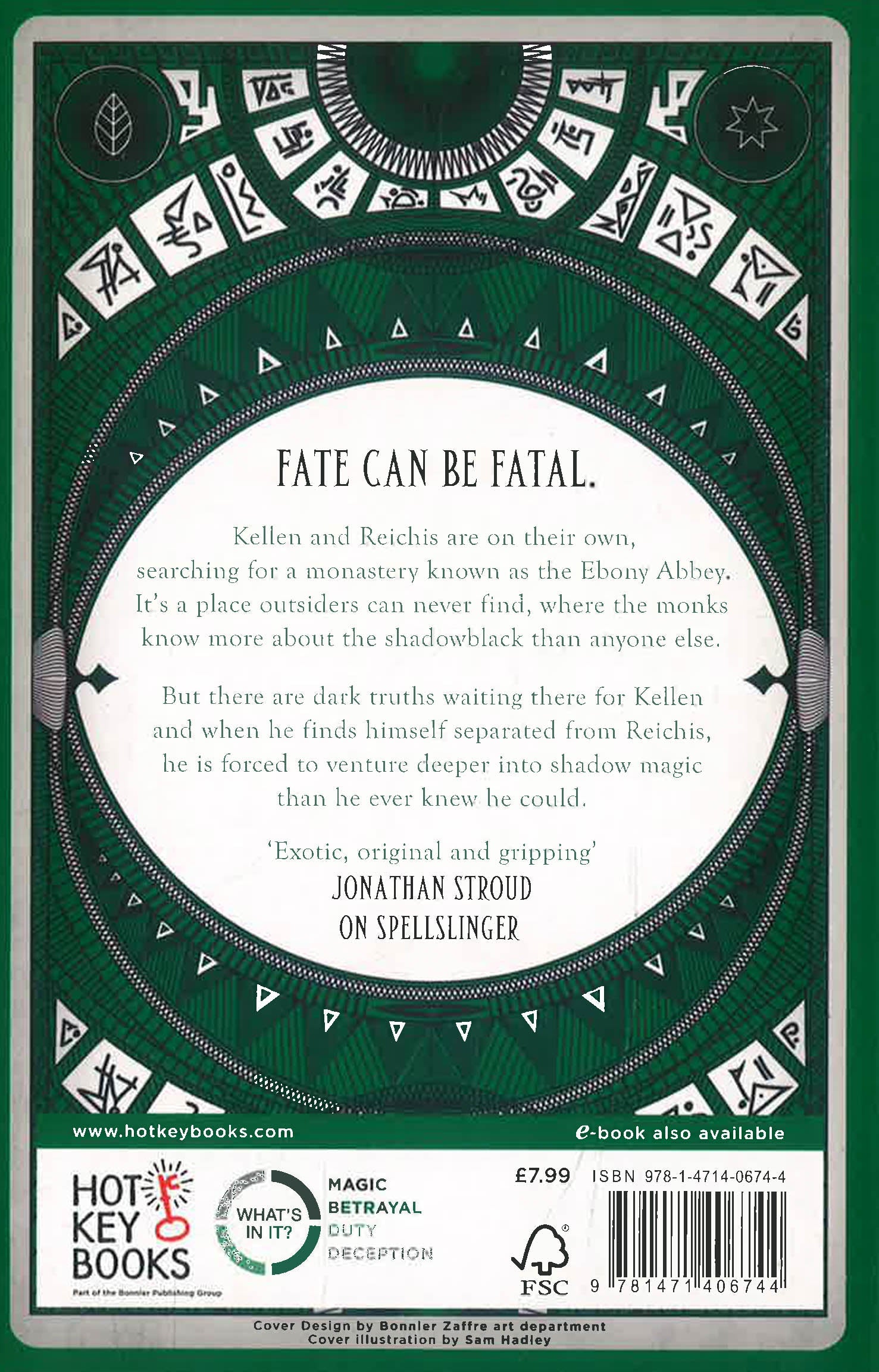The fourth book in the page-turning SPELLSLINGER fantasy series. Kellen and his murderous squirrel cat, Reichis, are on their own. They've heard rumour of a mythical monastery, known as the Ebony Abbey. It's a place that outsiders can never find - but Kellen is getting desperate. He's been told that the monks inside the Ebony Abbey know more about the Shadowblack than anyone else - and that they even know how to cure it. Then Kellen and Reichis are separated and for the first time, Kellen must face the world alone - and venture deeper into shadow magic than he ever knew he could. Perfect for fans of The Dark Tower, Firefly, Guardians of the Galaxy, Terry Pratchett, Ben Aaronovitch and Jim Butcher.