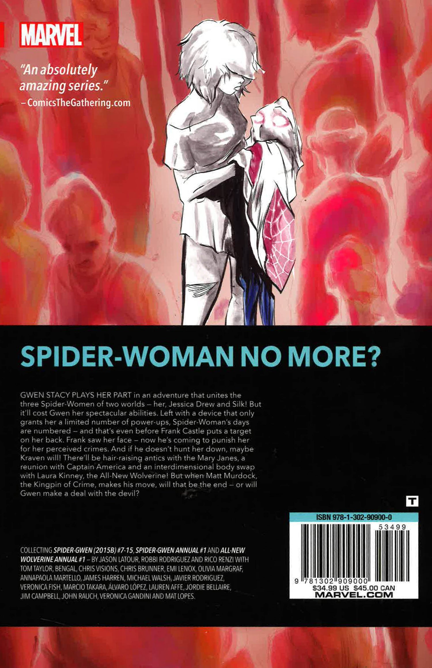 Gwen Stacy has lost her spider-powers! Which makes this a very bad time to fi nd herself in Frank Castle's crosshairs! So when the Mary Janes head to a haunted house, will Gwen be along for the fun, or will she be one of the ghosts? Thanksgiving should be a happy time with friends and family - unless crime lord Matt Murdock and his ninjas crash the party! Is it time for Gwen to put a stop to the Kingpin of Crime - or does Matt have a thing or two to teach her? Plus, the Mary Janes get loud and Gwen spends some time with her ever-expanding social circle - including Captain America! She-Hulk?! Her BPFF (best pig friend forever) Spider-Ham! And her new body-swapping bud, the All-New Wolverine! COLLECTING: SPIDER-GWEN (2015B) 7-15, SPIDER-GWEN ANNUAL 1, ALL-NEW WOLVERINE ANNUAL 1