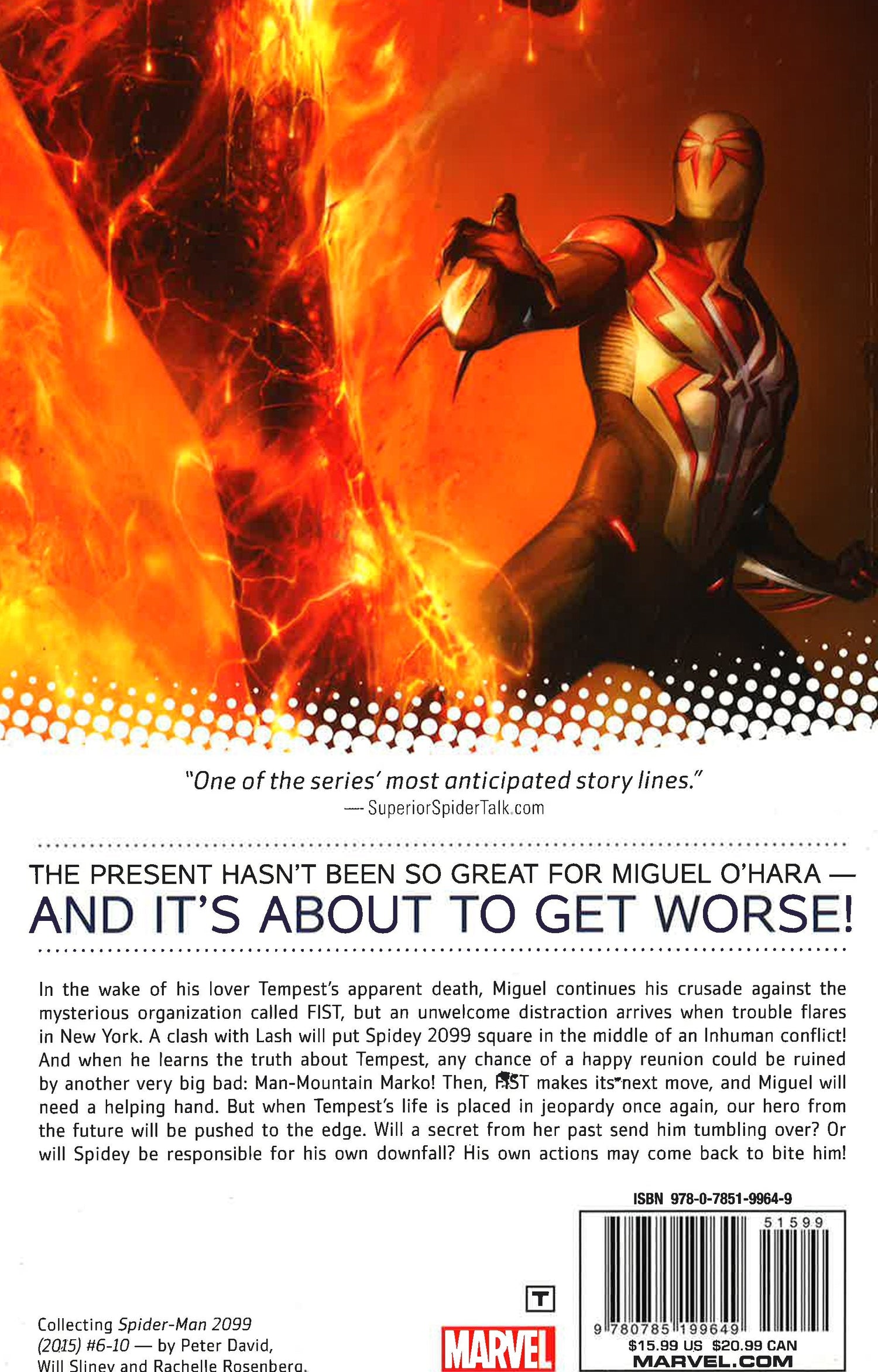 Miguel O'Hara's crusade against the mysterious organization called FIST continues! But there's trouble in New York when the Inhuman LASH (y'know, the one from a little show called Agents of S.H.I.E.L.D.) arrives and breaks into Alchemax! * This book may have remainder mark*