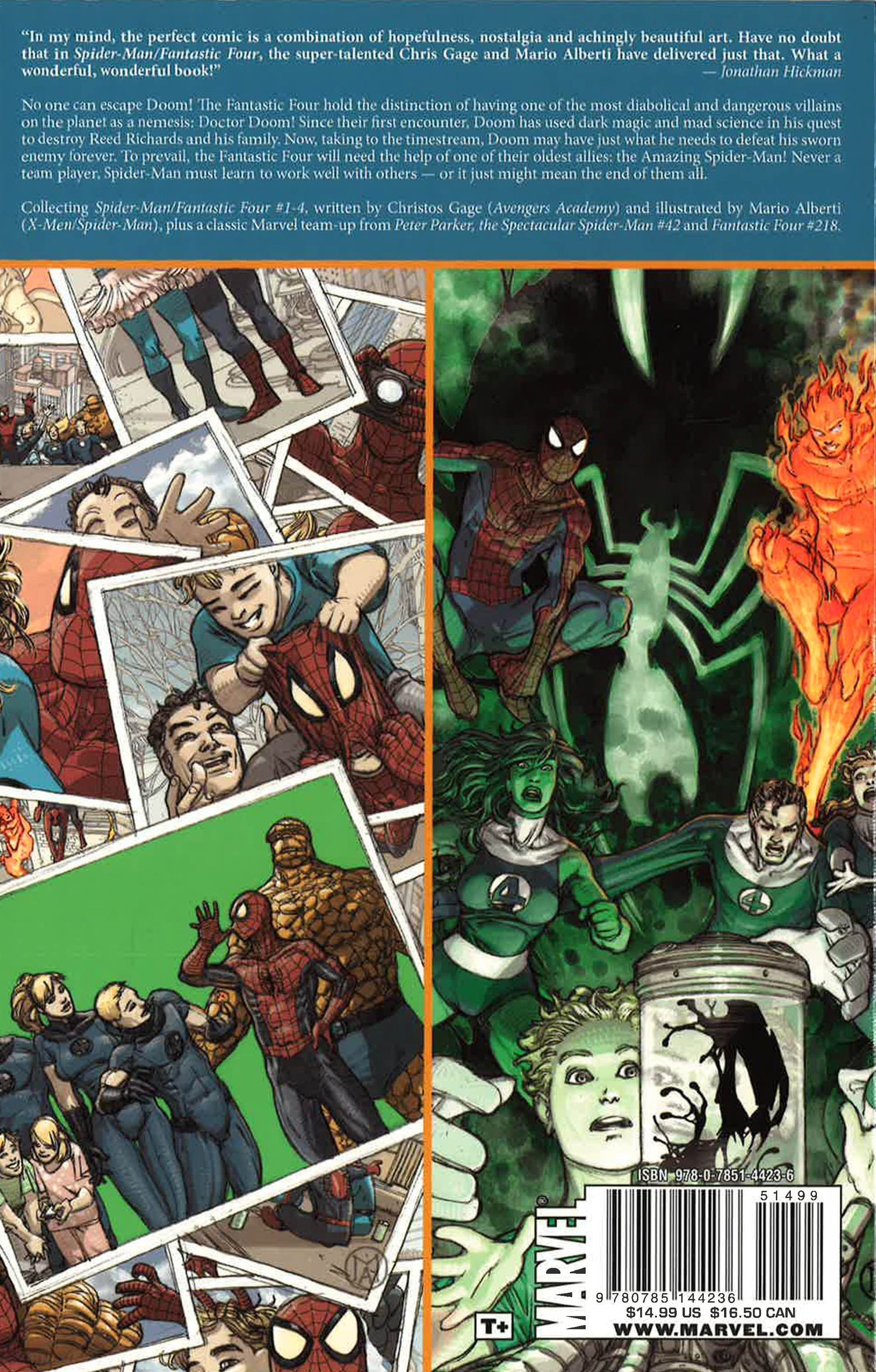The Fantastic Four hold the distinction of having one of the most diabolical and dangerous villains on the planet for a nemesis: Dr. Doom! Since their first encounter, Doom has used dark magic and mad science in his quest to destroy Reed Richards and his family. Now, taking to the timestream, Doom may have just what he needs to defeat his sworn enemy forever. To prevail, the Fantastic Four will need the help of one of their oldest allies: the Amazing Spider-Man! Never a team player, Spider-Man must learn to work well with others - or it just might mean the end of them all. Plus: a classic two-part team-up featuring the FF and the web-slinger! Collecting SPIDER-MAN/FANTASTIC FOUR (2010) #1-4; PETER PARKER, THE SPECTACULAR SPIDER-MAN (1976) #42; and FANTASTIC FOUR (1961) #218.