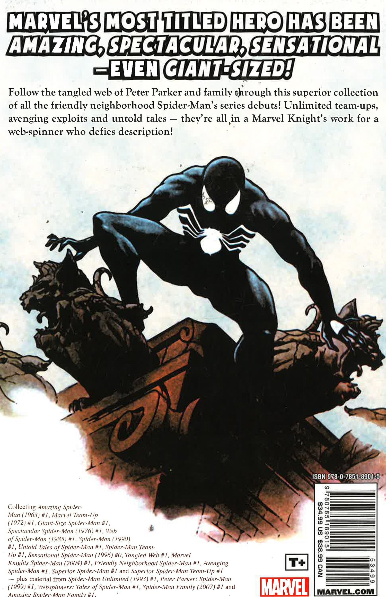 Marvel's most titled hero has been amazing, spectacular, sensational - even giant-size! Follow the tangled web of Peter Parker and family through this superior collection of all the friendly neighborhood Spider-Man's series debuts! Unlimited team-ups, avenging exploits and untold tales - they're all in a Marvel Knight's work for a webspinner that defies description!' COLLECTING AMAZING SPIDER-MAN (1963) 1, MARVEL TEAM-UP (1972) 1, GIANT-SIZE SPIDER-MAN 1, SPECTACULAR SPIDER-MAN (1976) 1, WEB OF SPIDERMAN (1985) 1, SPIDER-MAN (1990) 1, UNTOLD TALES OF SPIDER-MAN 1, SPIDERMAN TEAM-UP 1, SENSATIONAL SPIDERMAN (1996) 0, TANGLED WEB 1, MARVEL KNIGHTS SPIDER-MAN 1, FRIENDLY NEIGHBORHOOD SPIDER-MAN 1, AVENGING SPIDER-MAN 1, SUPERIOR SPIDER-MAN 1, SUPERIOR SPIDER-MAN TEAM-UP 1; SPIDER-MAN UNLIMITED (1993) 1, PETER PARKER: SPIDER-MAN (1999) 1, WEBSPINNERS: TALES OF SPIDER-MAN 1, SPIDERMAN FAMILY (2007) 1, AMAZING SPIDERMAN FAMILY 1