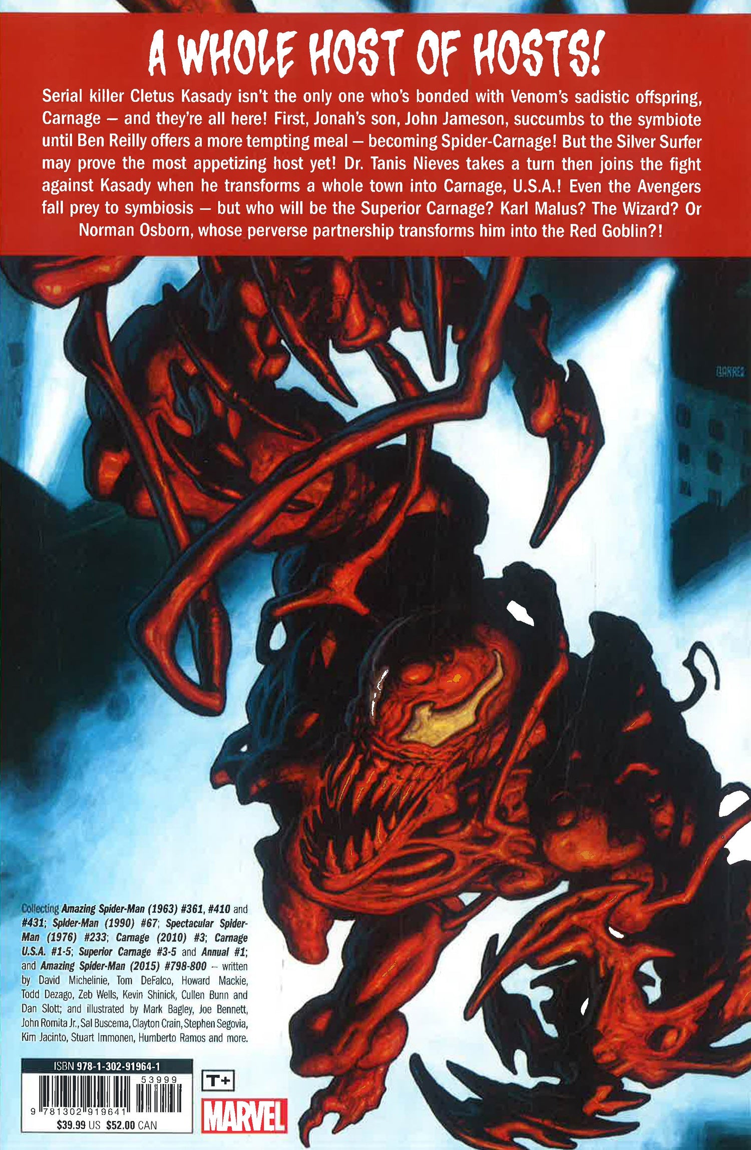Collects Amazing Spider-Man (1963) #361, 410, 431; Spider-Man (1990) #67; Spectacular Spider-Man (1976) #233; Carnage (2010) #3; Carnage USA #1-5; Superior Carnage #3-5, Annual #1; Amazing Spider-Man (2015) #798-800. A whole host of hosts! Serial killer Cletus Kasady isn't the only one who's bonded with Venom's sadistic offspring, Carnage - and they're all here! First, Jonah's son John Jameson succumbs to the symbiote until Ben Reilly offers a more tempting meal - becoming Spider-Carnage! But the Silver Surfer may prove the most appetizing host yet! Dr. Tanis Nieves takes a turn then joins the fight against Kasady when he transforms a whole town into Carnage, U.S.A.! Even the Avengers fall prey to symbiosis - but who will be the Superior Carnage? Karl Malus? The Wizard? Or Norman Osborn, whose perverse partnership transforms him into the Red Goblin!