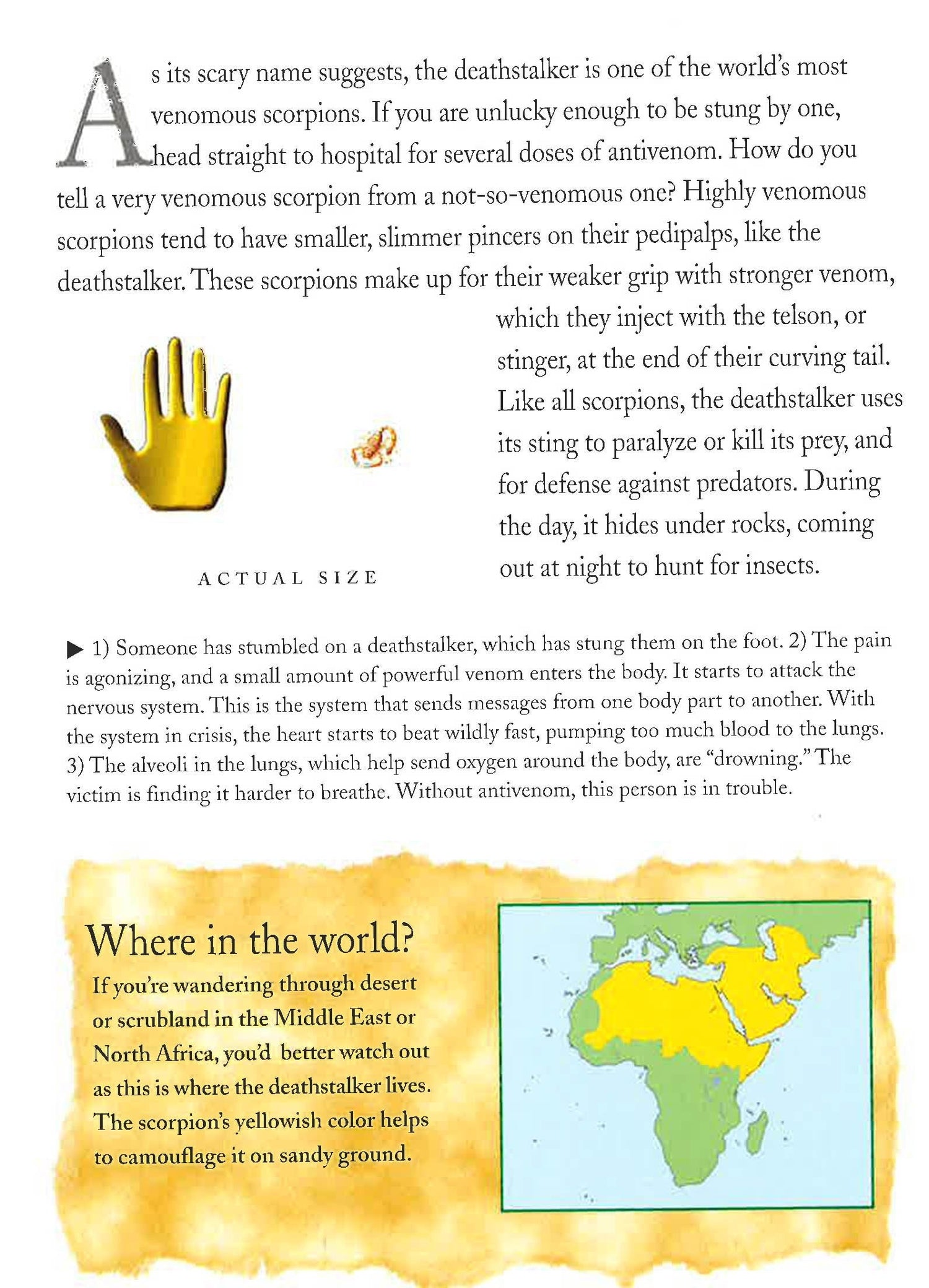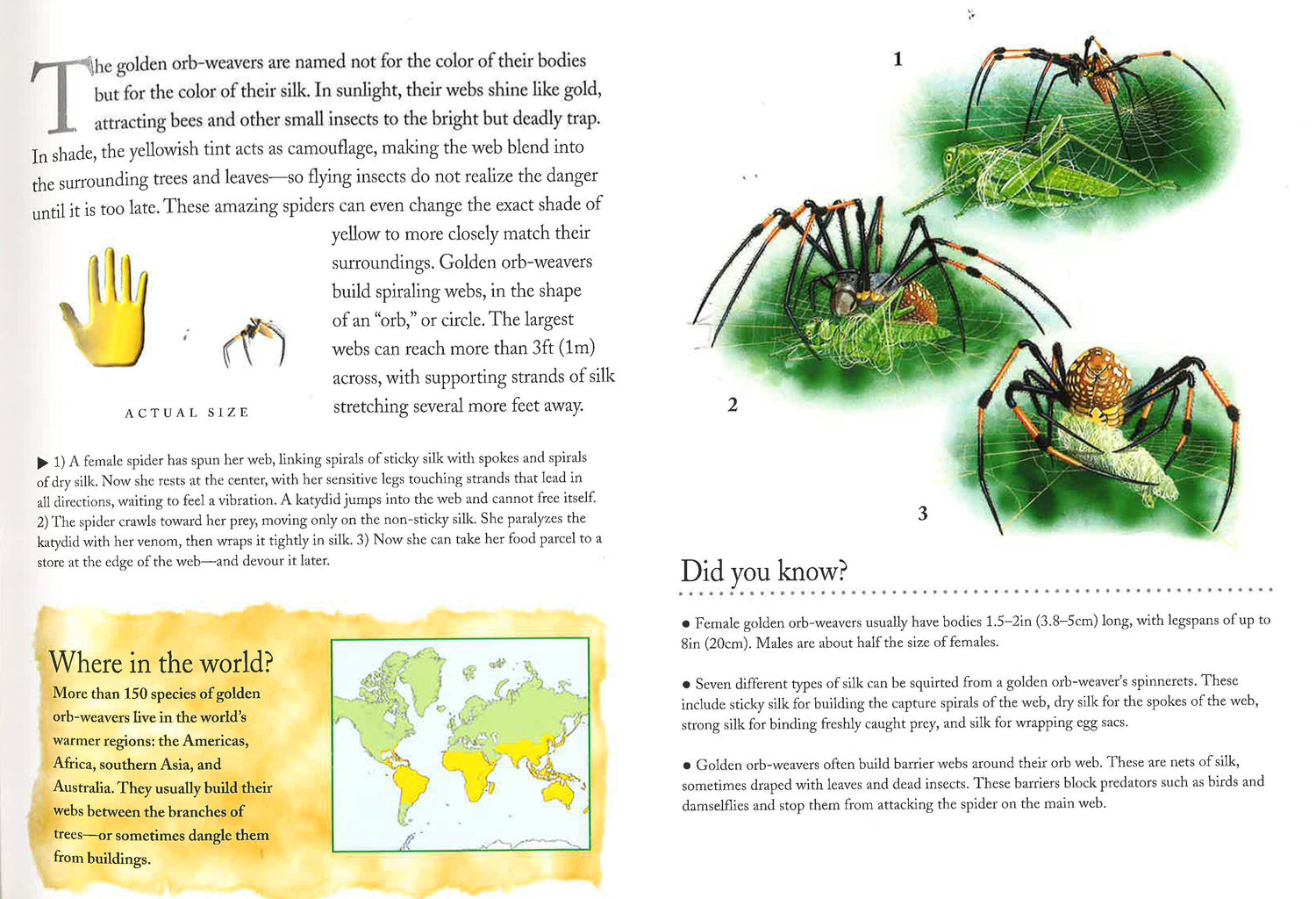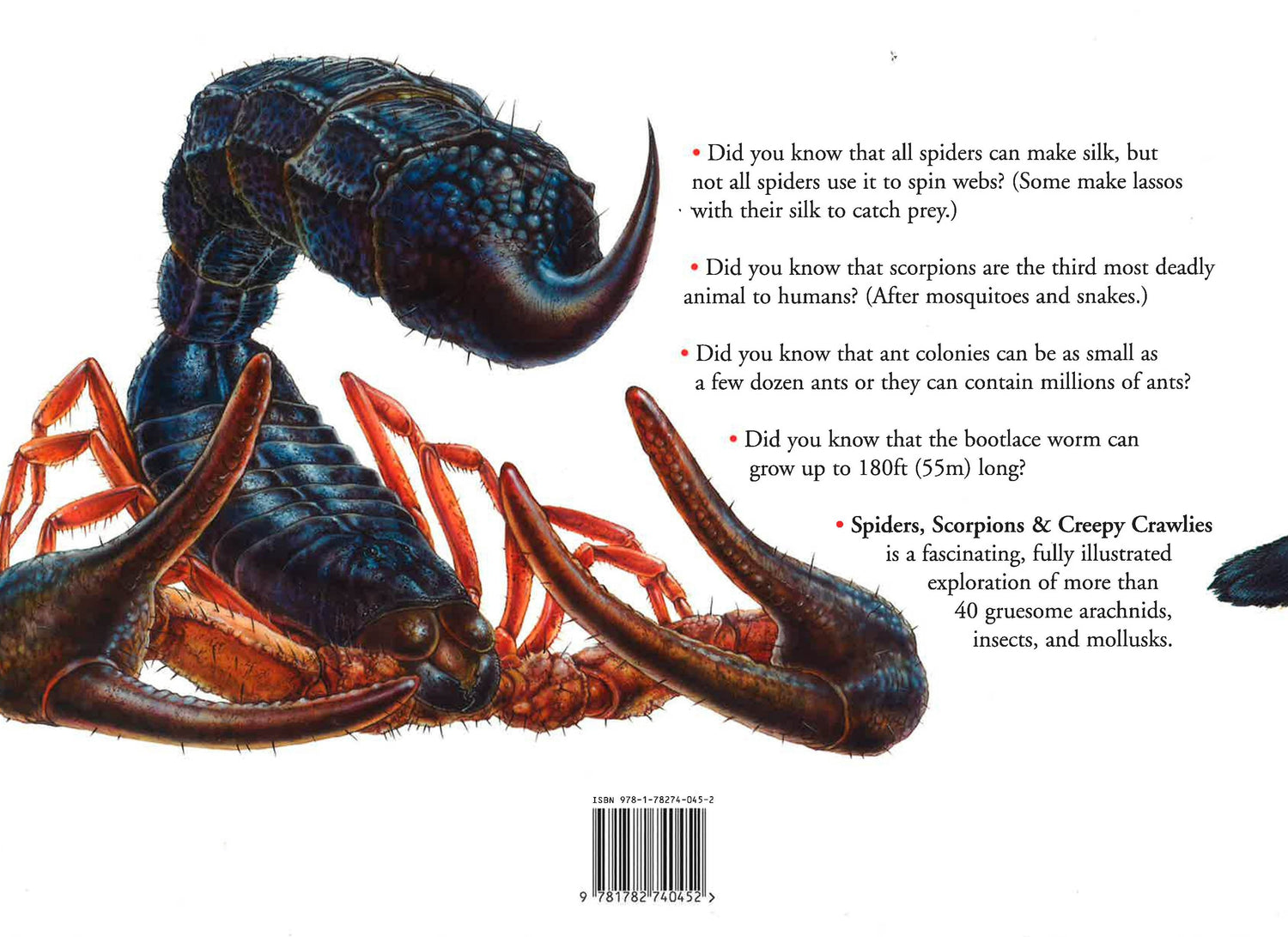 Did you know that all spiders can make silk, but not all spiders use it to spin webs? (Some make lassos with their silk to catch prey.) Did you know that scorpions are the third most deadly animal to humans (after mosquitoes and snakes)? Did you know that the bootlace worm can grow up to 180ft (55m) long? From the black widow spider and trapdoor spider to the slavemaker ant and the death walker scorpion, Spiders, Scorpions & Creepy Crawlies takes the reader on a fascinating journey into a world which can be as distant as remote tropical climates or as close as our own beds. Each of the 43 featured creatures is illustrated with a large, full-colour artwork and accompanied by colour photographs, easy-to-follow text, locator maps and boxes packed with educational information. With insects, arachnids and molluscs carefully drawn from tropical, desert and temperate climates, this engaging and accessible volume reveals the secrets of some of nature?s strangest and most colourful animals.