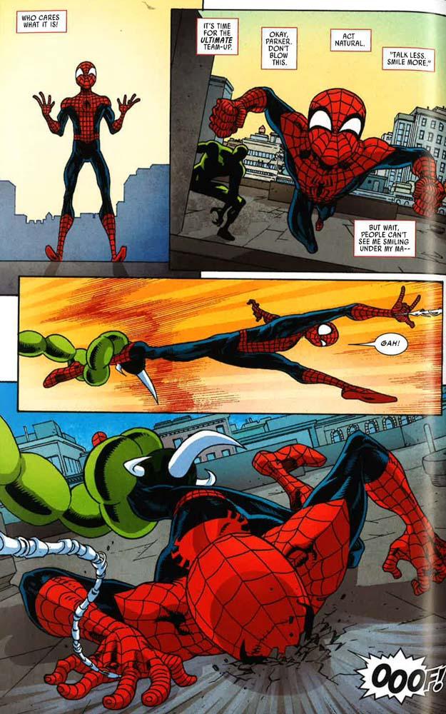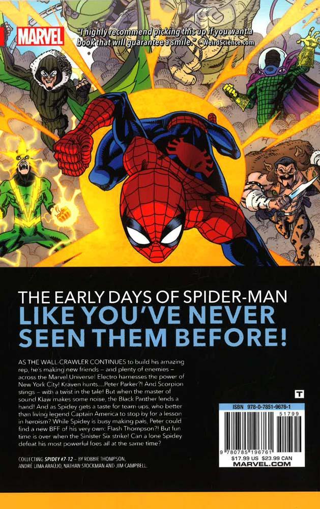 A second dose of Robbie Thompson looking back at Peter Parker’s high school days is very welcome. Thompson nails the sympathetic mixture of Parker doing right, but somehow never quite managing to have things go his way, yet his spirit is never permanently dampened. In First Day Thompson opened and closed most stories with Peter Parker, but beyond that there wasn’t much of a role for his supporting cast. That barely changes. The possibility of a relationship with Gwen Stacey remains in two steps forward one step back territory, while Aunt May is barely seen beyond one great heart-touching scene. At least there’s a few good J. Jonah Jameson moments this time. The lack of interaction would disappoint if Thompson weren’t so strong on the Spider-Man action. While taking the occasional plot point from the 1960s run, he otherwise distances these stories from that other than the expected use of Spider-Man’s villains. A plot thread referenced in most chapters is the villains uniting as the Sinister Six, and that pays off nicely in the final story. There are also guest starring roles for the Black Panther and Captain America, his being the better piece as Thompson addresses the idea of Spider-Man’s heroics always being misinterpreted as menacing.