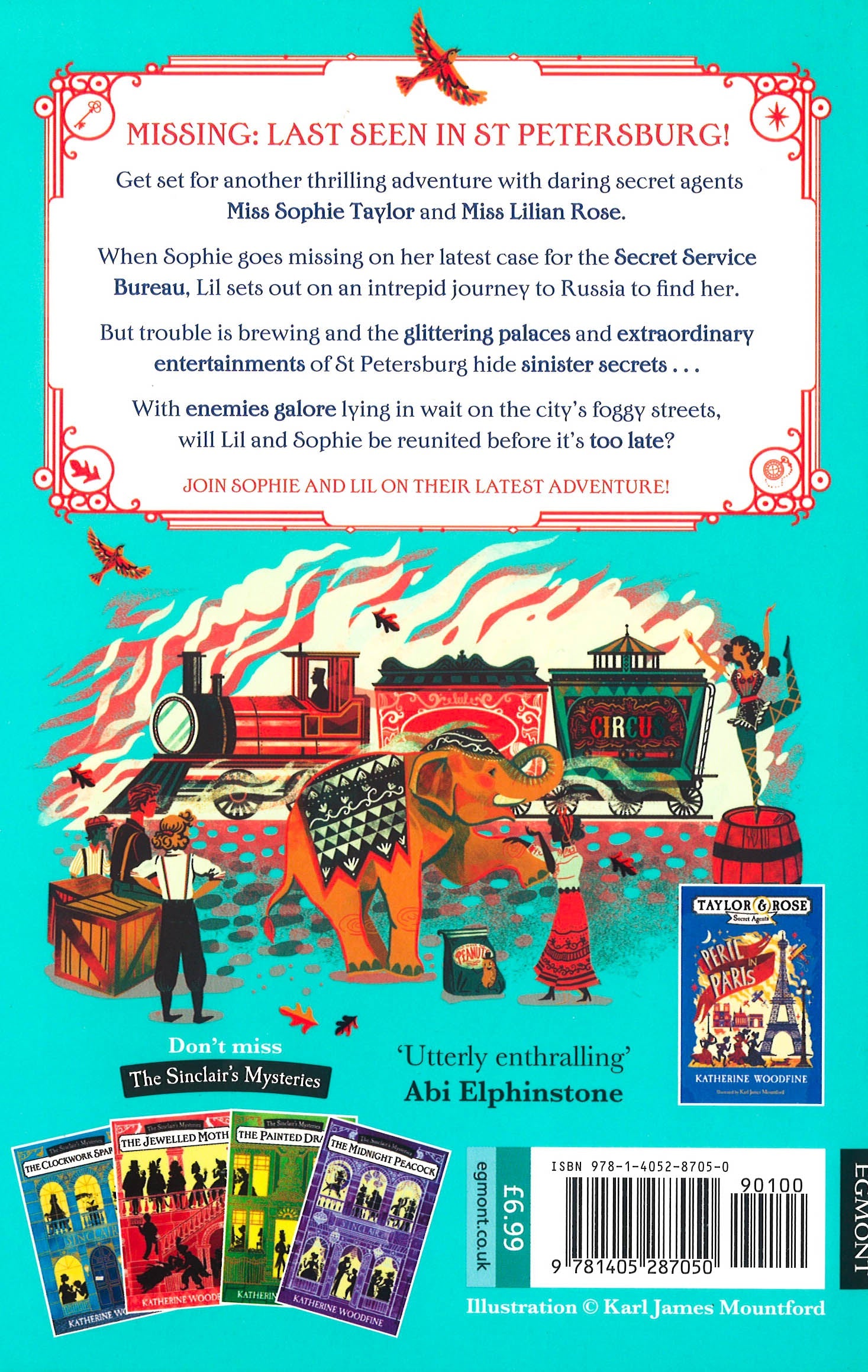 With Sophie still missing in action after their explosive mission in Paris, Lil decides to take matters into her own hands. On a new mission for the Secret Service Bureau, can Lil find Sophie in misty, mysterious St Petersburg? Can they uncover the identity of their true enemy and can they trust anyone - even the Bureau? It's time for Sophie and Lil to put their spy skills to the test. Read the first book in the TAYLOR AND ROSE SECRET AGENTS series: PERIL IN PARIS Don't miss The SINCLAIR'S MYSTERIES series: THE CLOCKWORK SPARROWTHE JEWELLED MOTHTHE PAINTED DRAGONTHE MIDNIGHT PEACOCK Perfect for fans of Robin Stevens' Murder Most Unladylike series, Katherine Rundell and Emma Carroll.