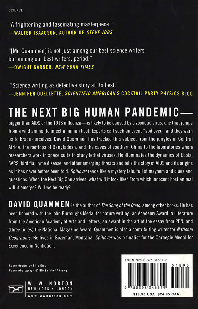 In 2020, the novel coronavirus gripped the world in a global pandemic and led to the death of hundreds of thousands. The source of the previously unknown virus? Bats. This phenomenon-in which a new pathogen comes to humans from wildlife-is known as spillover, and it may not be long before it happens again. Prior to the emergence of our latest health crisis, renowned science writer David Quammen was traveling the globe to better understand spillover's devastating potential. For five years he followed scientists to a rooftop in Bangladesh, a forest in the Congo, a Chinese rat farm, and a suburban woodland in New York, and through high-biosecurity laboratories. He interviewed survivors and gathered stories of the dead. He found surprises in the latest research, alarm among public health officials, and deep concern in the eyes of researchers. Spillover delivers the science, the history, the mystery, and the human anguish of disease outbreaks as gripping drama. And it asks questions more urgent now than ever before: From what innocent creature, in what remote landscape, will the Next Big One emerge? Are pandemics independent misfortunes, or linked? Are they merely happening to us, or are we somehow causing them? What can be done? Quammen traces the origins of Ebola, Marburg, SARS, avian influenza, Lyme disease, and other bizarre cases of spillover, including the grim, unexpected story of how AIDS began from a single Cameroonian chimpanzee. The result is more than a clarion work of reportage. It's also the elegantly told tale of a quest, through time and landscape, for a new understanding of how our world works-and how we can survive within it.