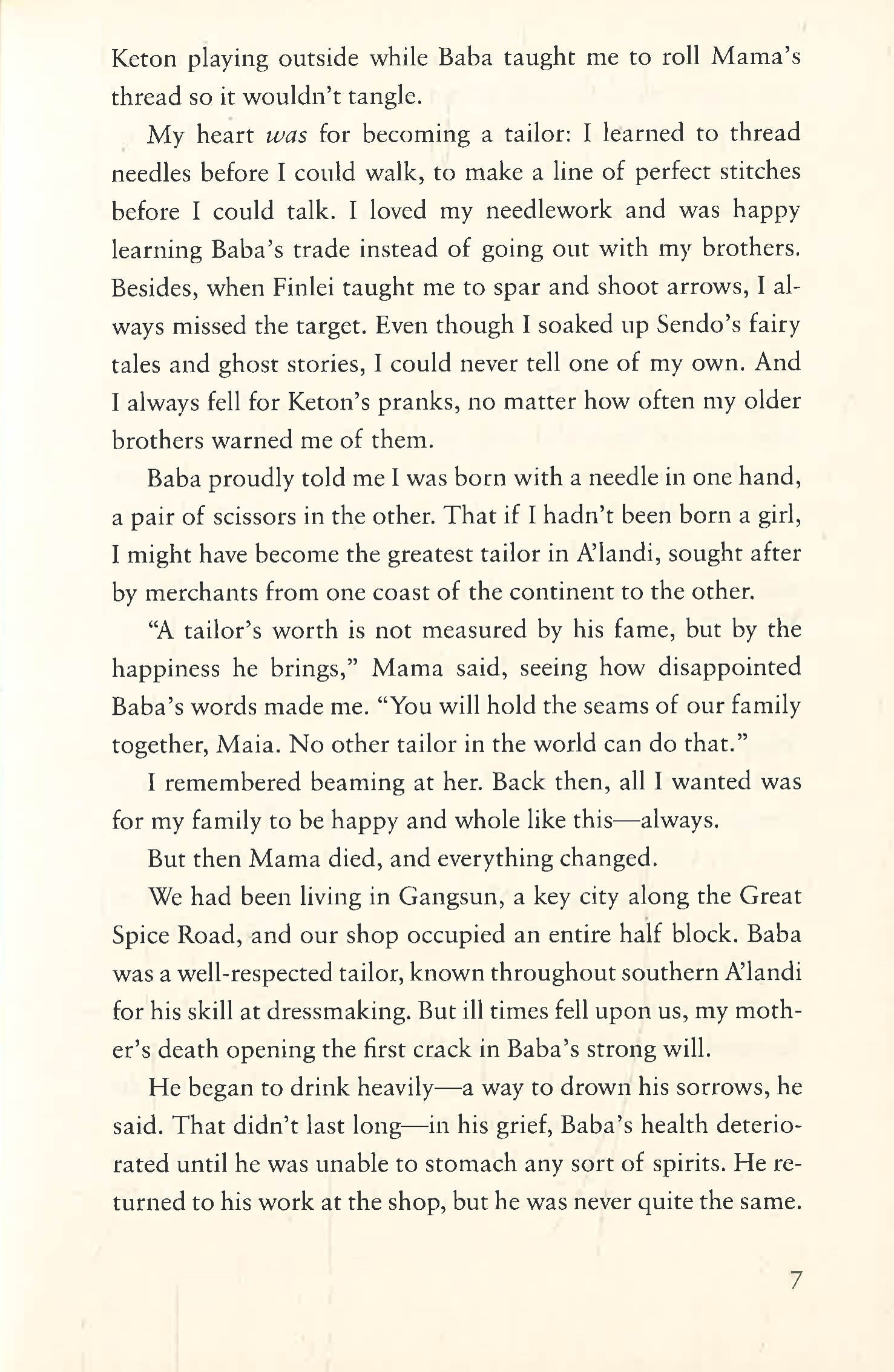 On the fringes of the Great Spice Road, Maia Tamarin dreams of becoming the greatest tailor in the land - but as a girl, the best she can hope for is to marry well. Then a royal messenger summons her ailing father to court, and Maia seizes her chance. Disguised as a man, she travels to the Summer Palace in her father's place to compete for the emperor's favour, and the coveted position of imperial tailor.