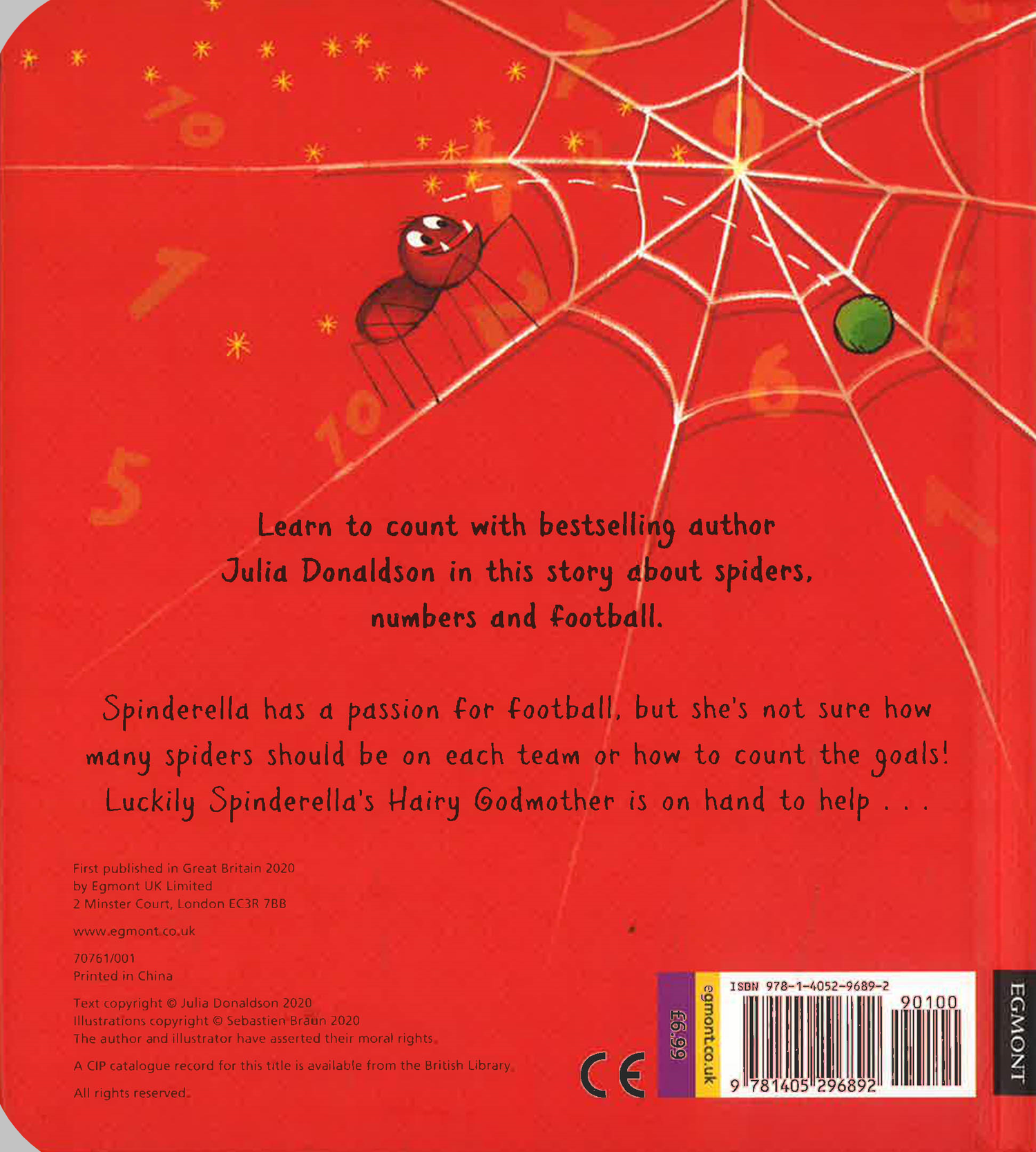 The no. 1 bestselling football and counting story, from multi-award-winning former Children's Laureate Julia Donaldson, author of The Gruffalo! Spinderella the spider has a passion for football. She tries to play a match with her brothers and sisters but she doesn’t know how many spiders should be on each team. Even worse, she can’t count the goals! Luckily for Spinderella, her Hairy Godmother has a plan … Football, spiders and counting – what's not to love! The perfect picture book for children of all ages – boys and girls alike.