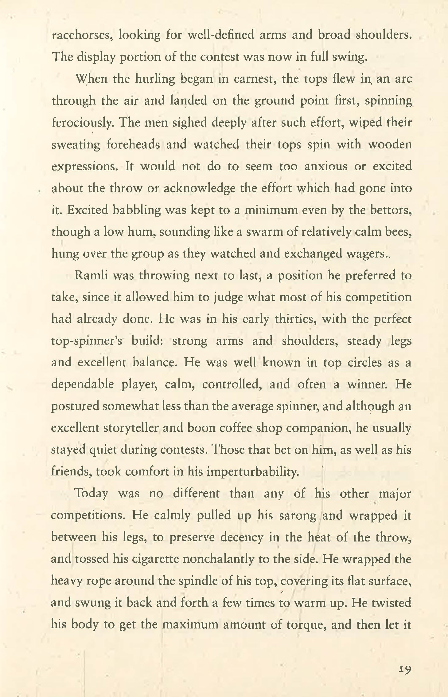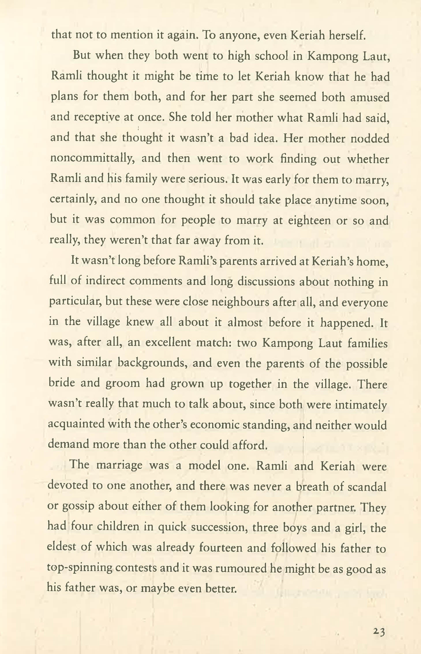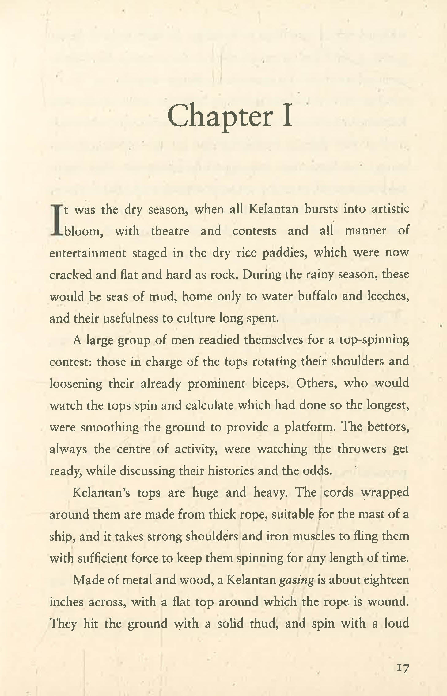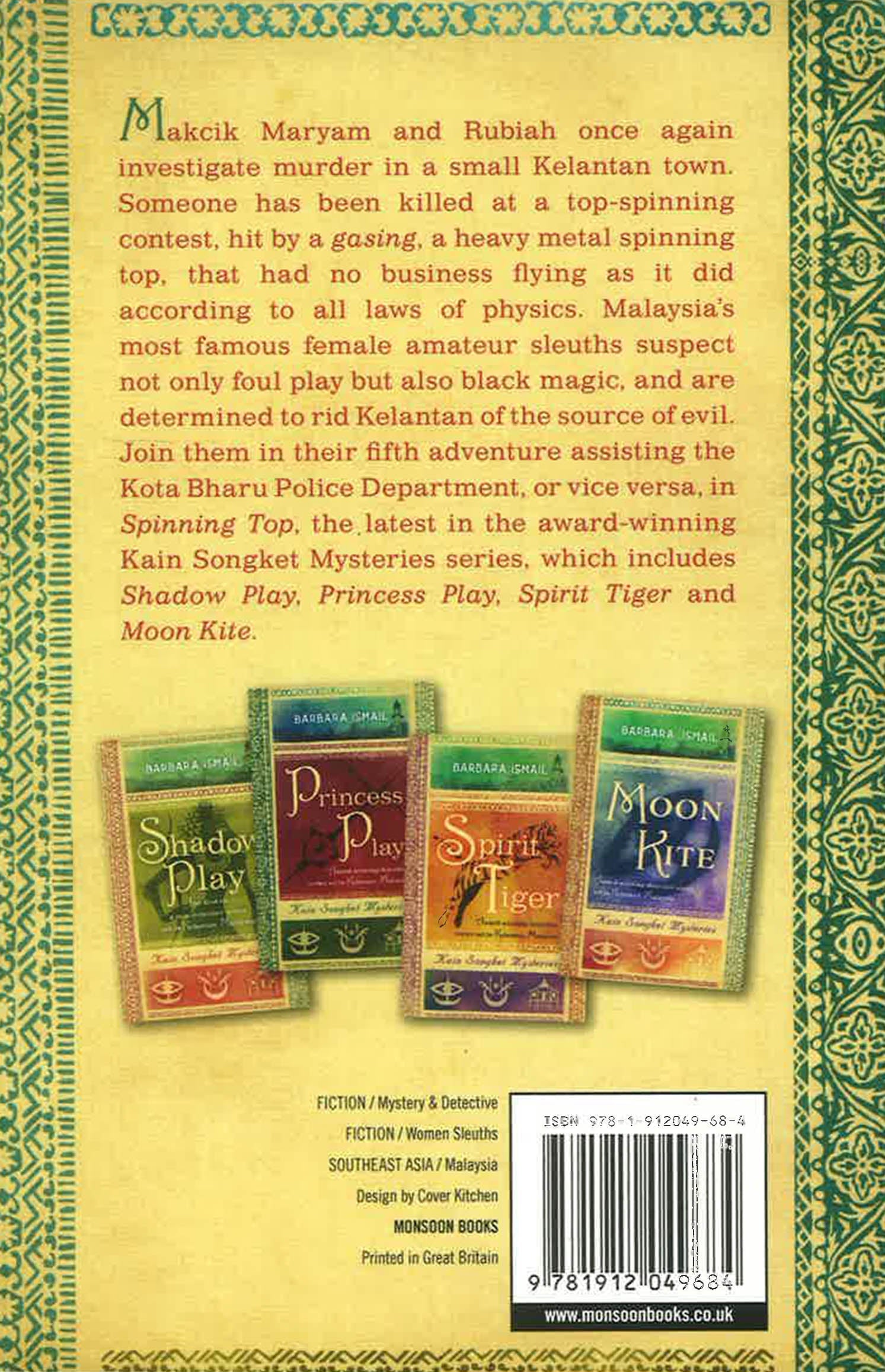 It was the dry season, when all Kelantan bursts into artistic bloom, with theatre and contests and all manner of entertainment staged in the dry rice paddies, which were now cracked and flat and hard as rock. A large group of men readied themselves for a top spinning contest: those in charge of the tops rotating their shoulders and loosening their already prominent biceps. Others, who would watch the tops spin and calculate which had done so the longest, were smoothing the ground to provide a platform. The bettors, always the centre of activity, were watching the throwers get ready, while discussing their histories and the odds. Ramli, throwing next to last, was well known in top circles as a dependable player, calm, controlled and often a winner. Today was no different than any of his other major competitions. He calmly pulled up his sarong and wrapped it between his legs, to preserve decency in the heat of the throw, and tossed his cigarette nonchalantly to the side. He wrapped the heavy rope around the spindle of his top, covering its flat surface, and swung it back and forth a few times to warm up. He twisted his body to get the maximum amount of torque, and then let it fly with a mighty heave. As it never had before in all his years of throwing, it skidded over the platform and scored a bullseye on the head of a squatting onlooker, killing him instantly. In Spinning Top, volume five in the Kain Songket Mysteries, Aunty Maryam takes on what at first appears to be a straightforward case of accidental death but she knows that nothing in Kelantan is what it seems and another murder investigation is afoot.