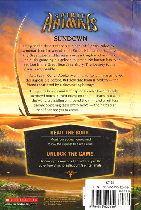 Deep in the desert there sits an oasis, ruled by a monarch named Cabaro, the Great Lion, and he reigns over a kingdom of animals. No human has ever set foot in the Great Beast's territory. As a team, Conor, Abeke, Meilin, and Rollan have achieved the impossible before. But now that team is broken-the friends scattered by a devastating betrayal. Deep in the desert there sits a beautiful oasis, ruled by a monarch unlike any other in Erdas. His name is Cabaro, the Great Lion, and he reigns over a kingdom of animals, jealously guarding his golden talisman. No human has ever set foot in the Great Beast's territory. The journey to his oasis is impossible. As a team, Conor, Abeke, Meilin, and Rollan have achieved the impossible before. But now that team is broken-the friends scattered by a devastating betrayal. The young heroes and their spirit animals have already sacrificed much in their quest for the talismans. But with the world crumbling all around them-and a ruthless enemy opposing their every move-their greatest sacrifices are yet to come Part engrossing book series, part action role-playing game - discover your spirit animal and join the adventure.