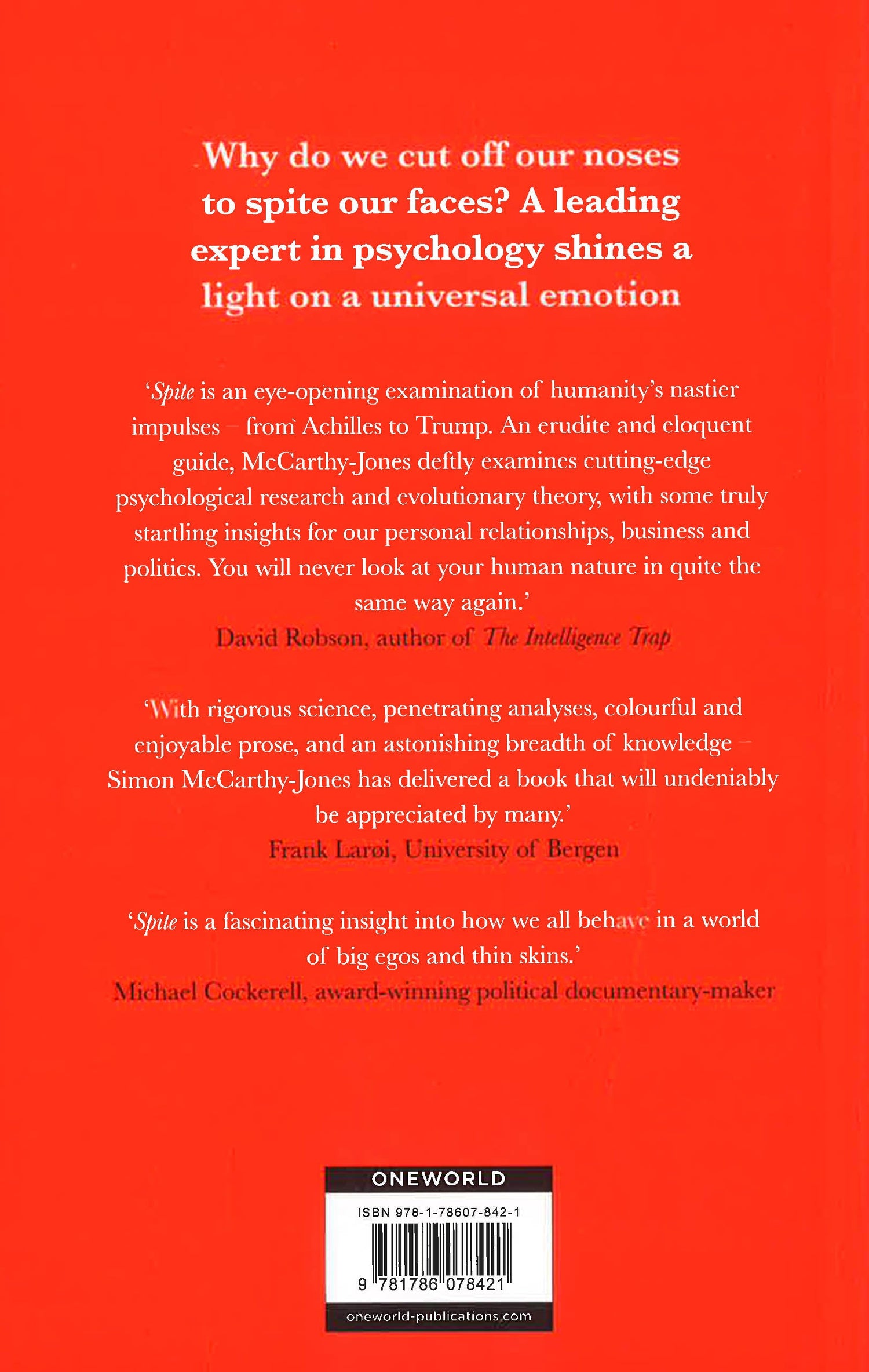 Have you ever done something stupid, dangerous or self-sabotaging just to get one over someone else? Most of us have. Simon McCarthy-Jones draws on psychology, current affairs, literature and genetics to illuminate – whether we admit it or not – our spiteful side. What is that part of us that secretly wants our friends to fail? Did Americans put Trump in the White House just to stick it to Hillary Clinton? And then there are the legion of stories about toxic behaviour in supermarkets and over the privet hedge, ramping up to incendiary divorces, vicious business practices, backbiting politics and scorched-earth terrorism.