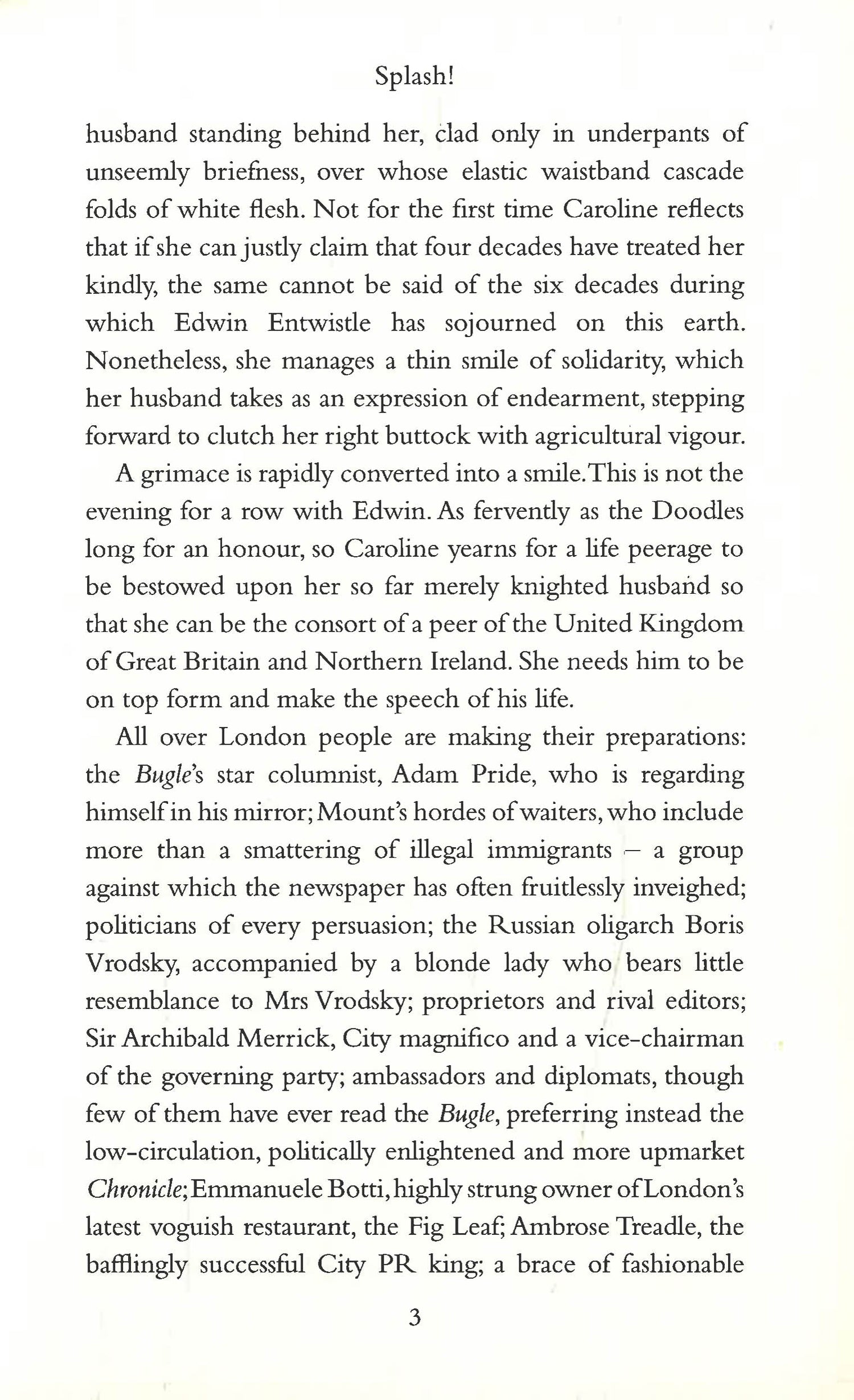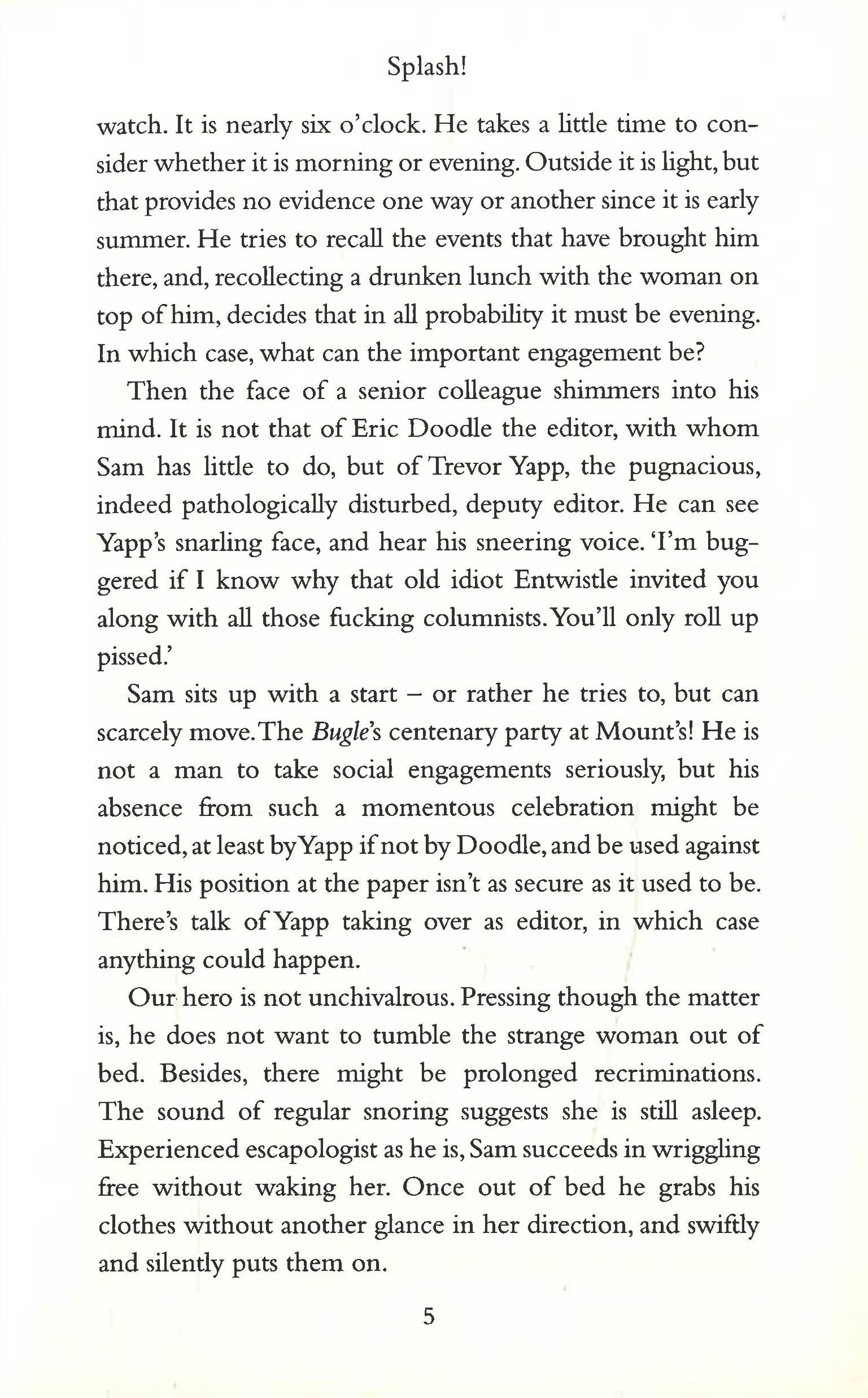 I thoroughly enjoyed Splash! It's a delicious confection of excellent plotting, an inventively bonkers cast of characters, subtle insights into the world of newspapers and a satisfying ending which invokes the great Evelyn Waugh's masterpiece, Scoop. A fine comedy of manners by a writer who knows the media inside out' BEL MOONEYSam Blunt is a drunken, broken-down tabloid reporter, working for a once-mighty newspaper struggling to come to terms with the digital age. With the assistance of Benedict, an earnest though clever wet-behind-the-ears young intern on the paper, Sam grapples to uncover the story of the century which reveals the political corruption and cynicism at the heart of a rotten Establishment.As they try to nail the story amid a series of capers, Sam and Benedict are frustrated by the self-serving proprietor of the Daily Bugle, various self-appointed do-gooders who want to rein in the Press, and Trevor Yapp, the malign and untrustworthy editor of Bugle Online. Splash! is a satire of the Press and politics in a modern London peopled by a Chinese billionaire would-be press proprietor, a worldly bishop, neglected immigrants, a corrupt and plaintive Prime Minister, and journalists who are often most interested in doing one another down.Yet however self-serving newspapers may sometimes be, Sam and Benedict are ultimately on the side of the angels as they battle to write their triumphant story.
