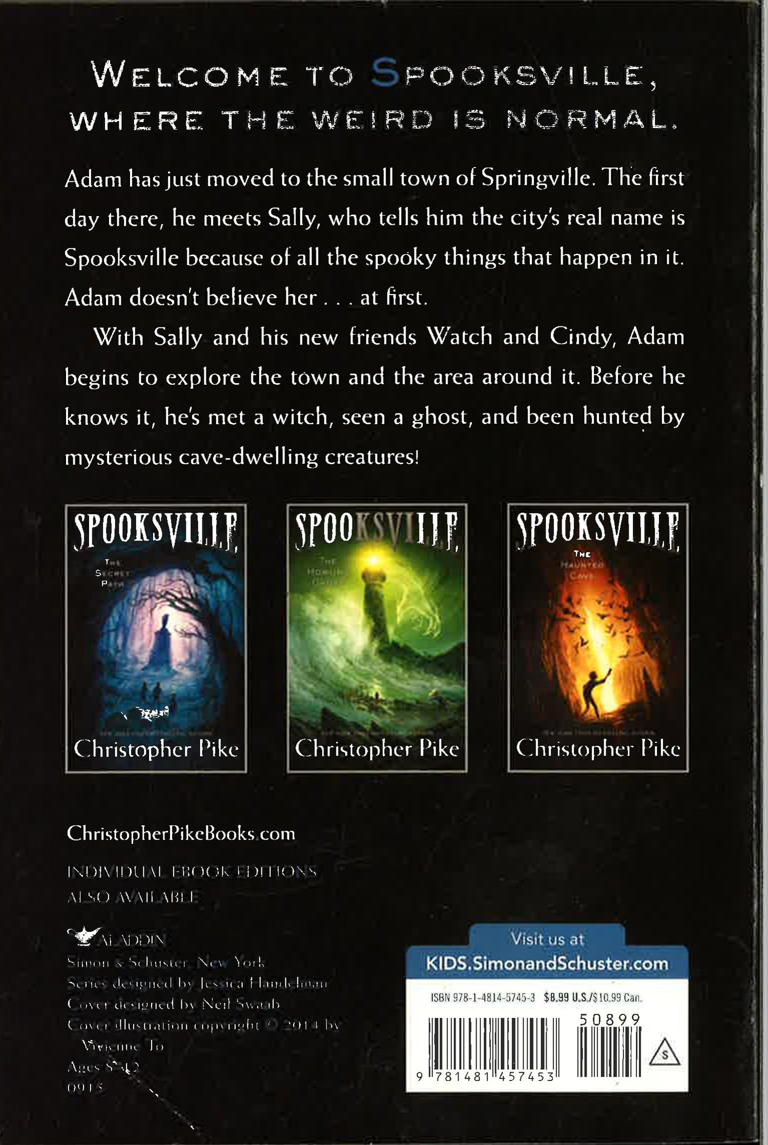 Welcome to Spooksville, where weird is normal. This paperback bind-up includes the first three books in New York Times bestselling author Christopher Pike’s Spooksville series.Adam has just moved to the small town of Springville. The first day there, he meets Sally, who tells him the city’s real name is Spooksville, because of all the spooky things that go on in it. Adam doesn’t believe her . . . at first.With Sally and his new friends, Watch and Cindy, Adam begins to explore the town and the area around it. Before he knows it, he’s met a witch, seen a ghost, and been hunted by mysterious cave-dwelling creatures!This paperback edition contains the first three Spooksville books: The Secret Path, The Howling Ghost, and The Haunted Cave.