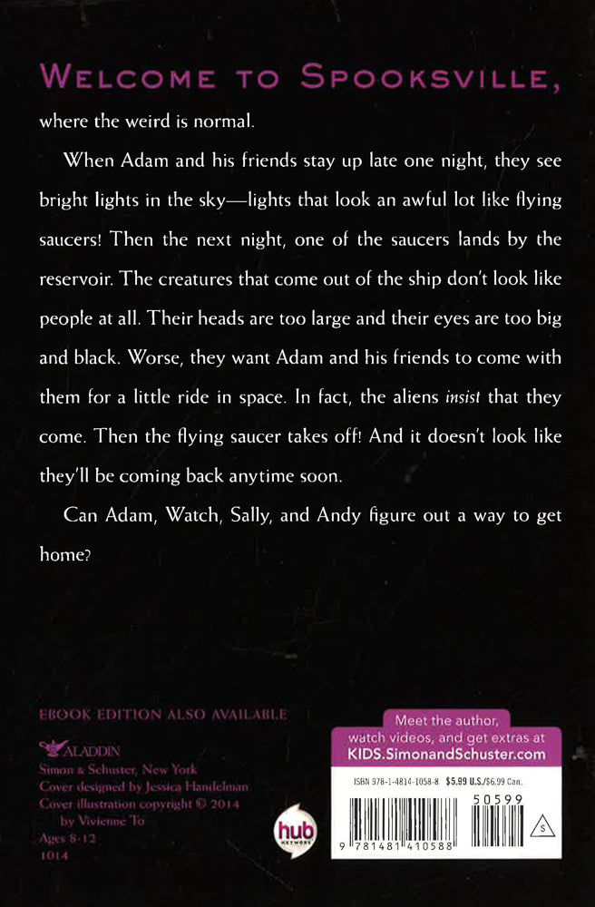 When Adam and his friends stay up late one night, they see bright lights in the sky. Lights that look suspiciously like flying saucers. Then, the next night, one of the saucers lands by the reservoir, and the creatures who come out of the ship don’t look like people at all. Their heads are too large, and their eyes are too big and black. Worse, they want Adam and his friends to come with them for a little ride in space. In fact, the aliens insist that they come. They practically drag the kids into their ship. Then the flying saucer takes off! And it doesn’t look like they'll be coming back anytime soon. Can Adam and his friends figure out a way to get home?