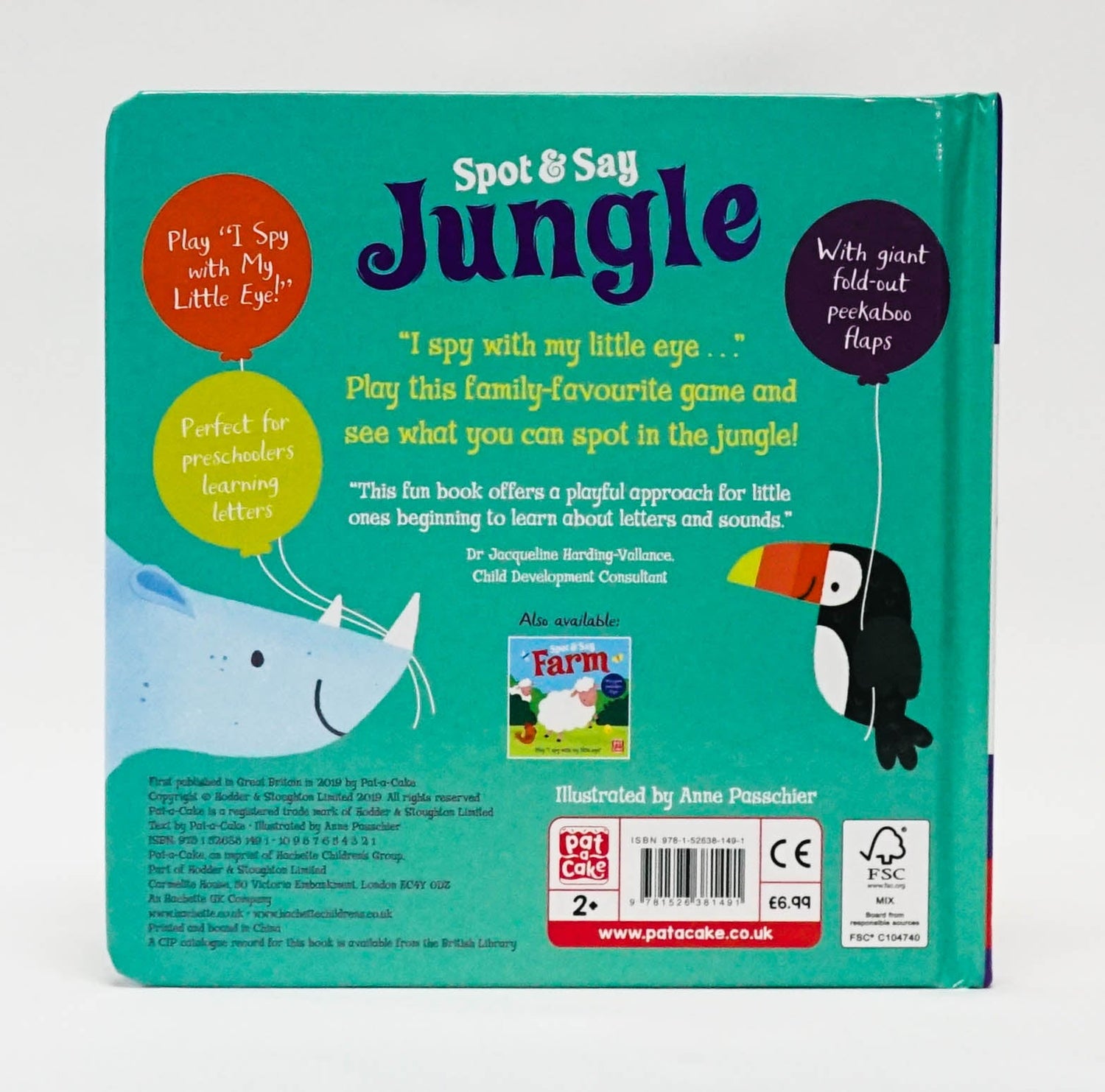The family favourite game 'I Spy' is brought to life in this fun book - can you spot the tiger in the jungle? Giant peek-through flaps offer clues to help guessing, and there are lots of other animals to spot, too.Charming, bright illustrations will entice preschoolers who are exploring their new fascination with letters and sounds, and the sturdy peekaboo flaps will bring hours of fun! Perfect for learning essential skills through play.Also available: Spot and Say: Farm