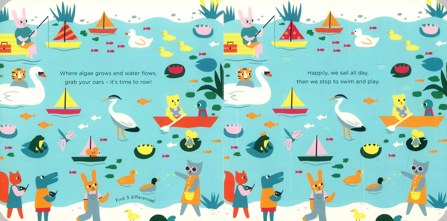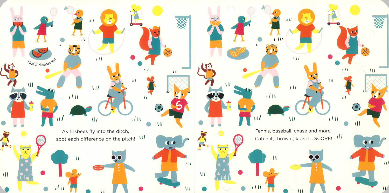 Spot the difference in every side-by-side outdoor scene as you explore the park with a whole host of cute characters. From the dog park to the lake to the flower garden, there's plenty waiting to be found. What looks different? Lift the flaps to see if you got it right! This interactive Spot the Difference park adventure features five lift-flaps on each stylishly illustrated spread, accompanied by a sweet rhyming text. This brilliant new novelty series teaches young children recognition and visual acuity skills, featuring: patterns, colours, shapes, missing items, animals, food and items of clothing.