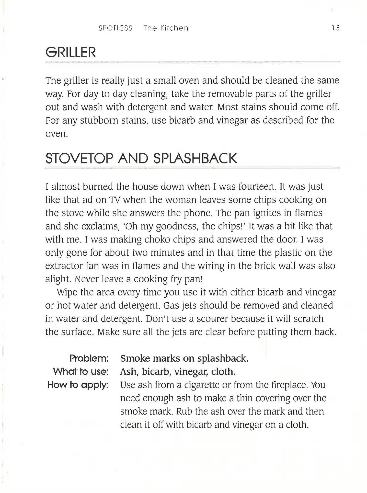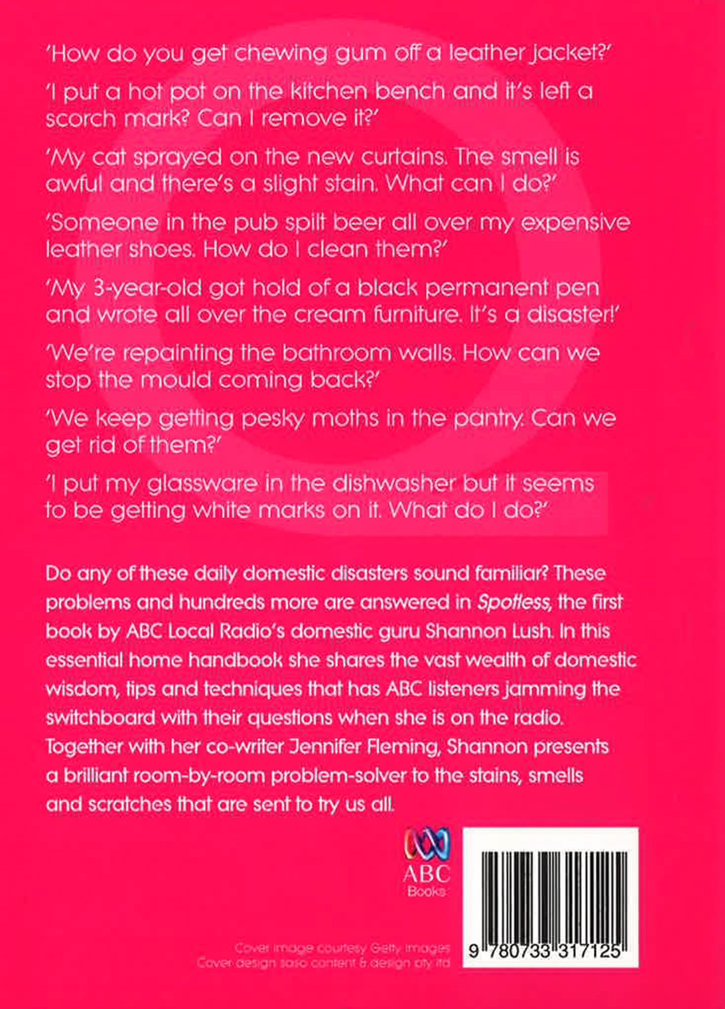 Room-by-Room solutions to domestic disasters SPOtLESS is the essential book for the kitchen bookshelf. Each chapter addresses the stains, cleaning and household problems that may come about in each room of the house: the kitchen, laundry, bathroom, bedroom, children's room - even outdoors on a deck or a patio. Filled with easy, do-it-yourself solutions, handy hints, examples and ABC Radio listeners' questions and comments, SPOtLESS will be referred to again and again and again. 'How do you get chewing gum off a leather jacket?' 'I put a hot pot on the kitchen bench and it's left a scorch mark, can I remove it?' 'My cat sprayed on the new curtains. the smell is awful and there's a slight stain. What can I do?' 'Someone in the pub spilt beer all over my expensive leather shoes. How do I clean them?' 'My 3-year-old got hold of a black permanent pen and wrote all over the cream furniture. It's a disaster!' 'We're repainting the bathroom walls. How can we stop the mould coming back?' 'We keep getting pesky moths in the pantry. Can we get rid of them?' 'I put my glassware in the dishwasher but it seems to be getting white marks on it. What do I do?'