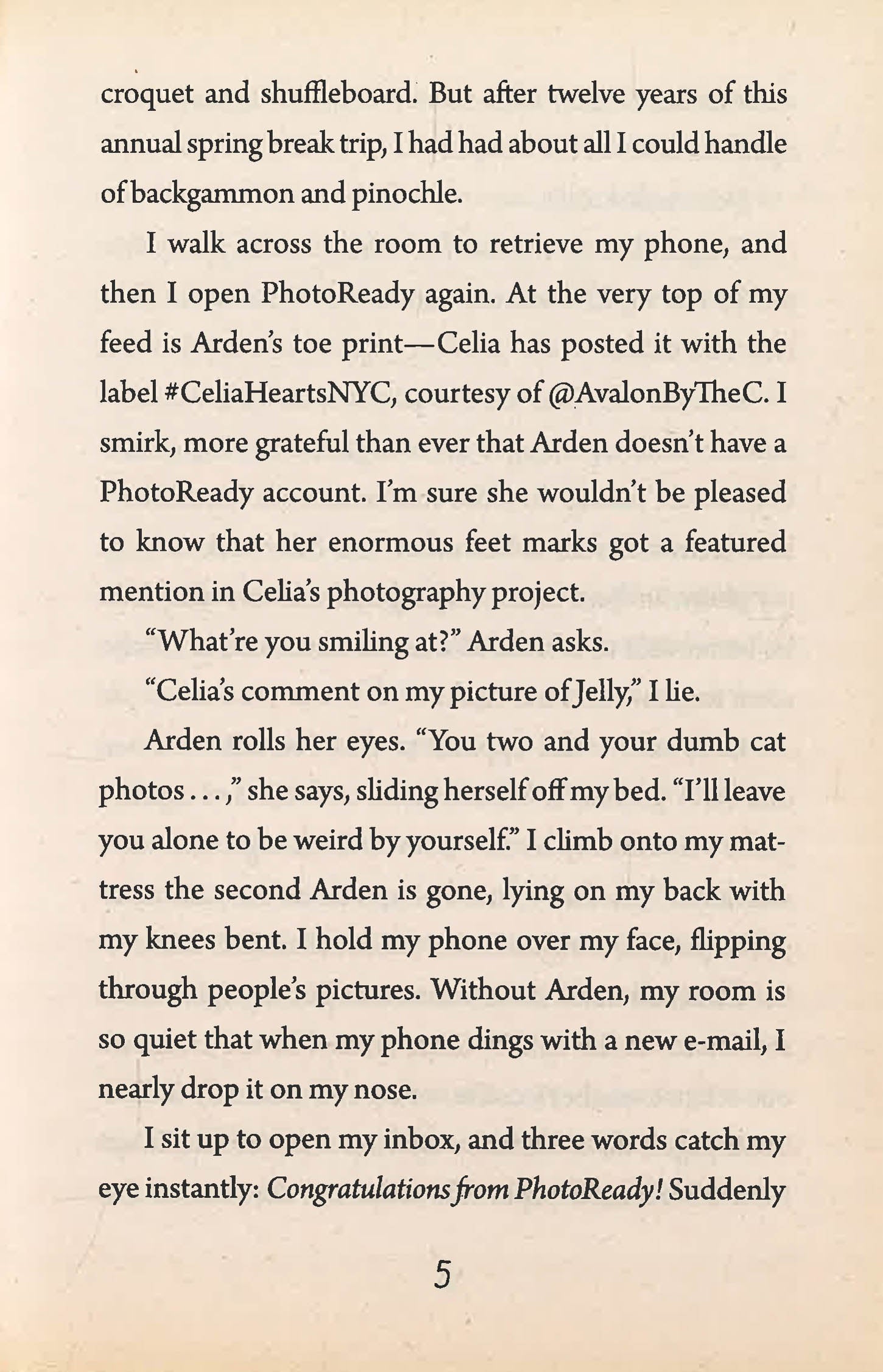 After years of suffering through the most boring spring vacations ever, Avalon Kelly is ready for a week of adventure. On a hash-tagged whim, she entered the PhotoReady app’s spring break getaway contest to NYC - and won!But right away, this trip of a lifetime isn’t turning out as planned. Avalon’s best friend isn’t one of the PhotoReady winners, which means that not only will Avalon have to venture to the Big Apple by herself, but she’ll be assigned a stranger as a roommate. The perky and talkative Sofia seems pleasant enough, but snooty Kensington - who was placed in Room 609 at the last moment due to a mix-up - is a whole other story.Just when Avalon is about ready to abandon the trip entirely, one of the fellow contest winners, the cute and mysterious Tate, disappears from the group, and the Room 609 girls must band together, using the clues within their photographs, if they have any hope of tracking him down. Will the hunt for Tate and the view of New York City through her camera lens be enough to convince Avalon to stick it out for the full week?