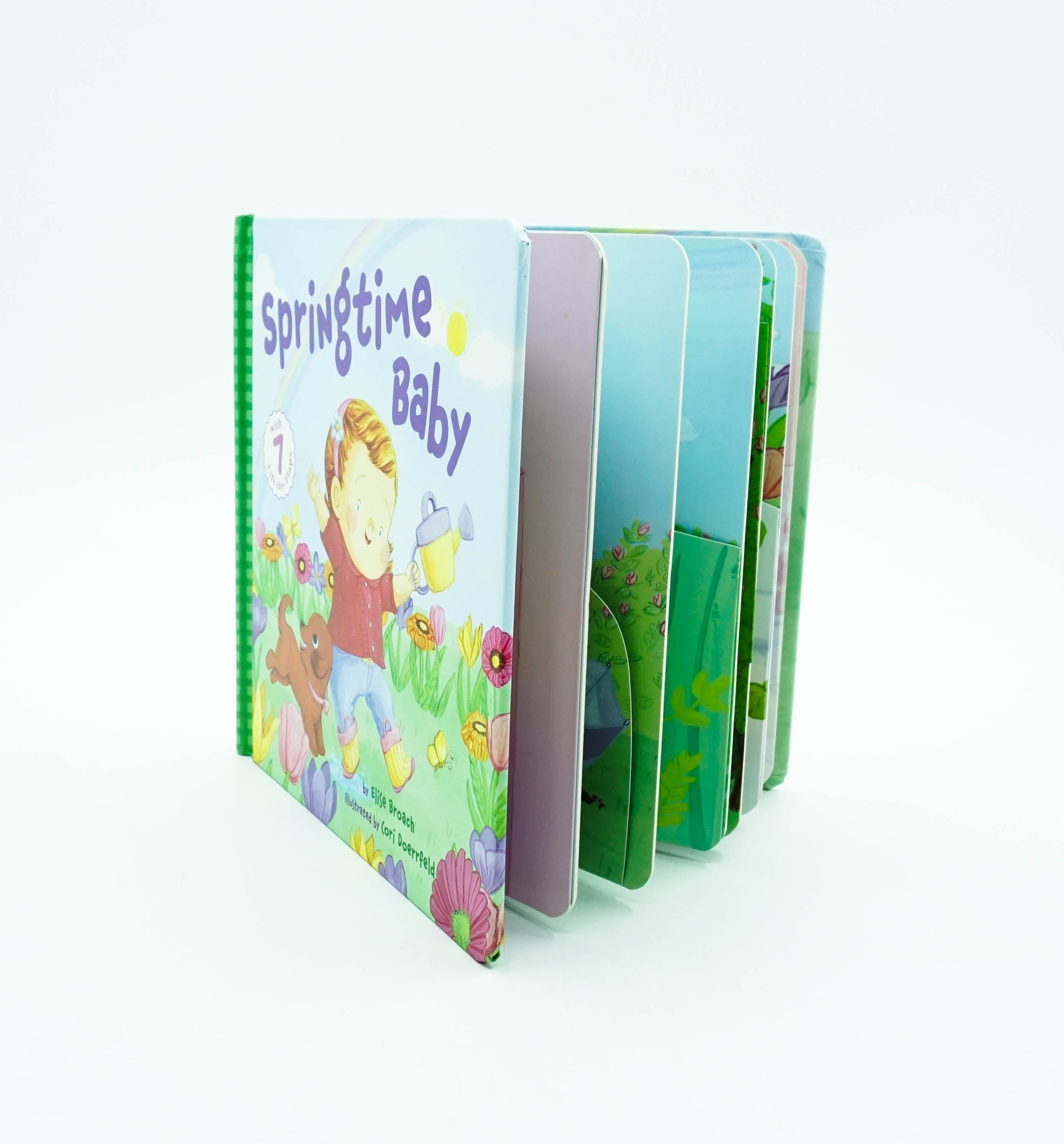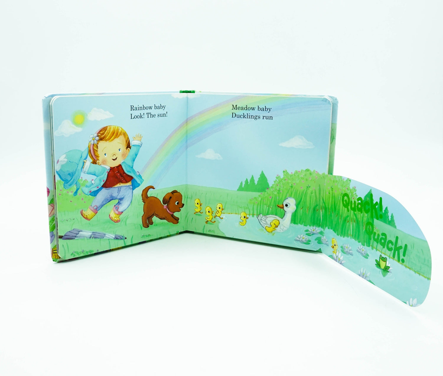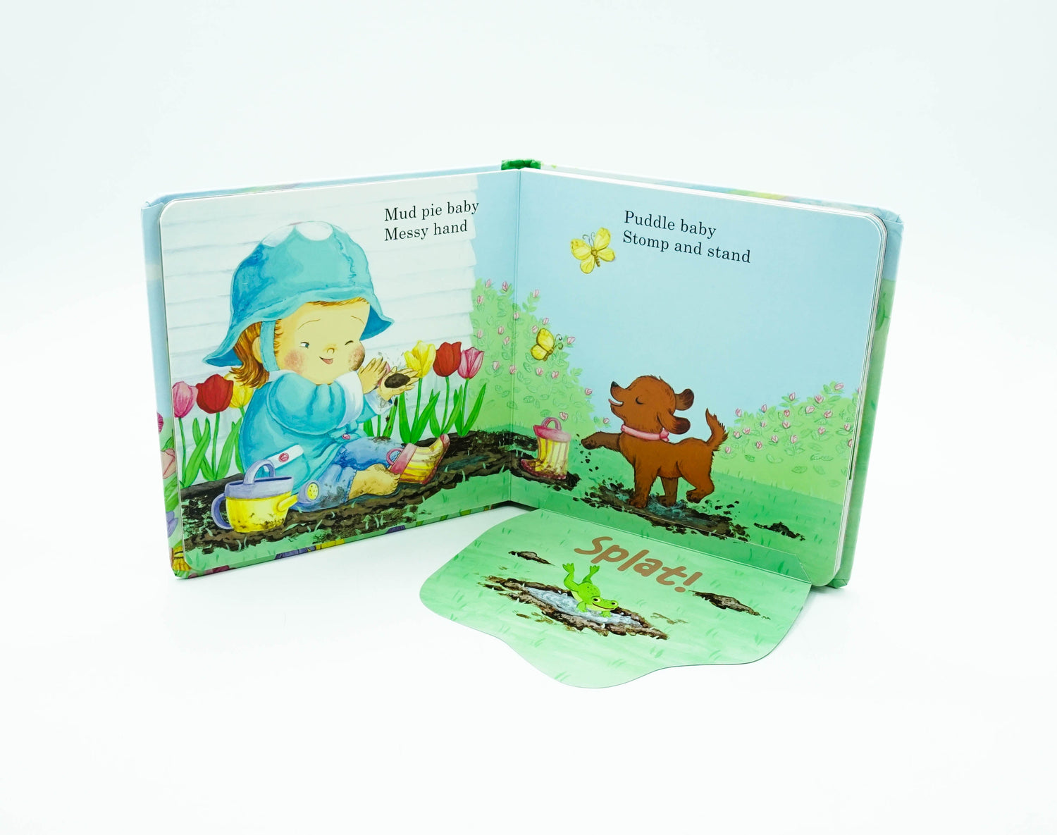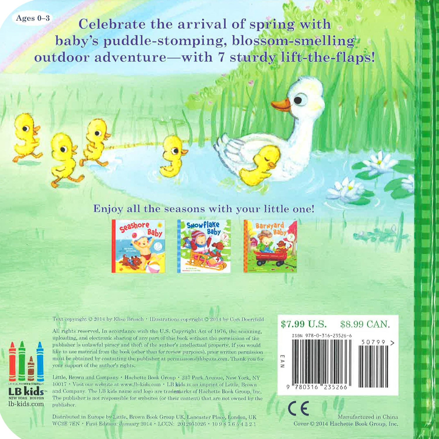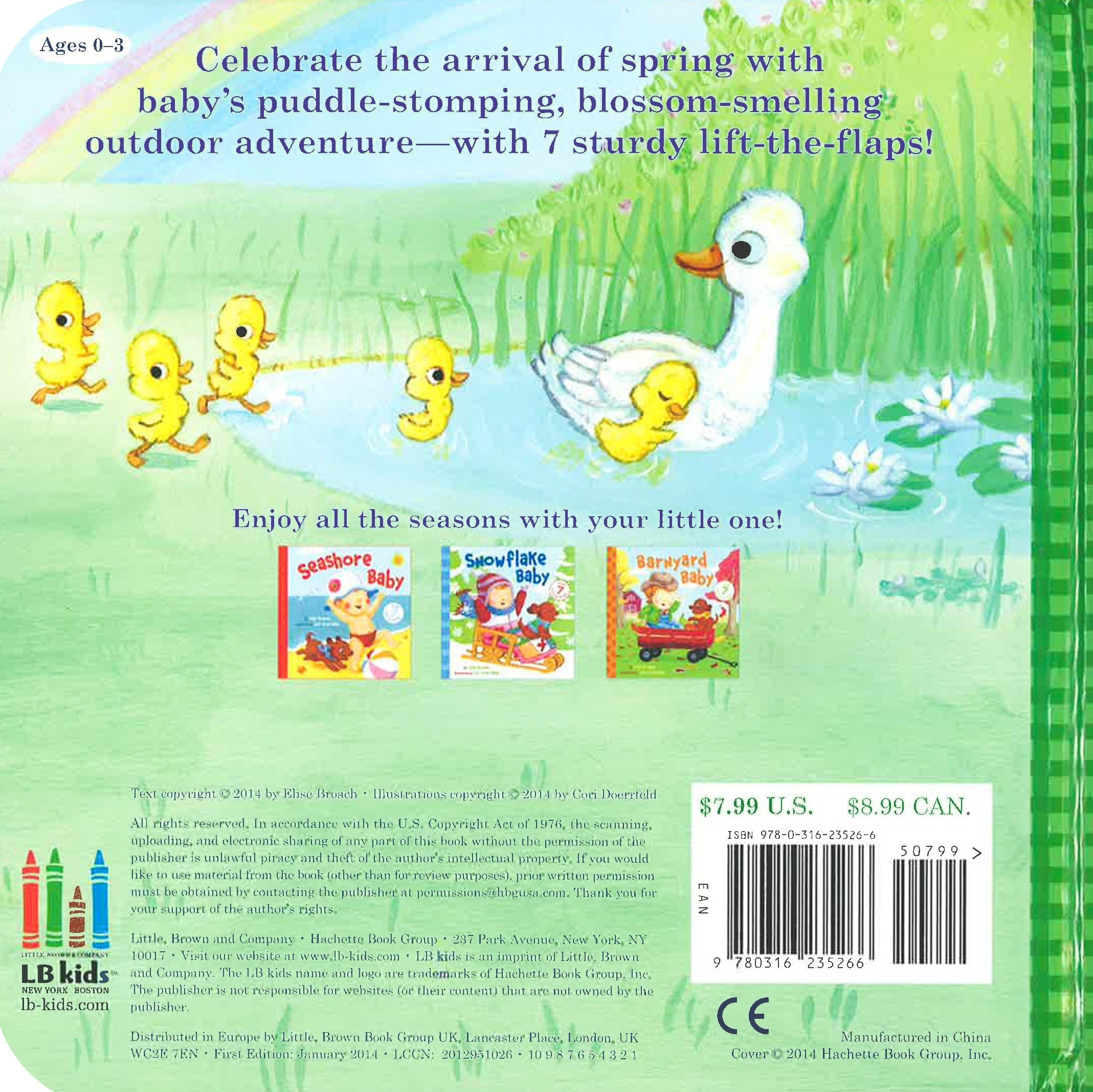 Little ones will love to join baby on a fun-filled spring day. The adventure begins with some mudpie-making and puddle-stomping, followed by sunshine, a rainbow and gorgeous, sweet smelling blossoms. All the favorite springtime creatures, from ducklings to butterflies, share a splendid day with our springtime baby! This interactive novelty board book features large lift-the-flaps on each spread, hiding charming surprises underneath.