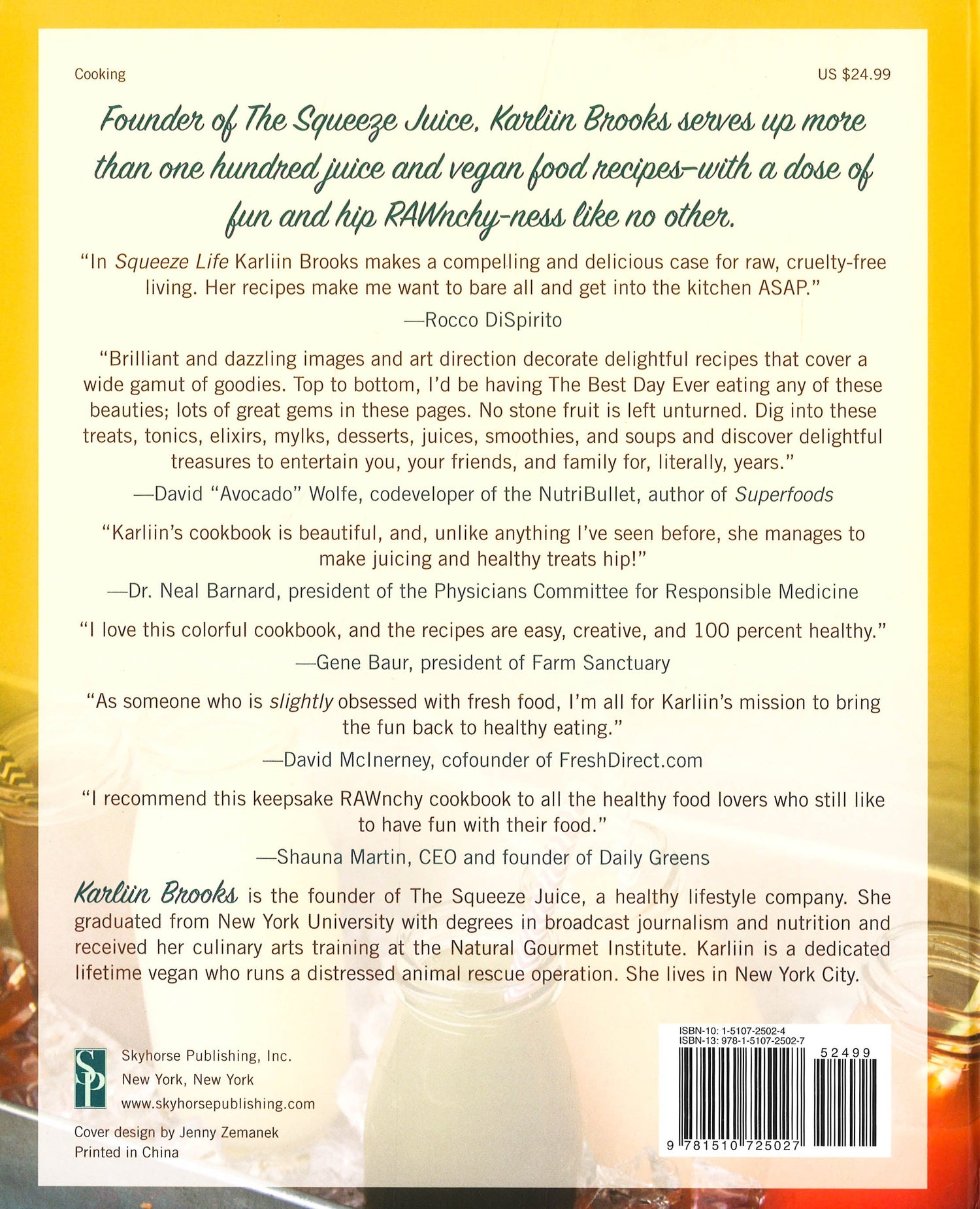 Cleanse your mind of all the outdated granola clichés about livin’ raw and get ready to feel good (and yes, look even better!). The Squeeze features more than one hundred juice and snack recipes, along with completely customizable cleanses for you to choose from. Karliin’s nutrient-packed, lip-smacking juice recipes such as “I Have a Heart-On” and “Kale the Pain Away” are bound to get your blood pumping in all the right ways. And there are snacks! “Jalapeño (Dirty) POPS,” “I Want Candy,” and “Raspberry-Chia Fruit Roll Up” are totally raw, vegan, and comforting parts of your detox. Karliin strongly believes that “diets” (ewww) don’t work, so instead she will teach you how to adopt new habits to help you live happy and healthy.