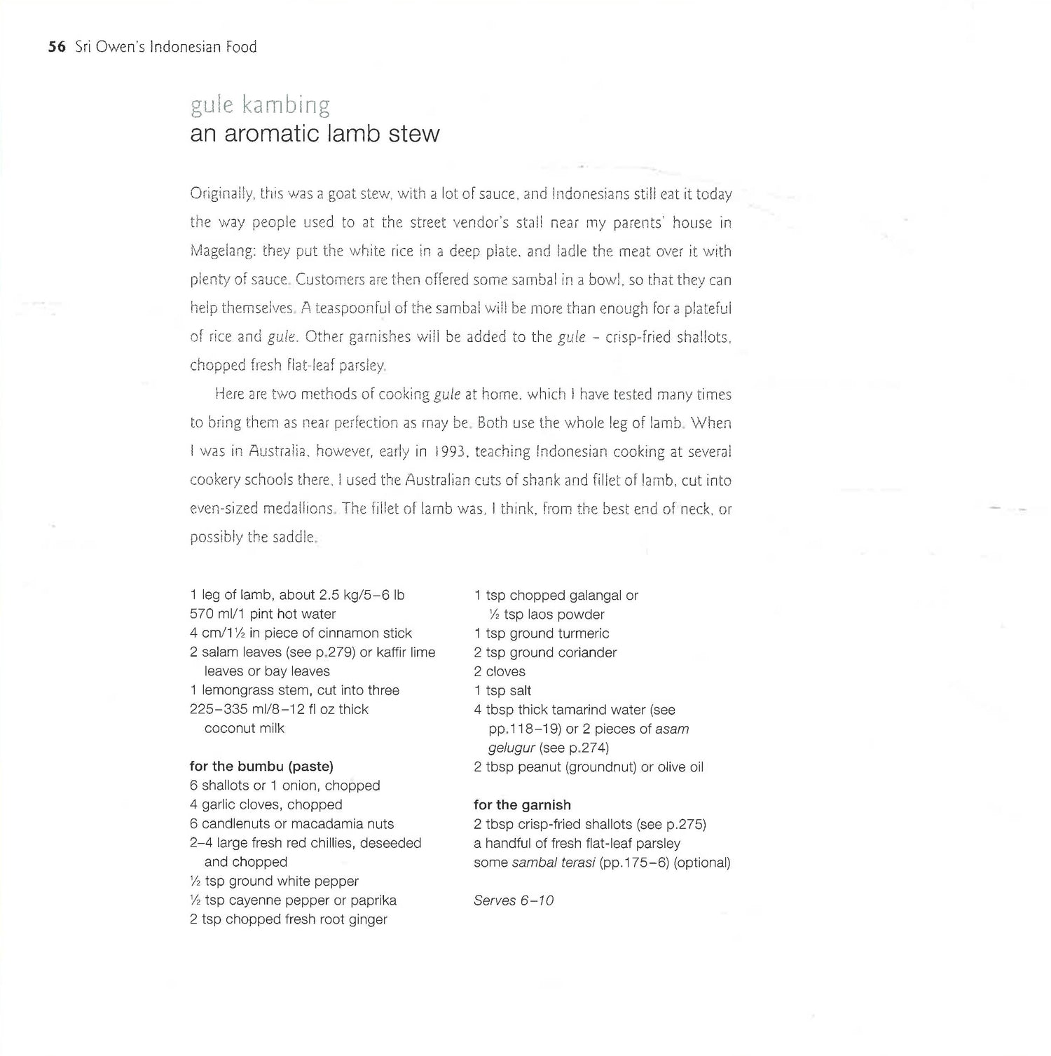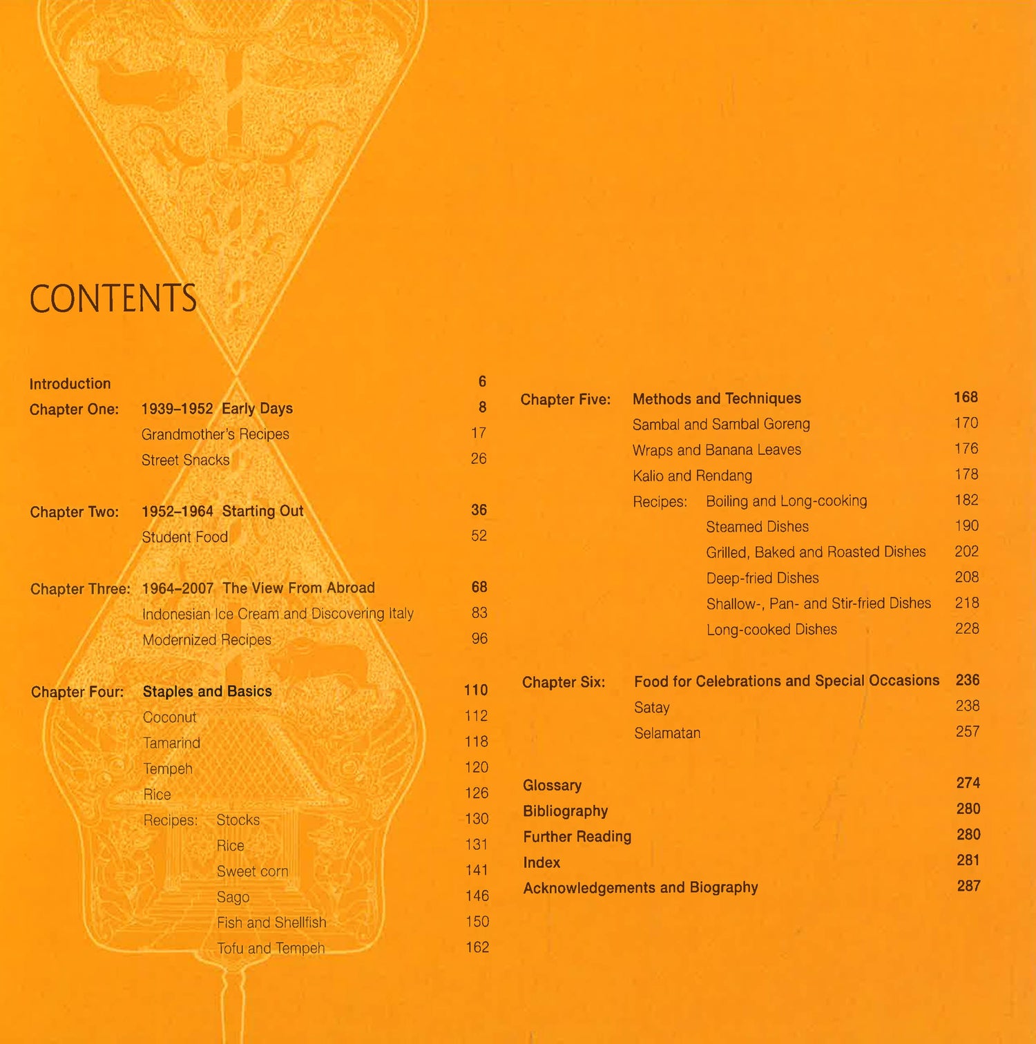 The book is split into two parts – in part one a series of introductory chapters examine the role of food in Sri's life, in Indonesian culture and society, with recipes to accompany. Part two explains the essential ingredients and techniques of Indonesian cookery, with notes on availability and substitutions and discussions of modern developments, again with the relevant recipes and variations to accompany each technique.