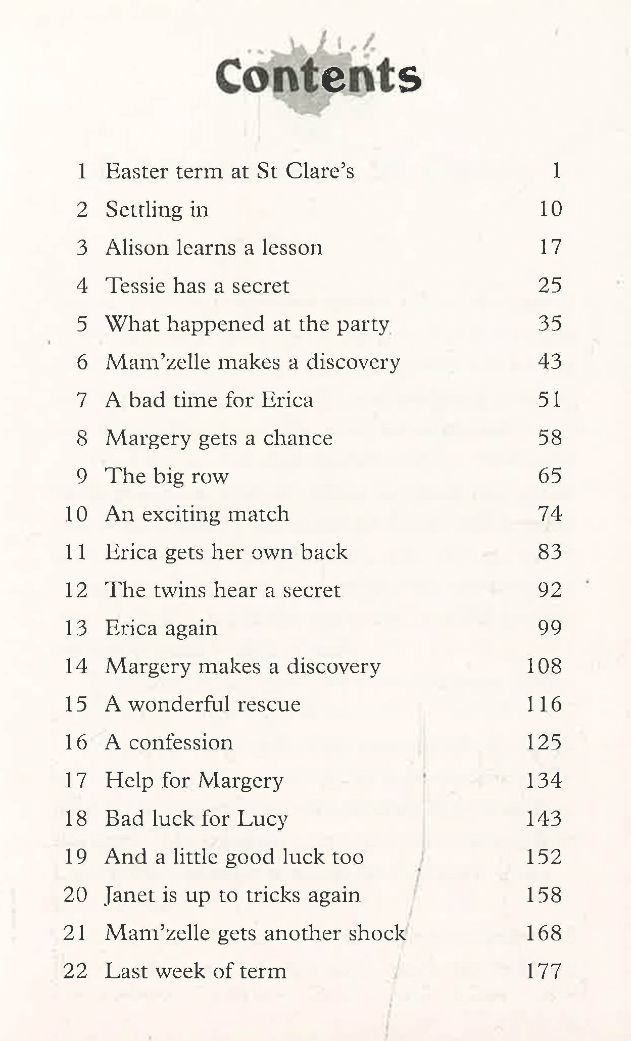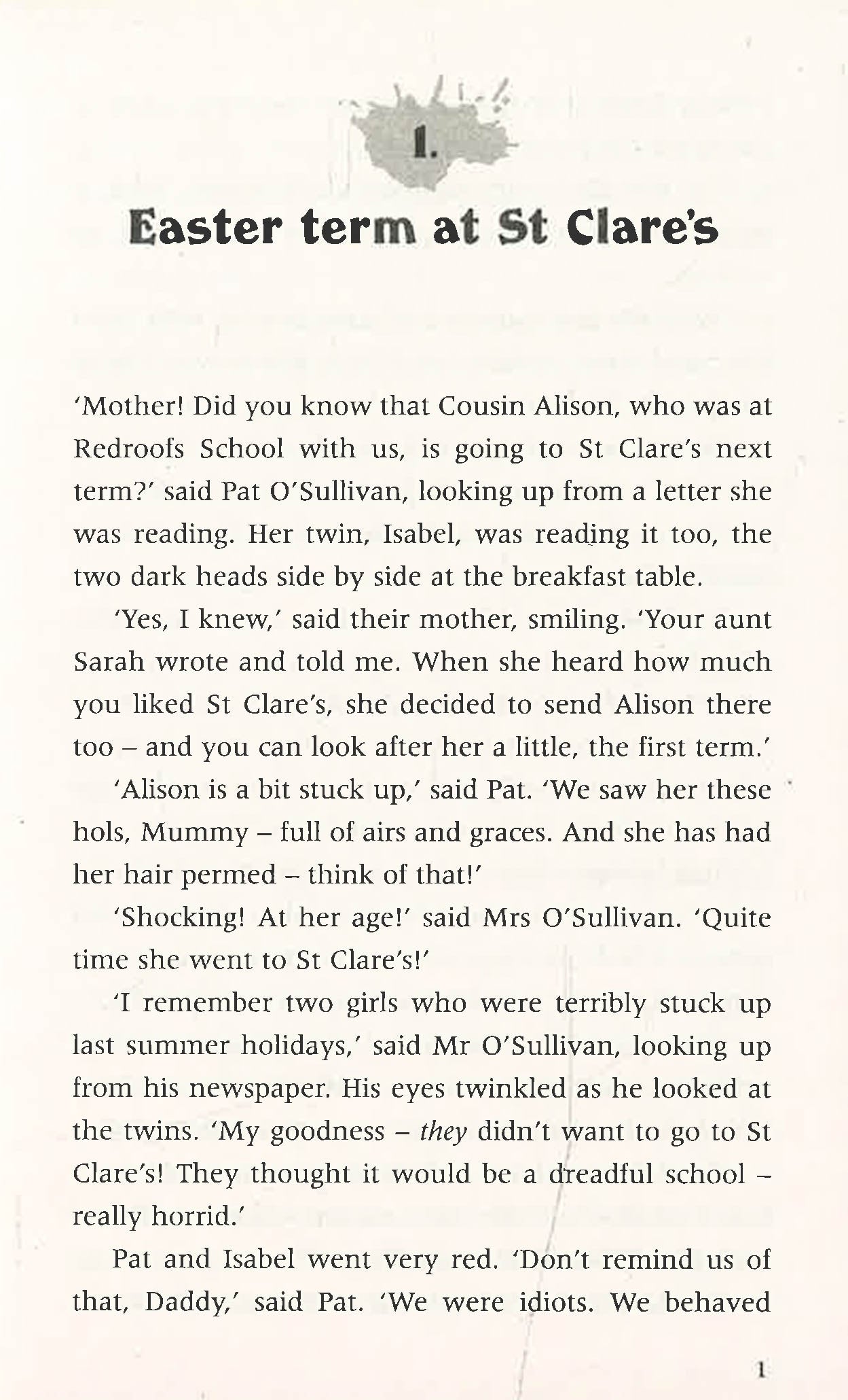 It's the start of the Easter Term and Pat and Isabel,the O'Sullivan twins, are looking forward to the excitement they know is in store for them. The new girls prove to be a source of much amusement and there is all the fun of boarding school life as well, especially the midnight feasts and playing tricks on the teachers.