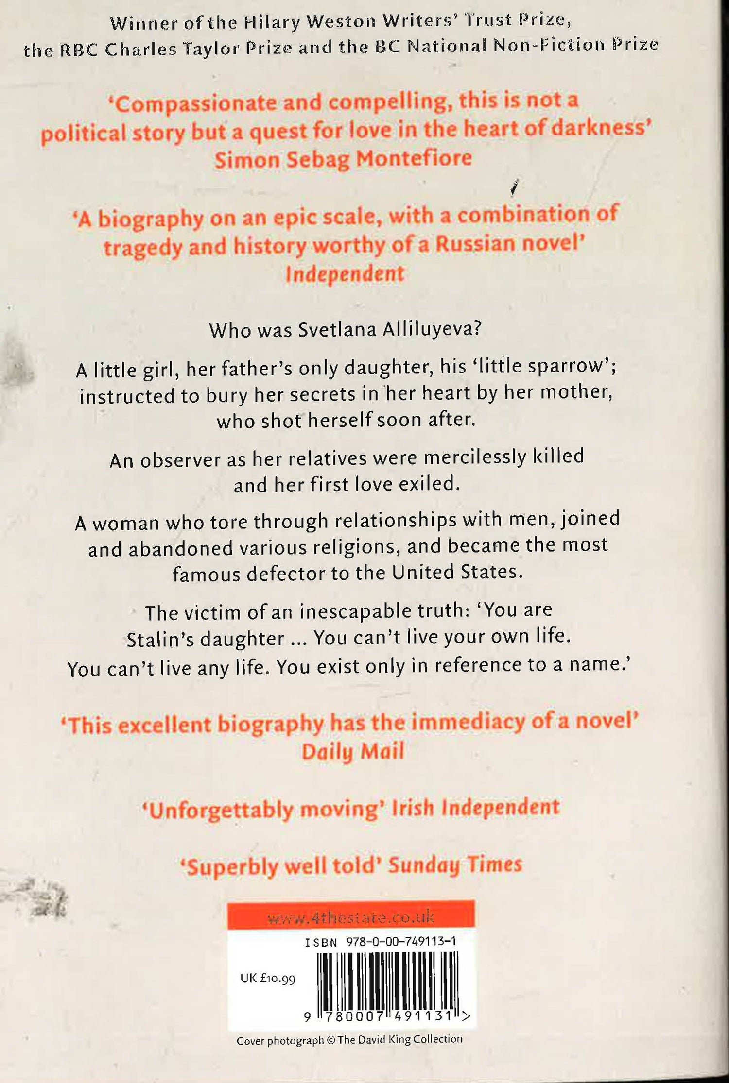 "Compassionate and compelling, this is not a political story but a quest for love in the heart of darkness" Simon Sebag Montefiore. "A biography on an epic scale, with a combination of tragedy and history worthy of a Russian novel" Independent "Superbly well told' Sunday Times Who was Svetlana Alliluyeva A little girl, her father's only daughter, his "little sparrow"; instructed to bury her secrets in her heart by her mother, who shot herself soon after. An observer as her relatives were mercilessly killed and her first love exiled. A woman who tore through relationships with men, joined and abandoned various religions, and became the most famous defector to the United States. The victim of an inescapable truth: "You are Stalin's daughter. . . . You can't live your own life. You can't live any life. You exist only in reference to a name."