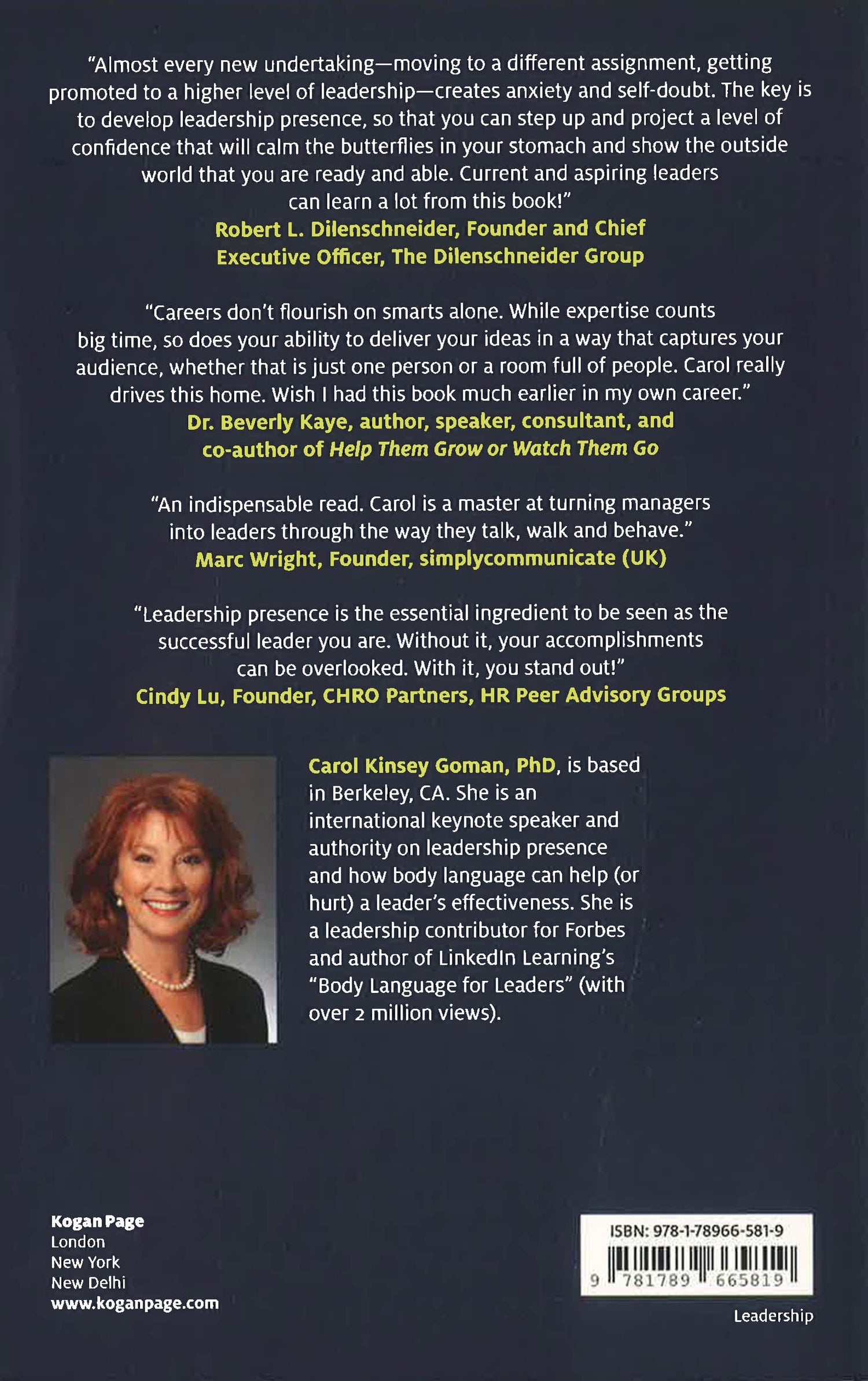WINNER: Independent Press Awards 2021 - Business: Motivational DISTINGUISHED FAVORITE: NYC Big Book Award 2021 - Leadership Leadership presence doesn't come with a title or promotion - good leaders develop presence over time. Leadership presence is how you show up and contribute to meetings, and whether or not you can project confidence and poise under pressure - do you already have a presence? Leadership presence is that elusive "we know it when we see it" quality. You may have a leadership title or tremendous leadership potential, but that alone does not give you presence. Being perceived as a leader when interacting with customers, peers or executives is the essence of leadership presence. Your leadership presence is evaluated by others based on how you show up and contribute in meetings, how well you project confidence and keep poise under pressure and whether you can engage others in ways that are authentic, empathetic and motivational. Stand Out walks you through achieving this presence so you get that next promotion and give your career that extra boost. Stand Out explains that the goal of leadership presence is to align other people's impression of you with your best authentic self. Body language expert and executive coach Carol Kinsey Goman teaches the five essential skills needed: composure, connection, confidence, credibility and charisma. She also explains how leadership presence is different for women, how nonverbal communication builds or destroys presence and why self-promotion is essential. This book shows aspiring and experienced leaders alike how to more positively influence the impression they make on others.