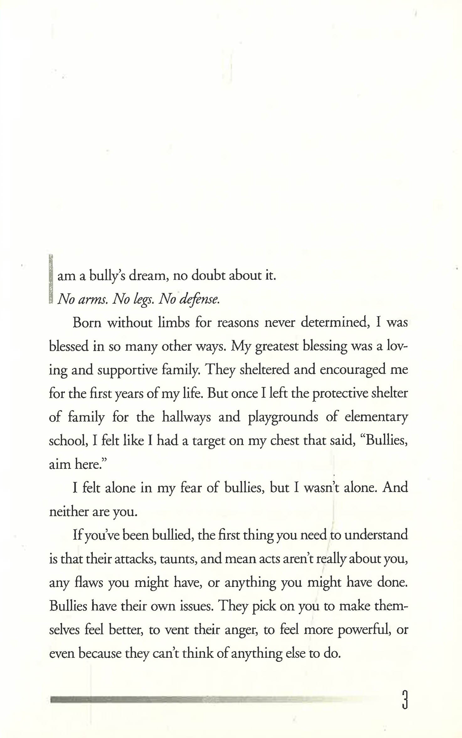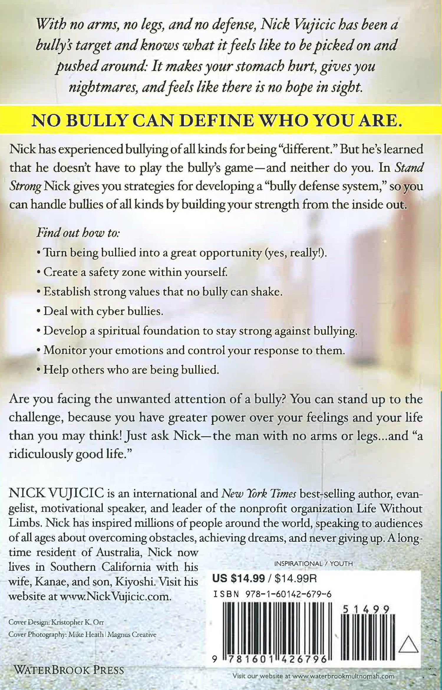 With no arms, no legs, and no defense, Nick Vujicic was once a bully's target and knows what it feels like to be picked on and pushed around: It makes your stomach hurt, gives you nightmares, and feels like there is no hope in sight. But Nick shows how you too can overcome and rise above bullying. No Bully Can Define Who You Are Nick has experienced bullying of all kinds for being "different." But he's learned that he doesn't have to play the bully's game-and neither do you. In Stand Strong Nick gives you strategies for developing a "bully defense system," so you can handle bullies of all kinds by building your strength from the inside out. Find out how to: * Turn being bullied into a great opportunity (yes, really!) * Create a safety zone within yourself * Establish strong values that no bully can shake * Deal with cyber bullies * Develop a spiritual foundation to stay strong against bullying * Monitor your emotions and control your response to them * Help others who are being bullied Are you facing the unwanted attention of a bully? You can stand up to the challenge, because you have greater power over your feelings and your life than you may think!