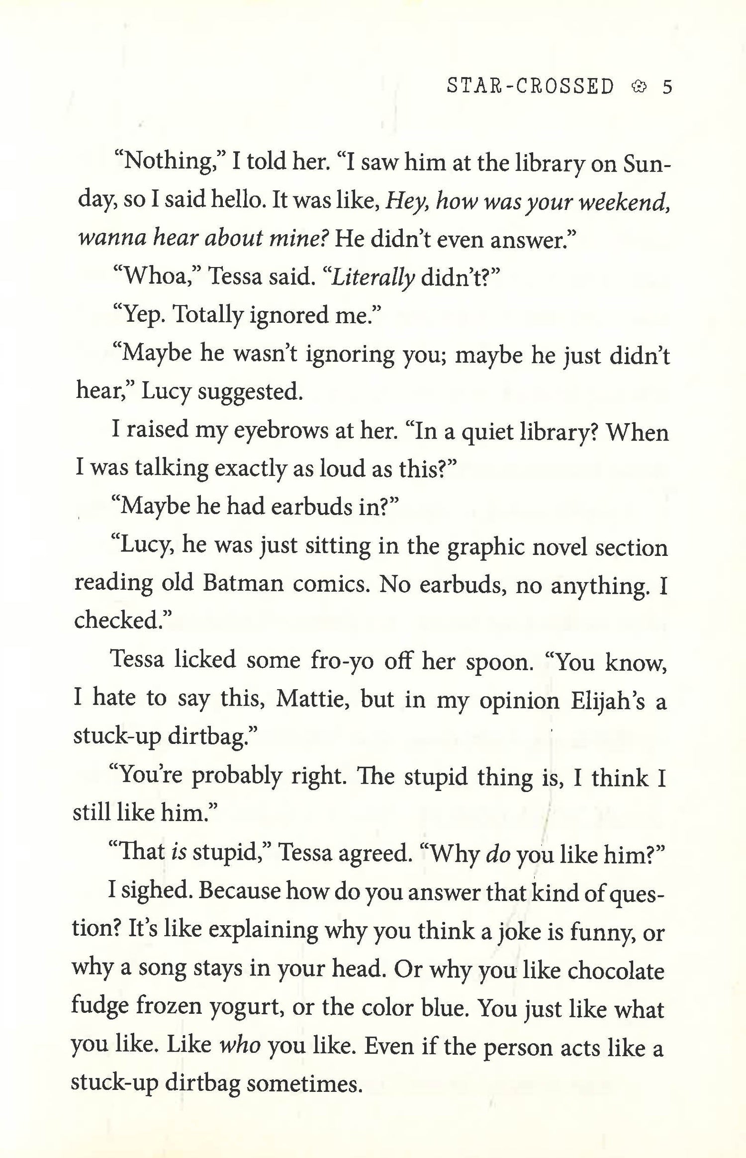 "Star-Crossed delighted me! Barbara Dee has a light touch and a pitch-perfect middle school voice. This book will have you laughing and groaning in sympathy with crush-addled Mattie and eagerly turning pages. Mattie and her classmates charmed me with their kindness, their humor, their uncertainty, their devotion to one another and to Shakespeare! Barbara masterfully sprinkles the bard's words over the narration and stirs the troubles of Romeo and Juliet into the plot. And those Shakespearian insults! Be sure to read Star-Crossed or you'll miss out." --Gail Carson Levine, author of Ella Enchanted Mattie is chosen to play Romeo opposite her crush in the eighth grade production of Shakespeare's most beloved play in this Romeo and Juliet inspired novel from the author of Truth or Dare. Mattie, a star student and passionate reader, is delighted when her English teacher announces the eighth grade will be staging Romeo and Juliet. And she is even more excited when, after a series of events, she finds herself playing Romeo, opposite Gemma Braithwaite's Juliet. Gemma, the new girl at school, is brilliant, pretty, outgoing--and, if all that wasn't enough: British. As the cast prepares for opening night, Mattie finds herself growing increasingly attracted to Gemma and confused, since, just days before, she had found herself crushing on a boy named Elijah. Is it possible to have a crush on both boys AND girls? If that wasn't enough to deal with, things backstage at the production are starting to rival any Shakespearean drama! In this sweet and funny look at the complicated nature of middle school romance, Mattie learns how to be the lead player in her own life. "Barbara Dee's Star-Crossed is a love story, a rallying cry for girl-power, and a Shakespeare lover's dream come true. When I finished reading, I had a huge smile on my face and a lightness in my heart." --Nora Raleigh Baskin, author of Nine, Ten: A September 11 Story "Star-Crossed takes the drama, humor, friendships, misunderstandings, and romance of Romeo and Juliet and transforms them perfectly to the middle school stage. One word about this honest, heartfelt middle grade novel for the theater geek in each of us? Encore!" --Donna Gephart, author of Lily and Dunkin "Star-Crossed by Barbara Dee cleverly draws from Romeo and Juliet, providing readers with an insightful introduction to Shakespeare while exploring the complexities of young love. Readers will root for this relationship." --Ami Polonksy, author of Gracefully Grayson *This book may have a remainder mark
