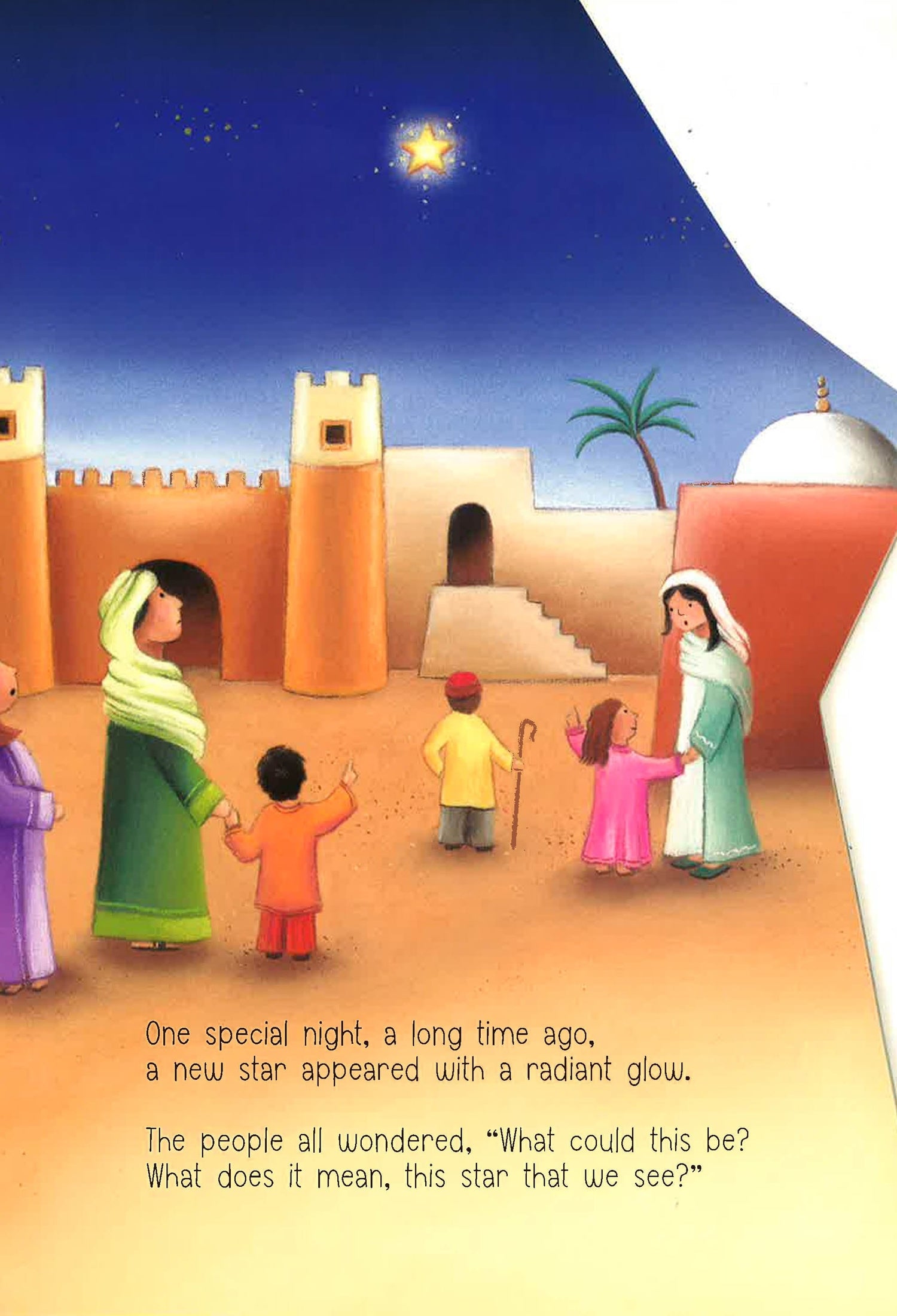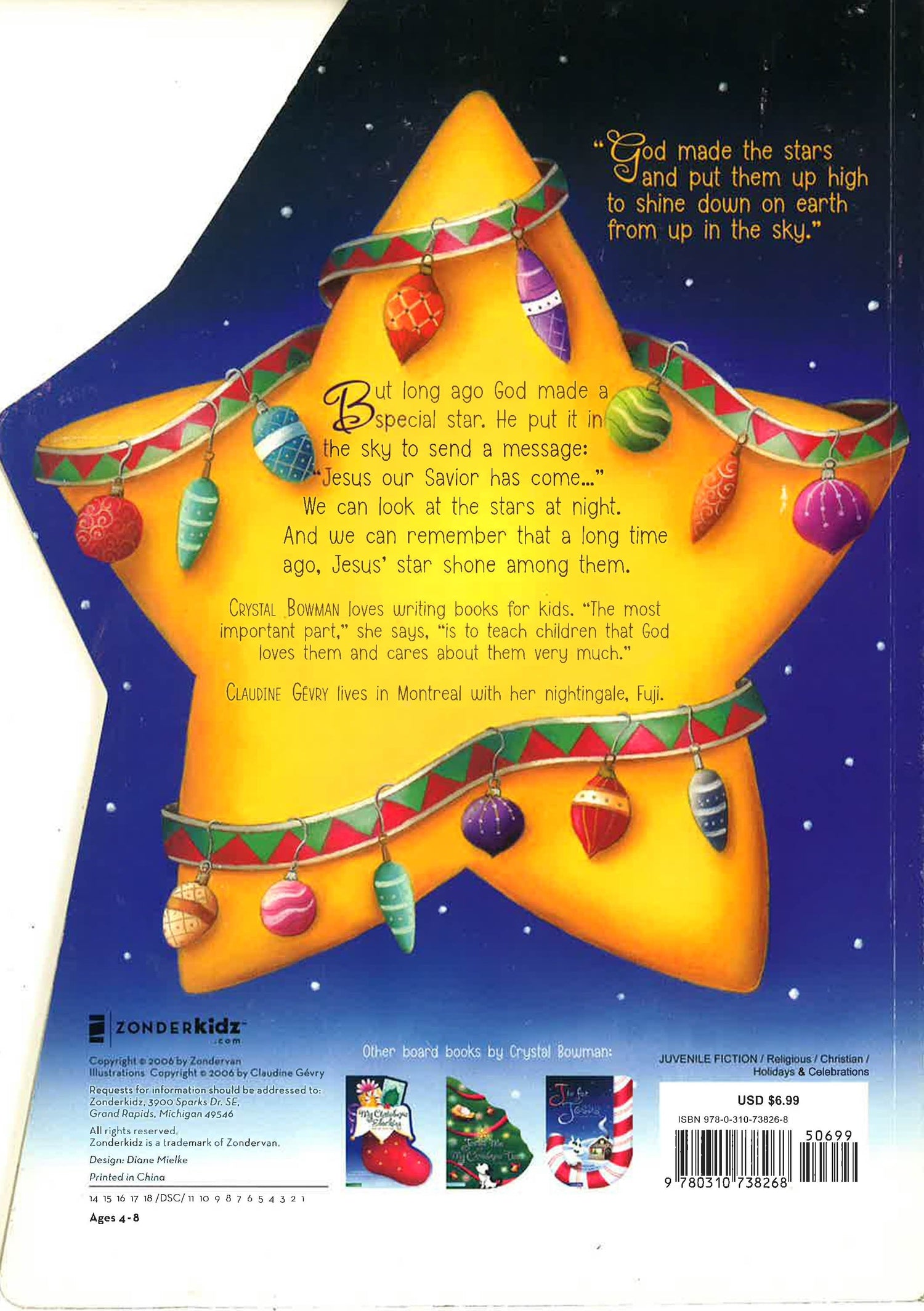 Beautiful illustrations and playful rhyming text bring the story of Jesus' birth alive for young children in A Star for Jesus. This board book, die-cut to enhance the shape of the star on the front cover, is a perfect gift to help little ones understand that "God made the stars and put them up high to shine down on earth from up in the sky." But long ago God made a special star. He put it in the sky to send a message: "Jesus our Savior has come ..."