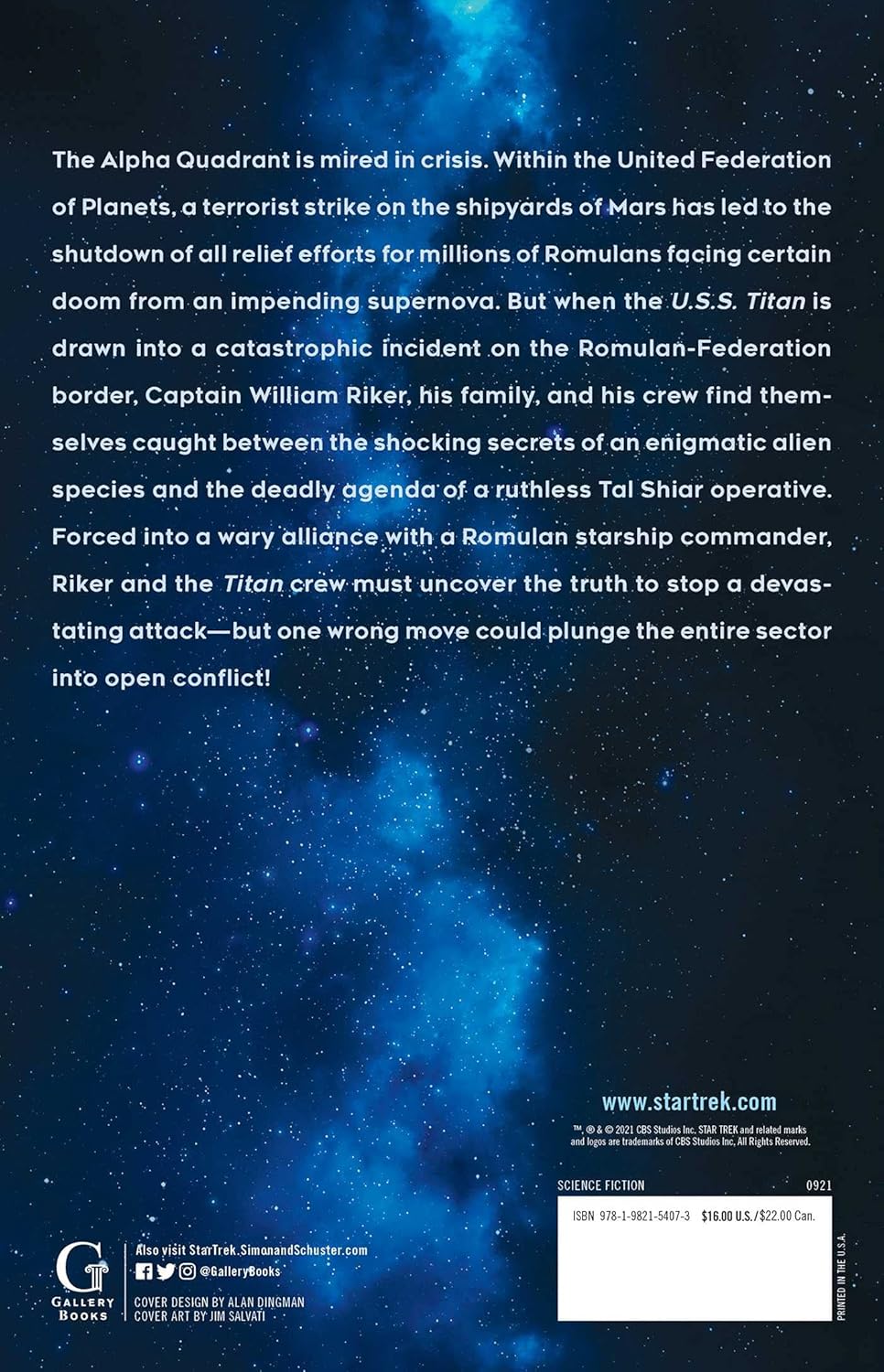 The thrilling untold adventure based on the acclaimed Star Trek: Picard TV series! The Alpha Quadrant is mired in crisis. Within the United Federation of Planets, a terrorist strike on the shipyards of Mars has led to the shutdown of all relief efforts for millions of Romulans facing certain doom from an impending supernova. But when the USS Titan is drawn into a catastrophic incident on the Romulan-Federation border, Captain William Riker, his family, and his crew find themselves caught between the shocking secrets of an enigmatic alien species and the deadly agenda of a ruthless Tal Shiar operative. Forced into a wary alliance with a Romulan starship commander, Riker and the Titan crew must uncover the truth to stop a devastating attack—but one wrong move could plunge the entire sector into open conflict!