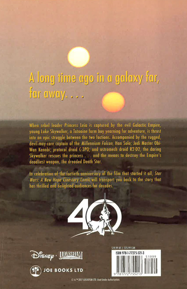 In celebration of the fortieth anniversary of the film that started it all, experience Star Wars: A New Hope in this captivating graphic novel companion to the original film. Featuring thrilling images from the movie, Star Wars: A New Hope Cinestory Comic will transport you back to the story that has thrilled and delighted audiences for decades