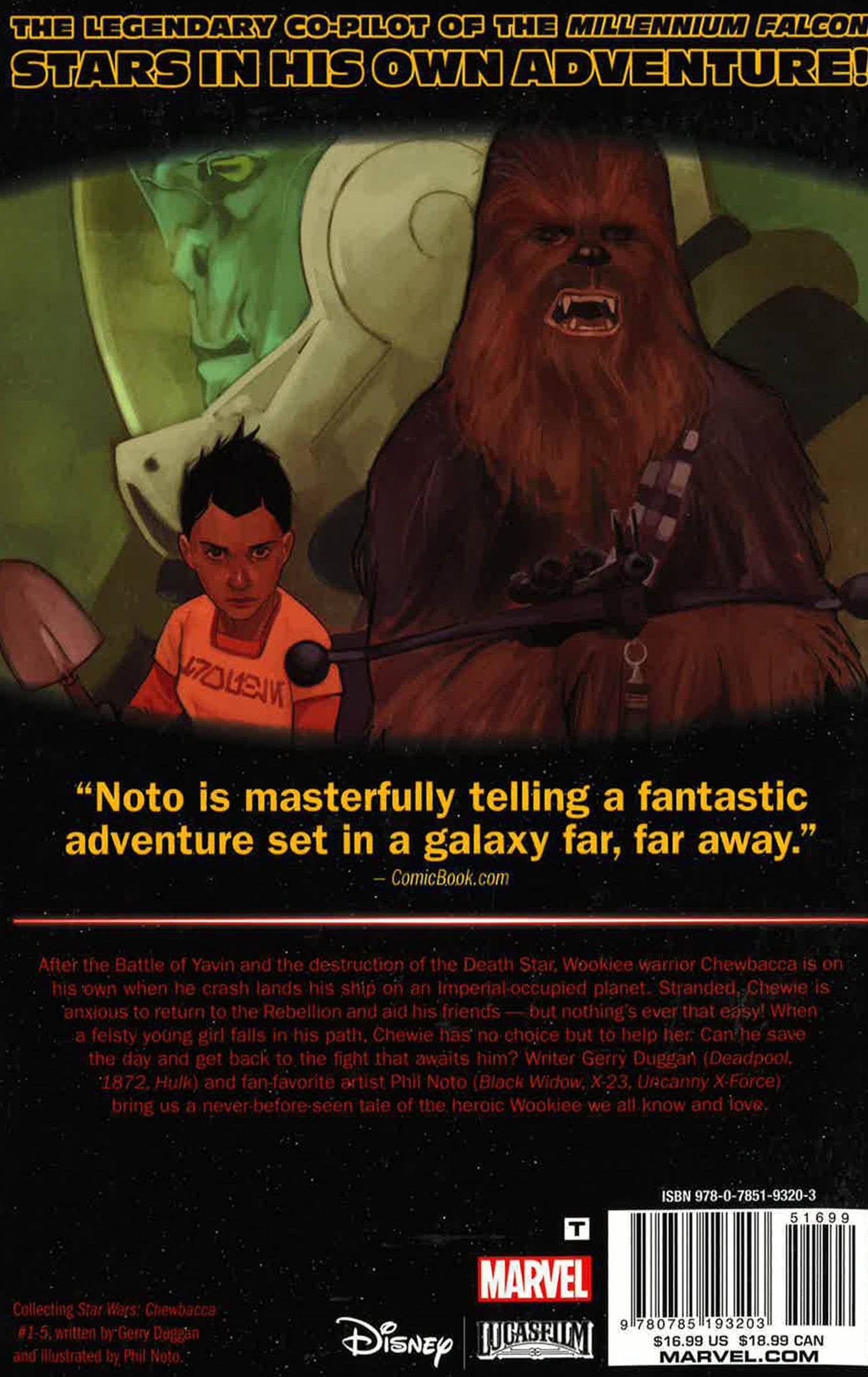 Known as the skilled co-pilot of the infamous Millennium Falcon, the legendary Wookiee warrior CHEWBACCA stars in his very own adventure! After the battle of Yavin, Chewbacca is on his own when he crash lands his ship on an Imperial occupied planet. Now stranded, Chewie finds himself caught in the middle of trying to return to the rebellion and helping a young and feisty girl in need. Writer Gerry Duggan (DEADPOOL, 1872, HULK) and artist Phil Noto (BLACK WIDOW, X-23, UNCANNY X-FORCE) bring us a never-before-seen tale of the heroic Wookiee we all know and love.